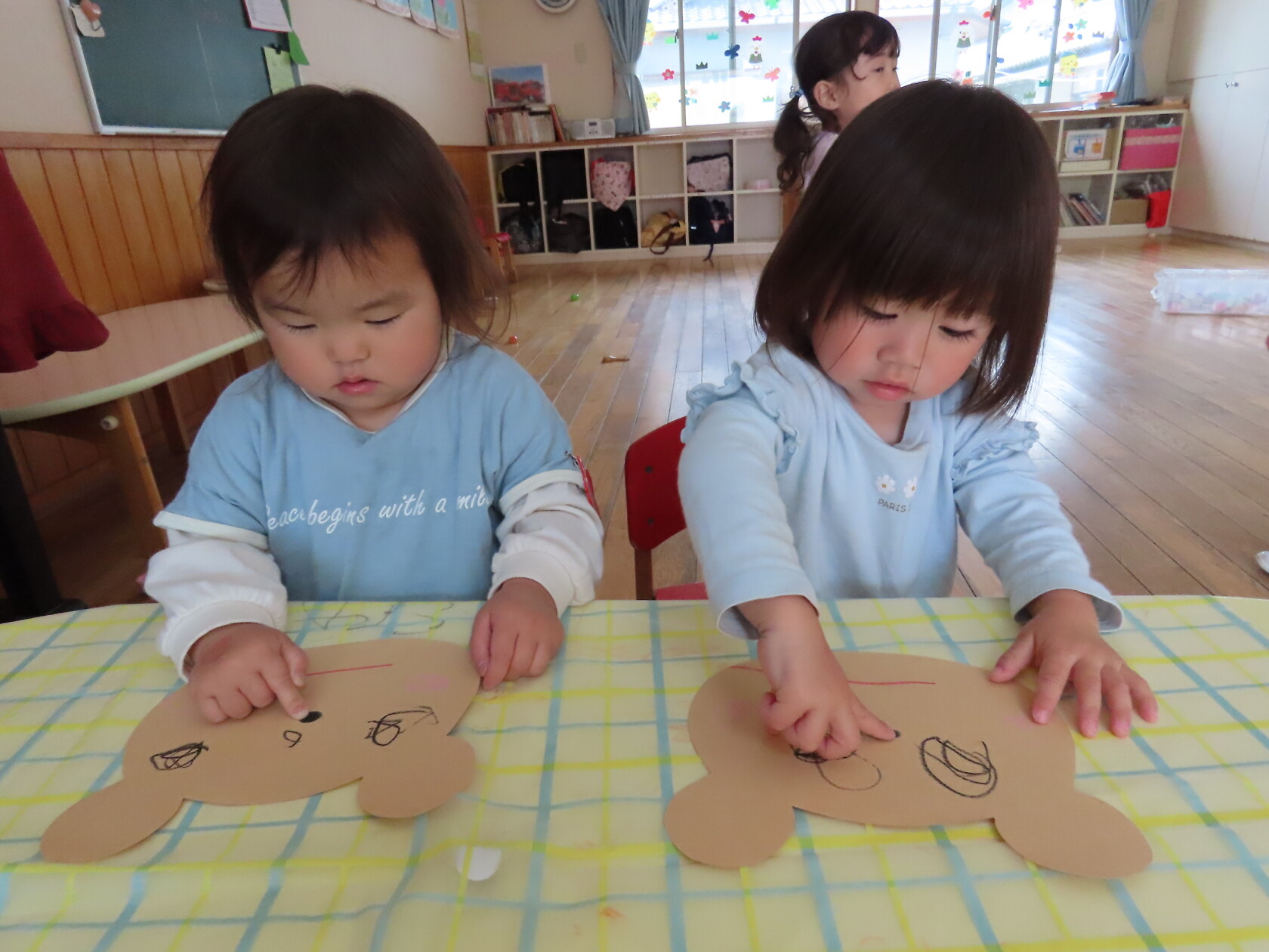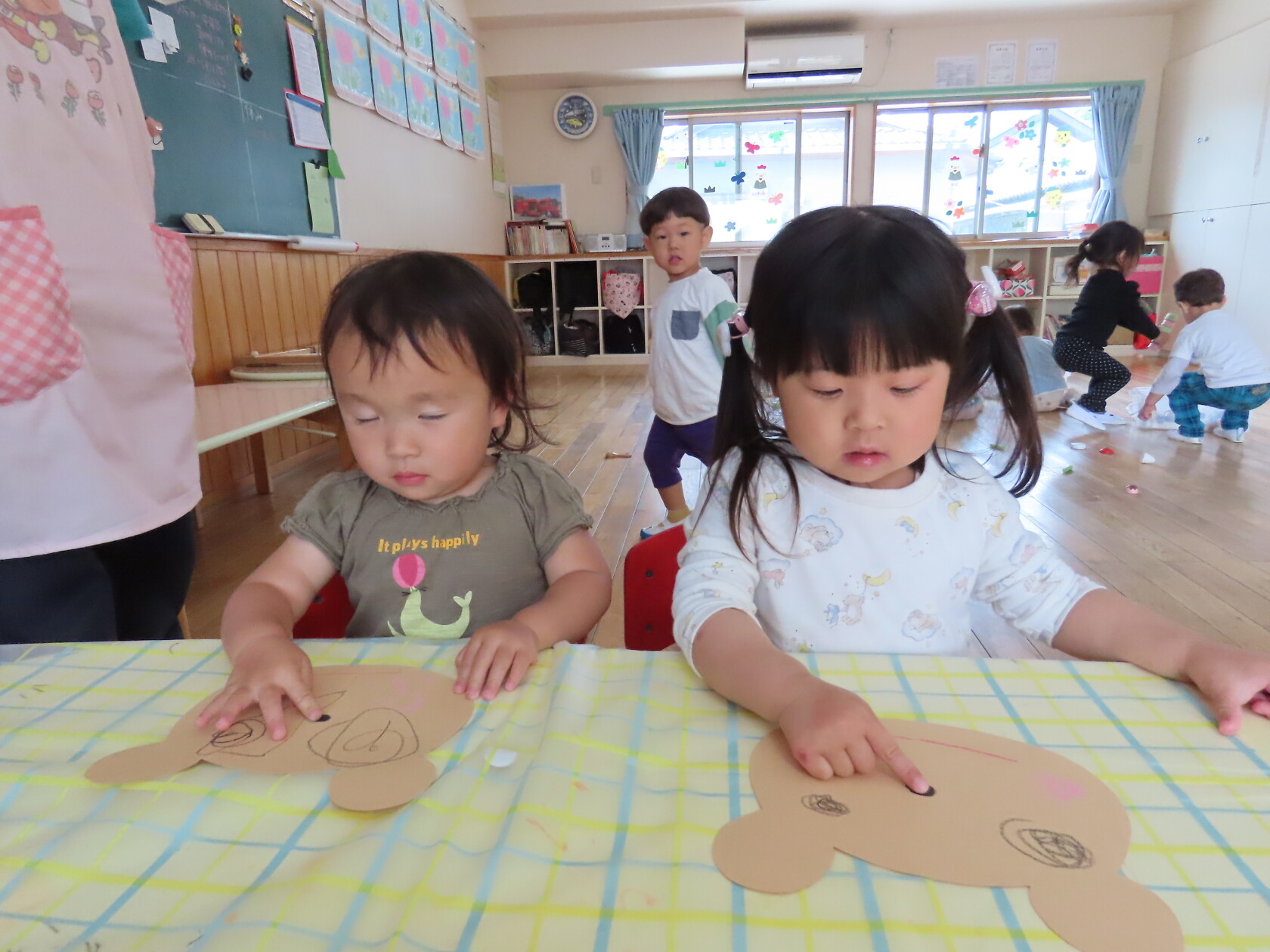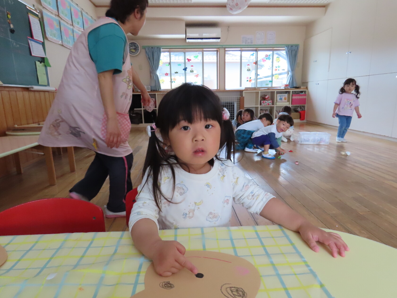 くまの顔に、目・ほっぺ・口をクレヨンで描いたり、鼻の部分は指スタンプを押しました🖍