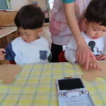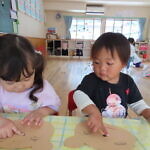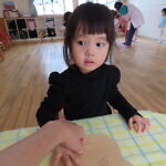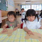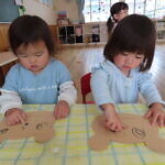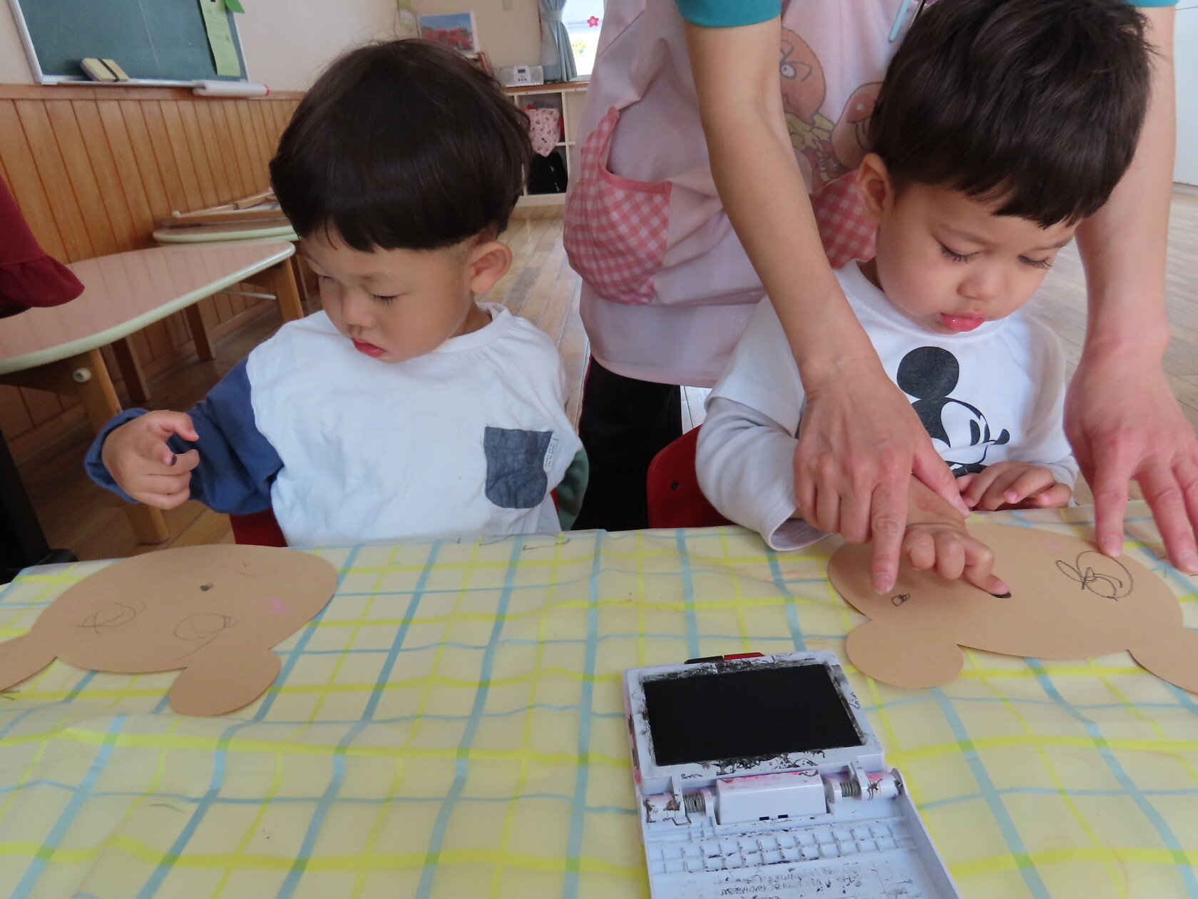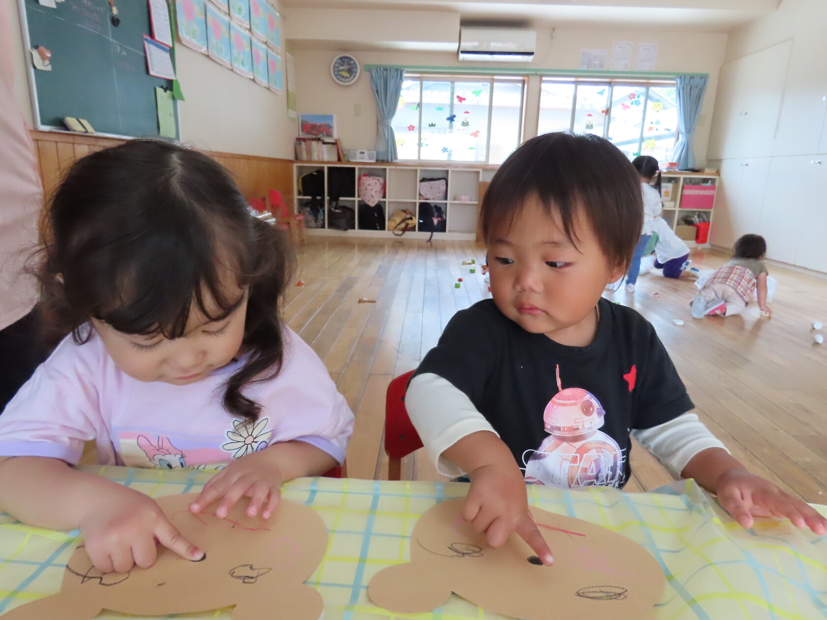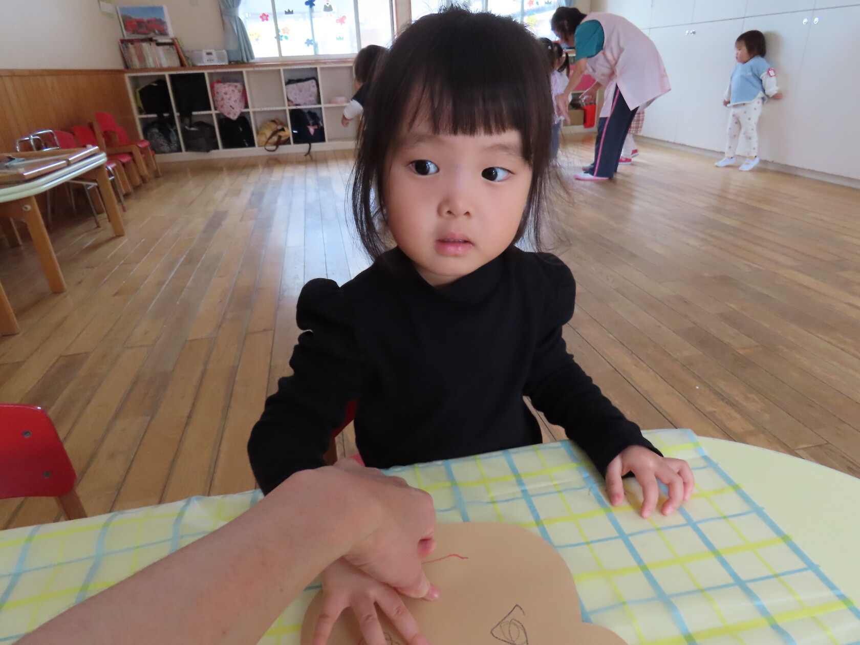 くまの顔に、目・ほっぺ・口をクレヨンで描いたり、鼻の部分は指スタンプを押しました🖍