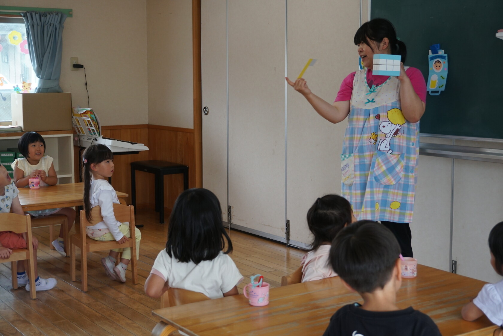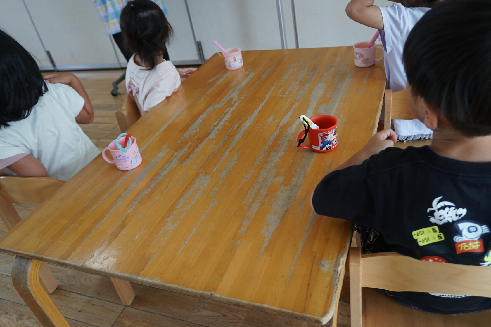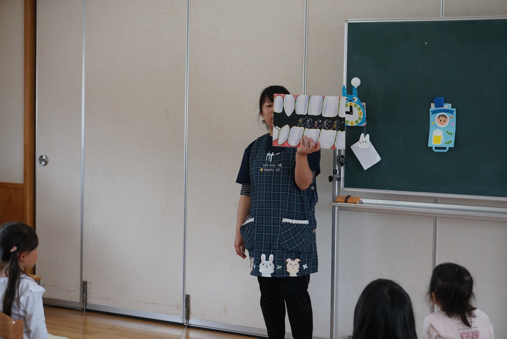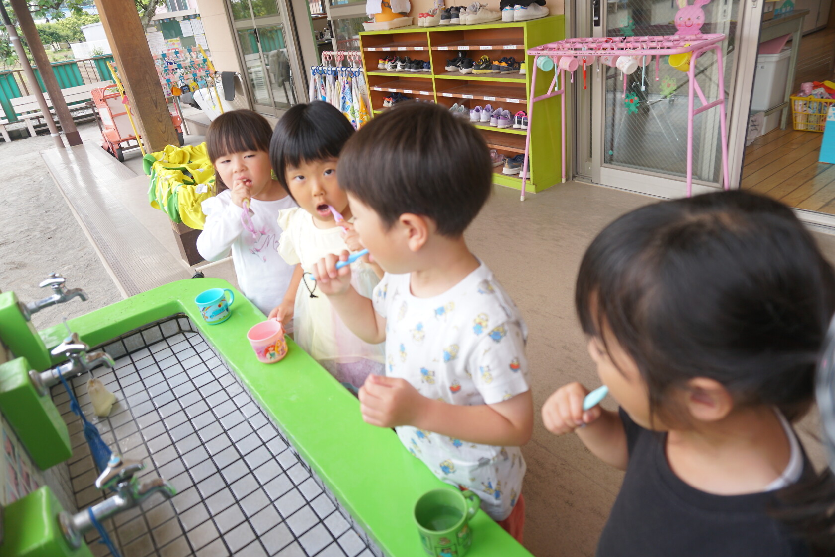 今日のできごと(ゆり) 公開済み: 2024年6月4日更新: 2024年6月4日 今日から歯と口の健康週間です。ゆり組さんは食後の歯磨きが始まります😊 最初に虫歯に関係する紙芝居を聞き、歯の磨き方や歯ブラシの片付け方の説明を真剣に聞きました🌟 食後に自分のお気に入りの歯ブラシとコップを使い丁寧に歯磨きをしました。 お家でも虫歯のないきれいな歯になれるように丁寧な歯磨きを心掛けましょう💕