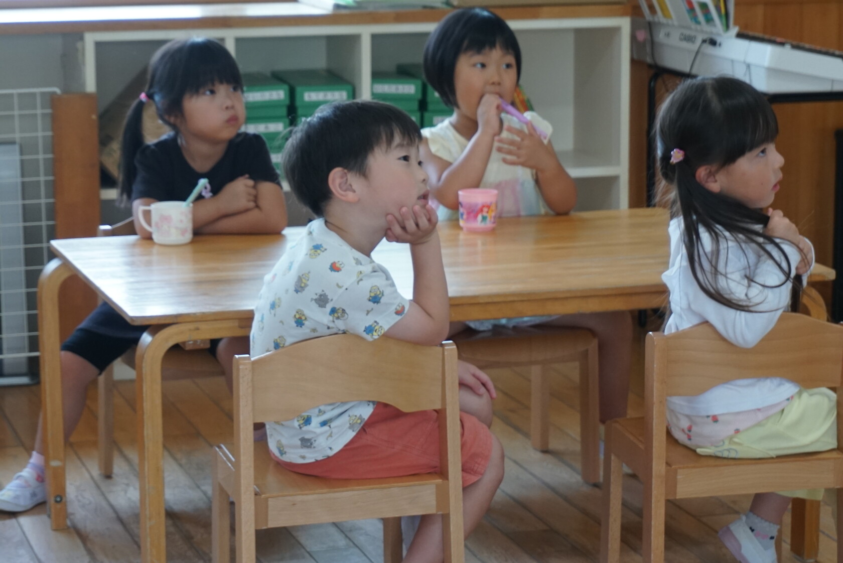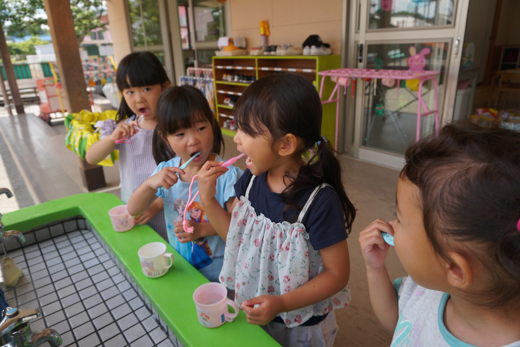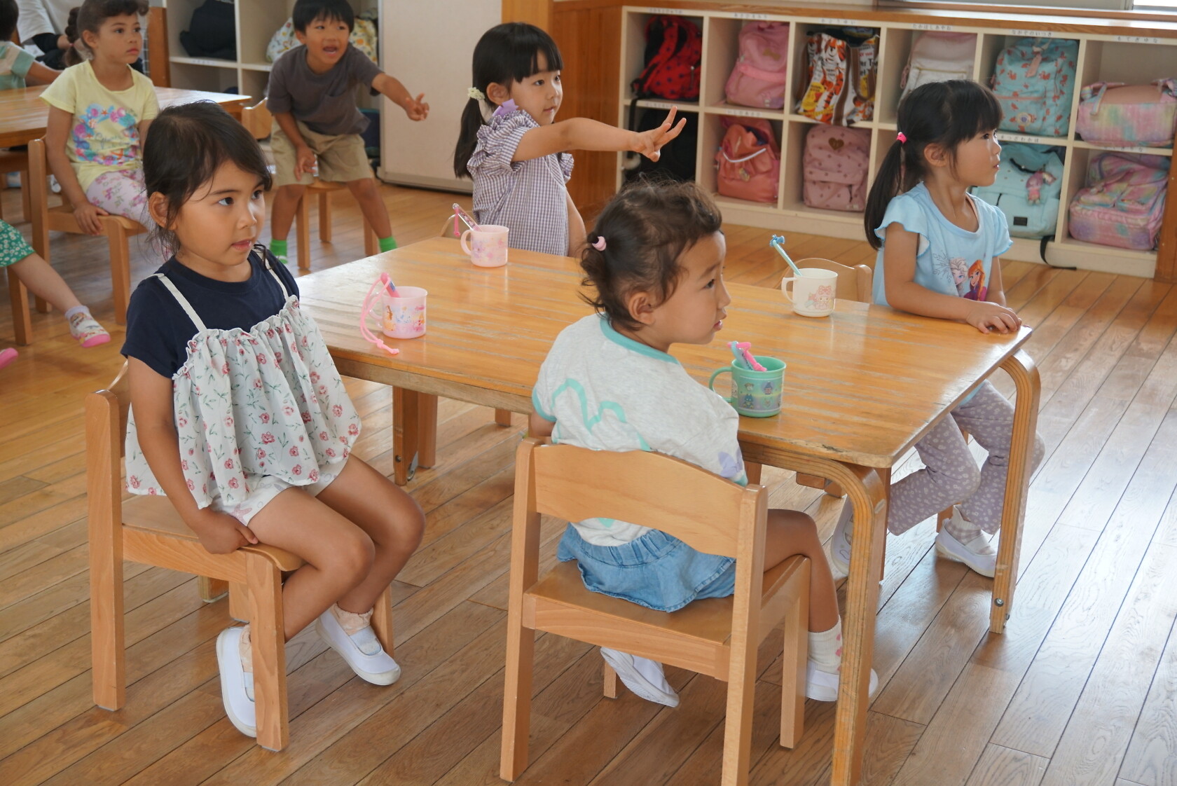 今日のできごと(ゆり) 公開済み: 2024年6月4日更新: 2024年6月4日 今日から歯と口の健康週間です。ゆり組さんは食後の歯磨きが始まります😊 最初に虫歯に関係する紙芝居を聞き、歯の磨き方や歯ブラシの片付け方の説明を真剣に聞きました🌟 食後に自分のお気に入りの歯ブラシとコップを使い丁寧に歯磨きをしました。 お家でも虫歯のないきれいな歯になれるように丁寧な歯磨きを心掛けましょう💕