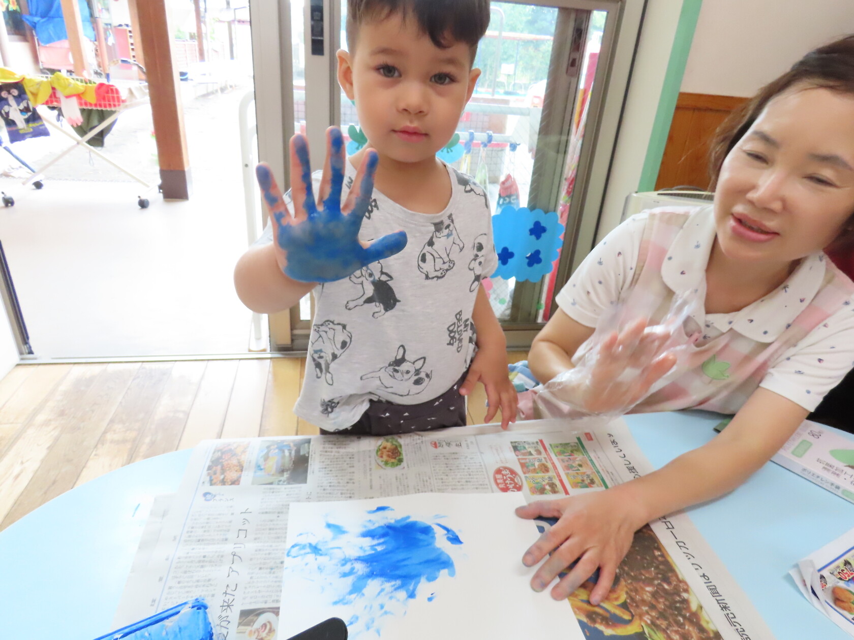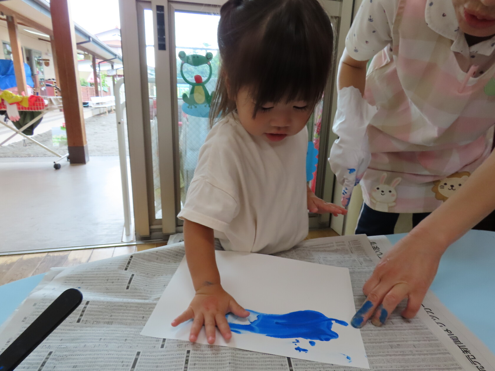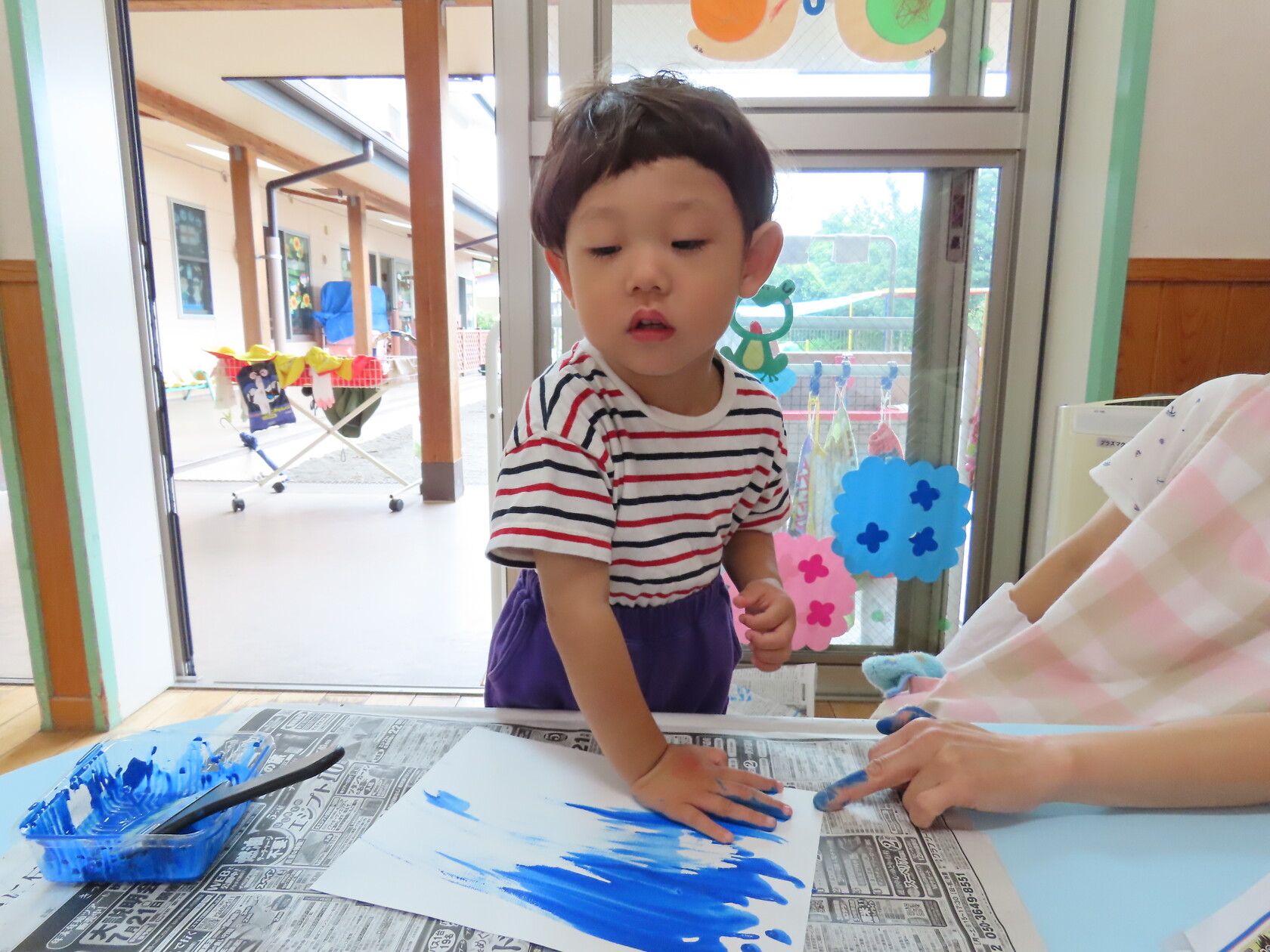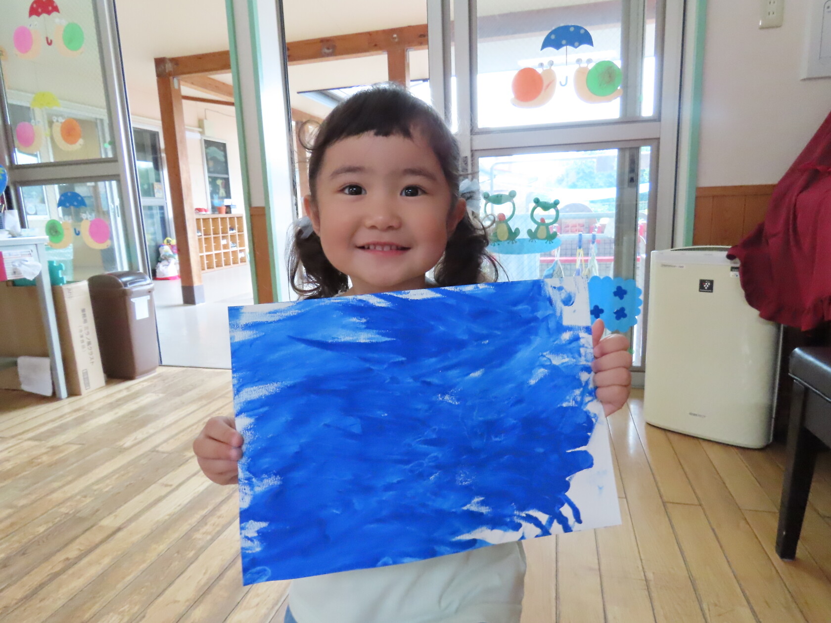 今日のできごと(ちゅうりっぷ) 公開済み: 2024年7月16日更新: 2024年7月16日 今日は曇り空で、いつもより過ごしやすい天気でした☁ 子ども達は元気いっぱい友達と楽しく過ごしました🎵 うちわの製作では、手にいっぱい絵の具をつけ、自由に画用紙に色を塗りました😊 どんなうちわができるかな⁉ 楽しみですね🎼