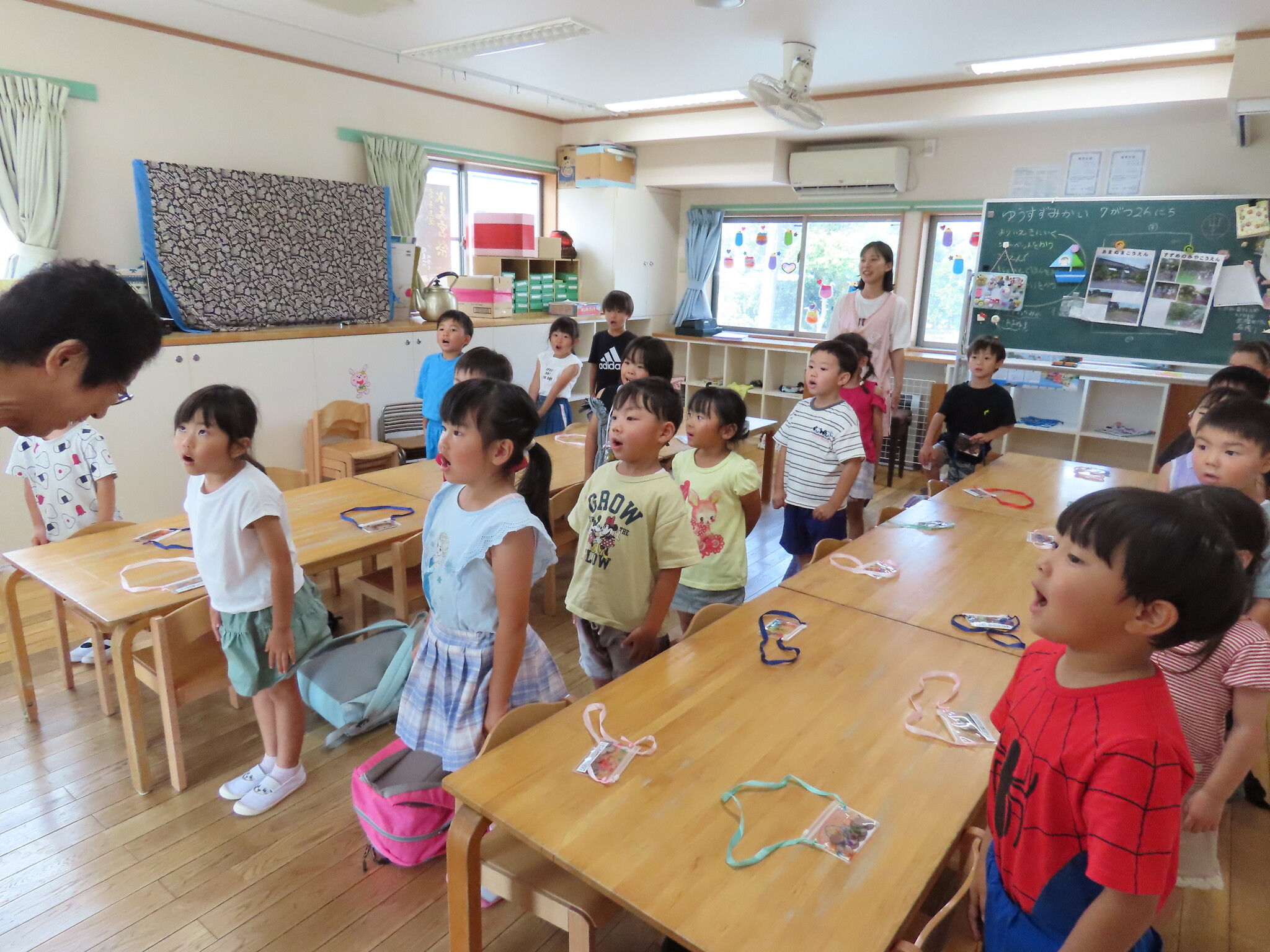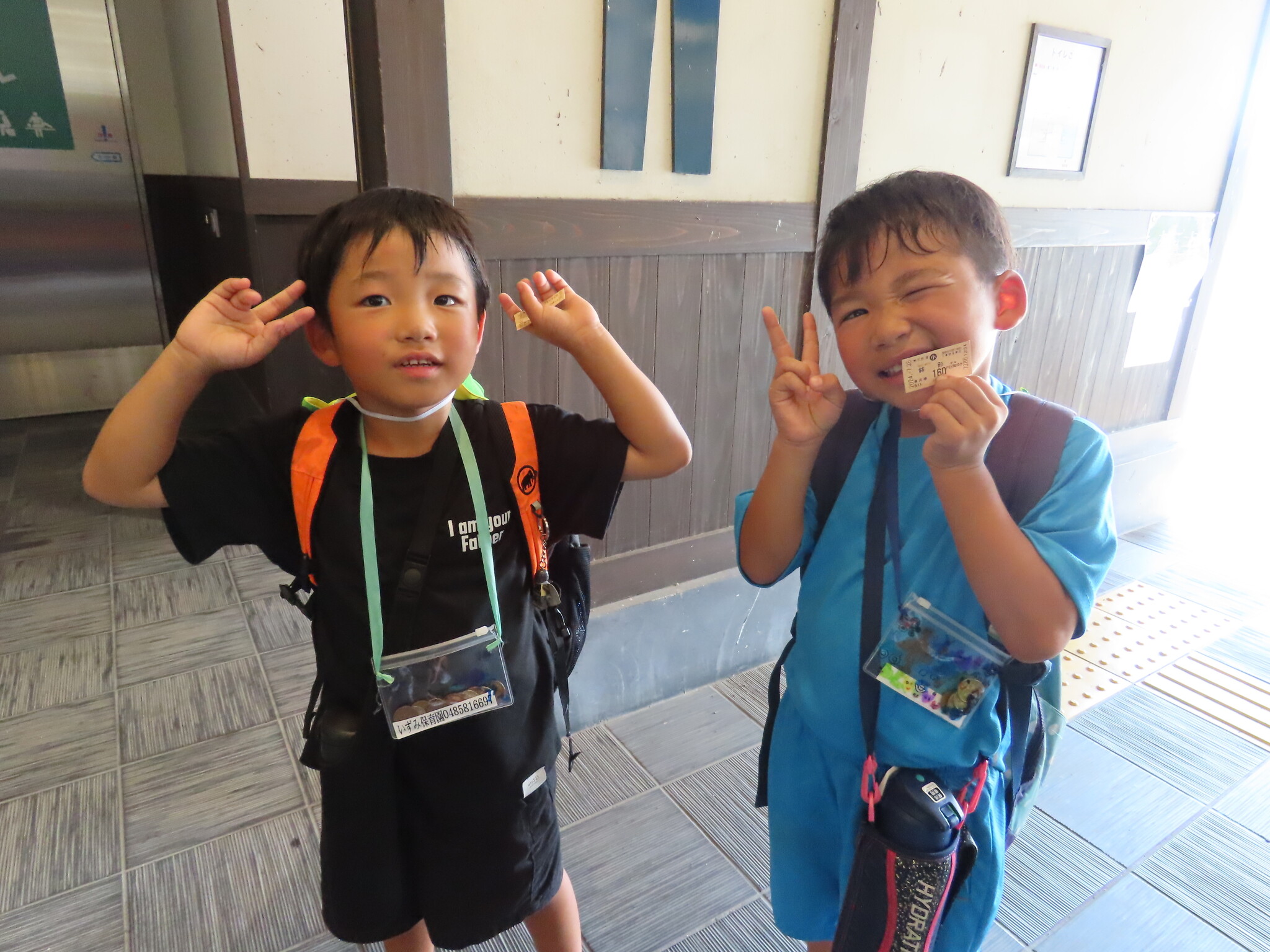 夕涼み会① 公開済み: 2024年7月26日更新: 2024年7月26日 今日は夕涼み会でした!! この日までなにをやりたいいか1から相談し、行くところ、やることを決めました! 午前中には持ち物のチェック、行くところ、やること、雨具の着方の練習をしました!😊 雨が降らないことを祈って写真を撮りました! お昼を食べた後は待ちに待った夕涼み会!! みんな早く早くとワクワクしていました😁 駅までは歩き、チケットを買うのもスムーズにできました!! ②に続く
