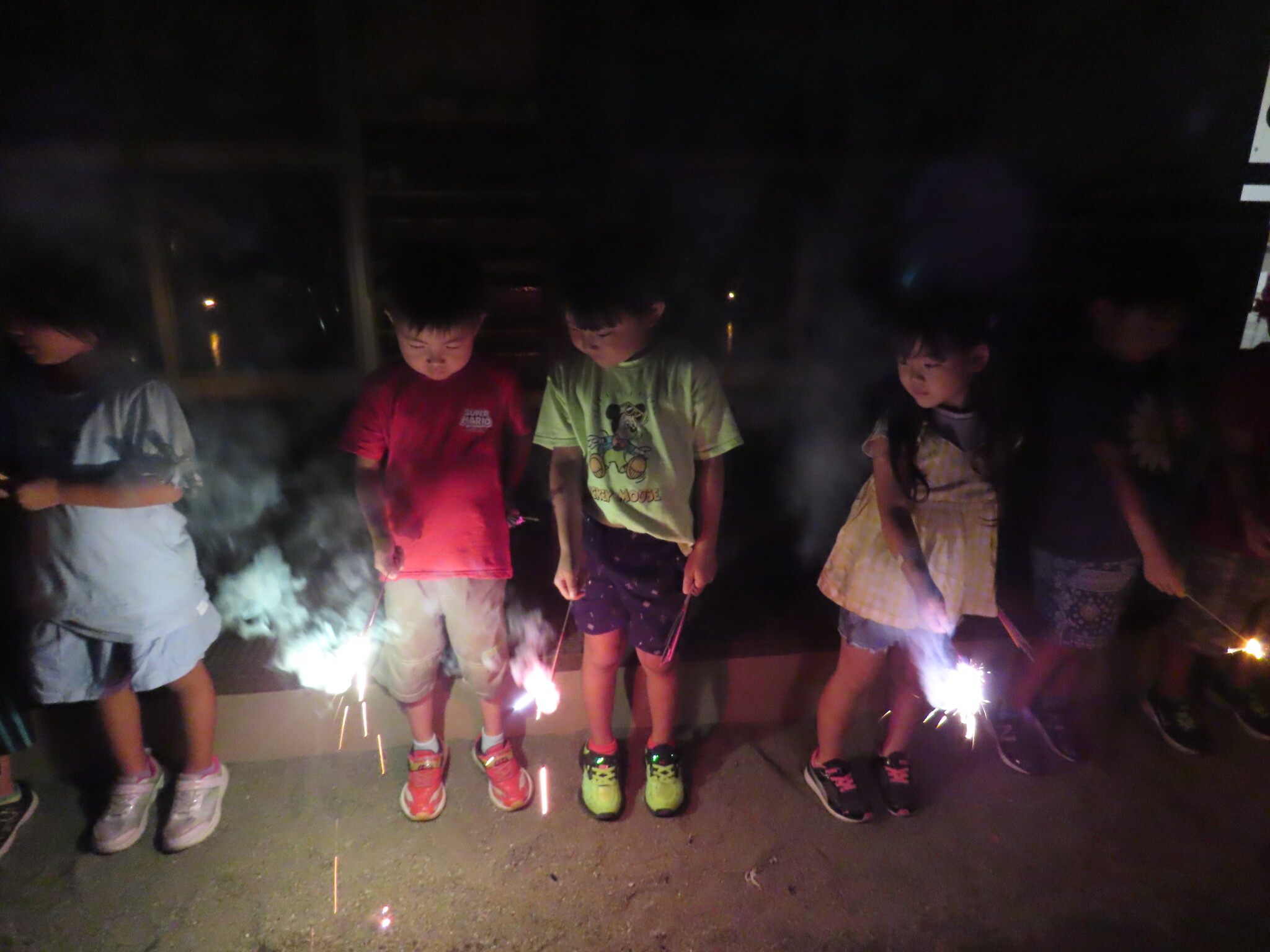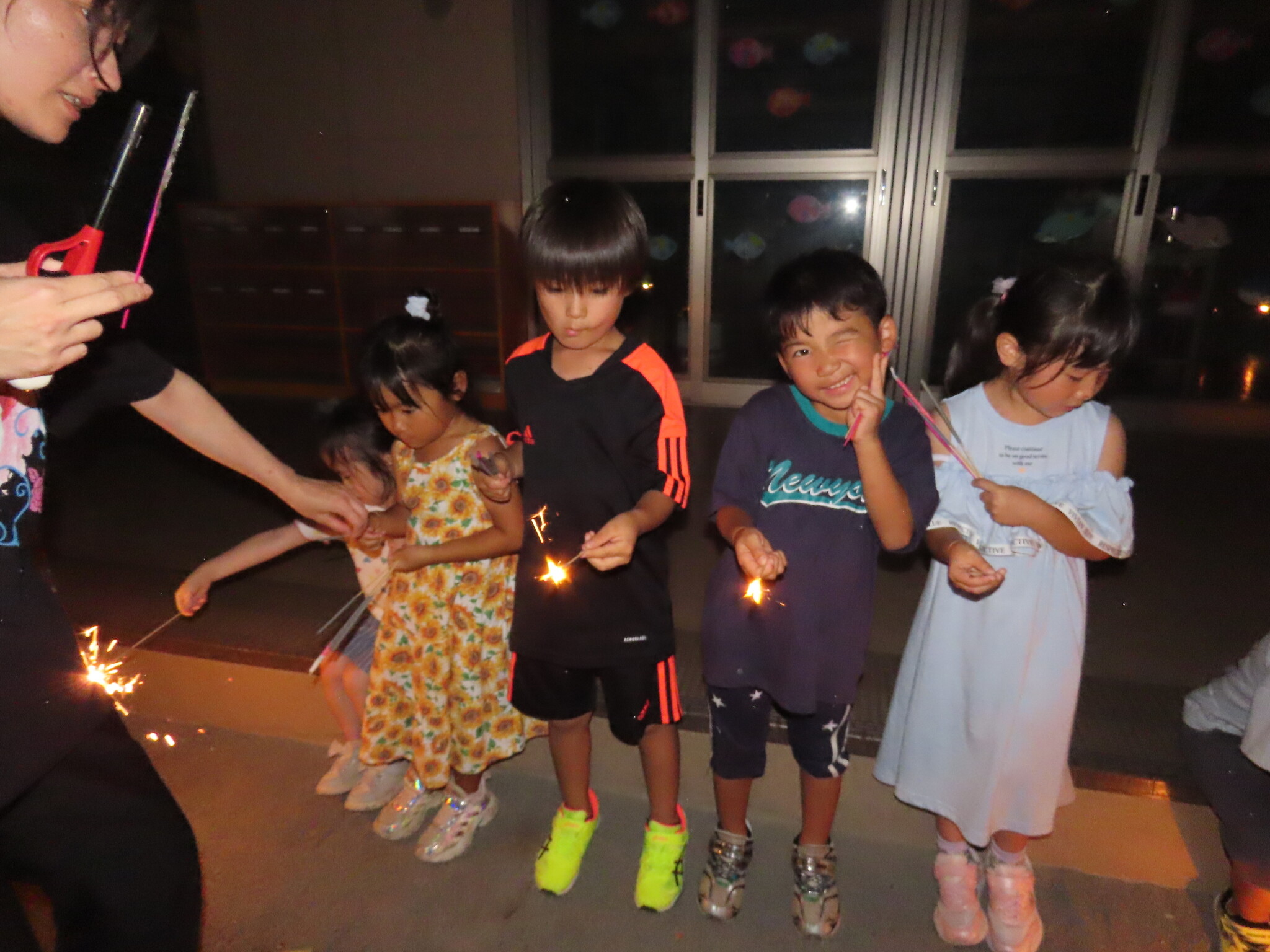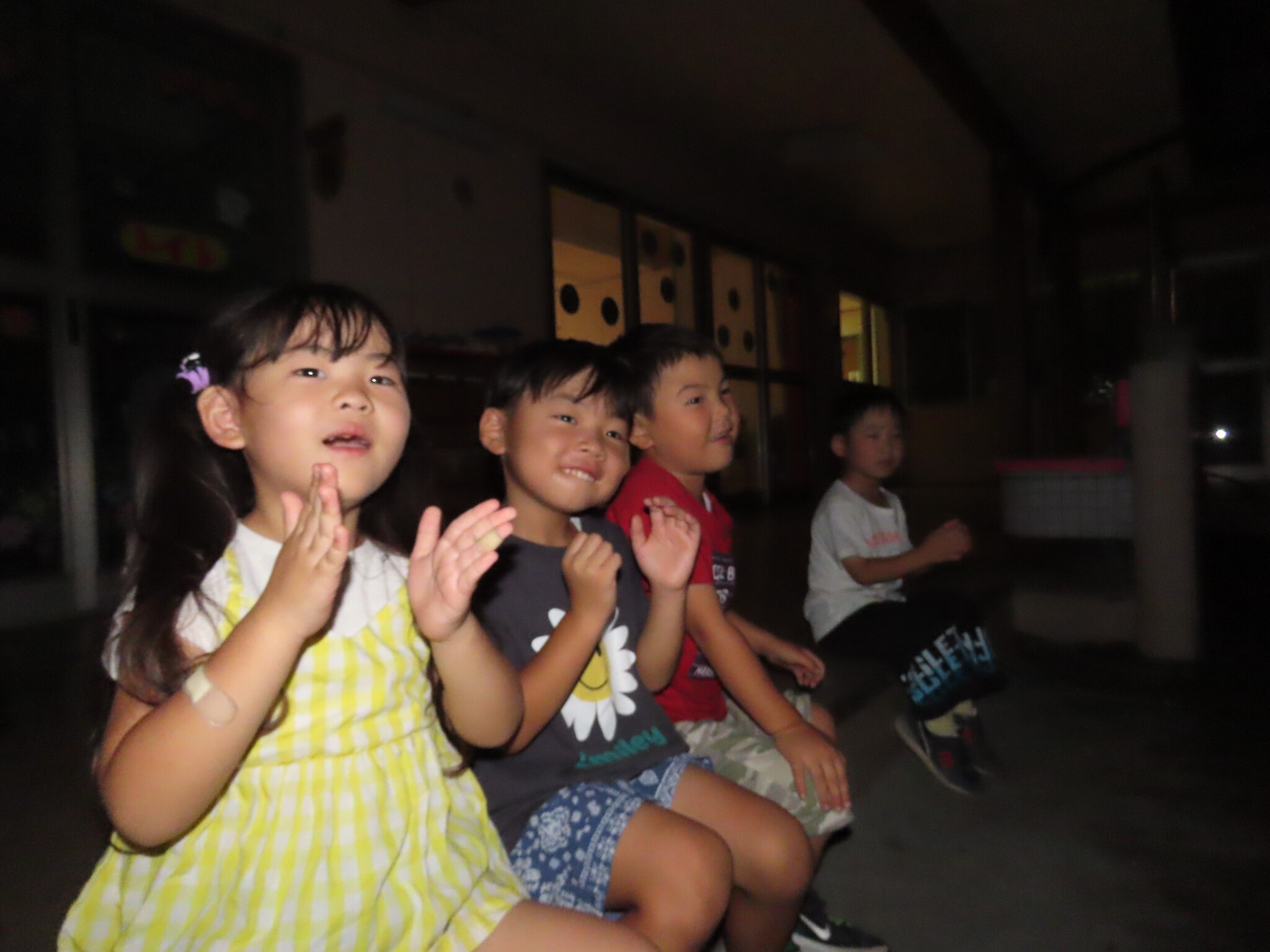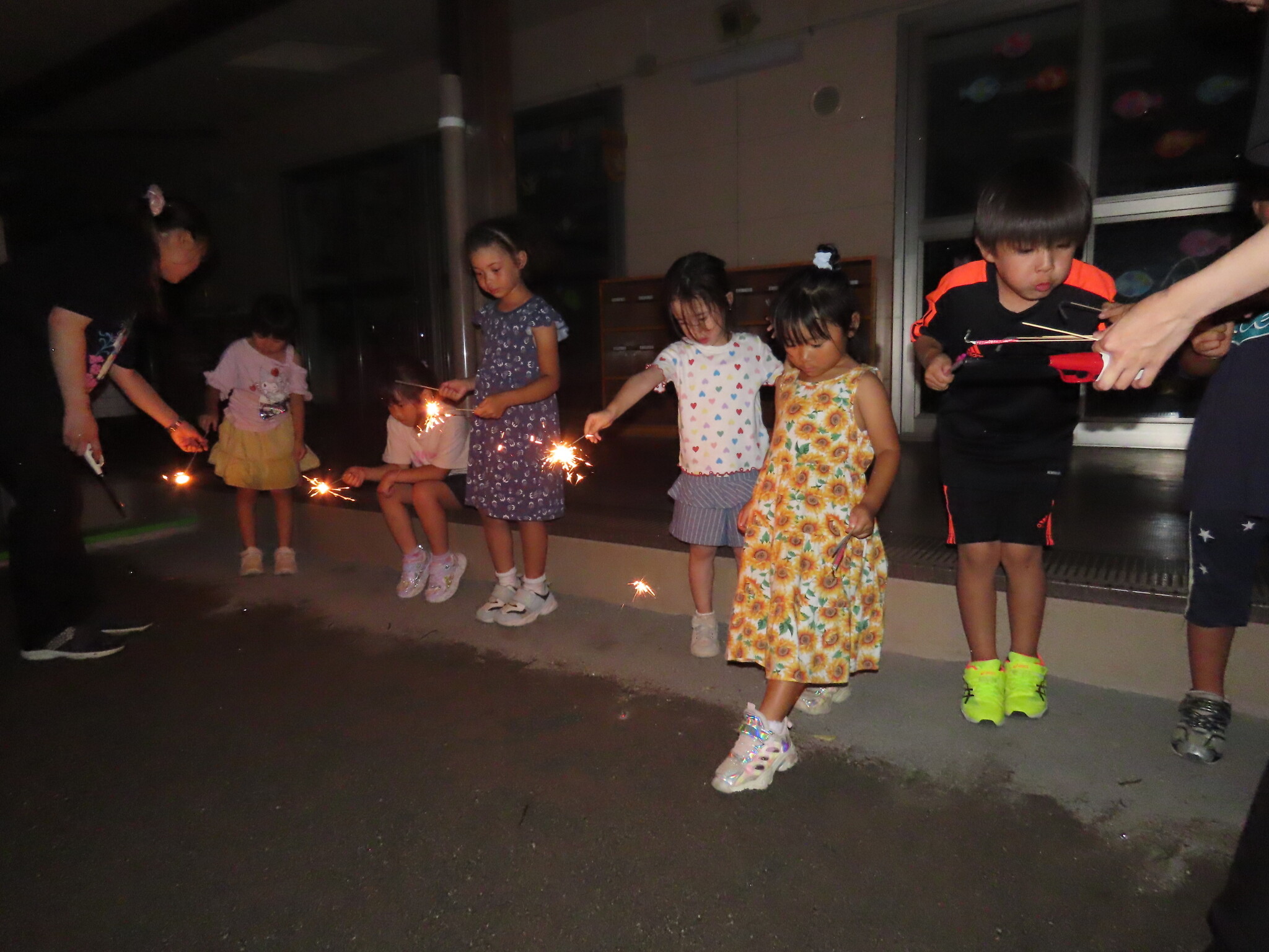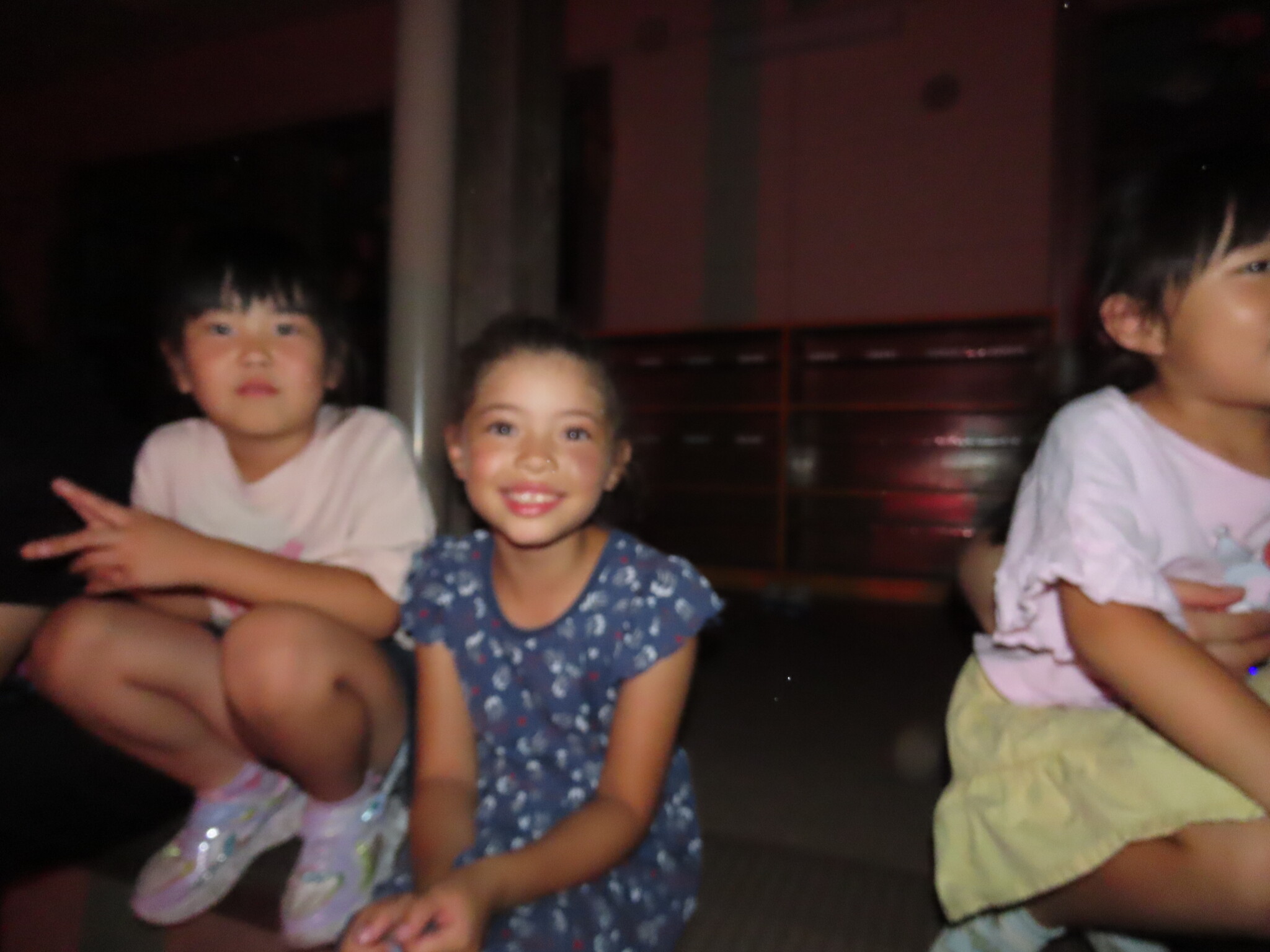 夕涼み会④ 公開済み: 2024年7月26日更新: 2024年7月26日 保育園に帰ってきた後は夕ご飯をたべました!! みんなが買ってきた食材はカレー、焼き肉、サラダ、みかんになりました!! 本当だと園庭でピクニック風に食べる予定でしたが雨のため叶わず、、、代わりにホールでたべました😁 給食のあとは待ちに待った花火の時間!! 雨の為、キャンプファイヤーはできませんでしたが、花火はできました!! 雨の為全て計画通りには行きませんでしたが楽しい時間が過ごせました😁