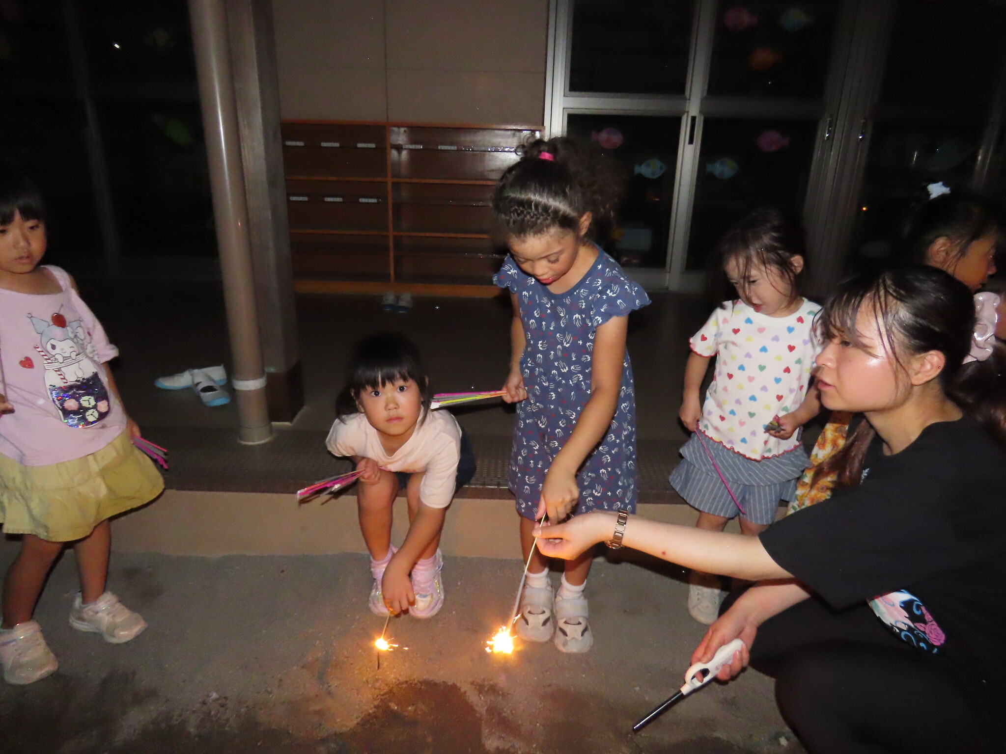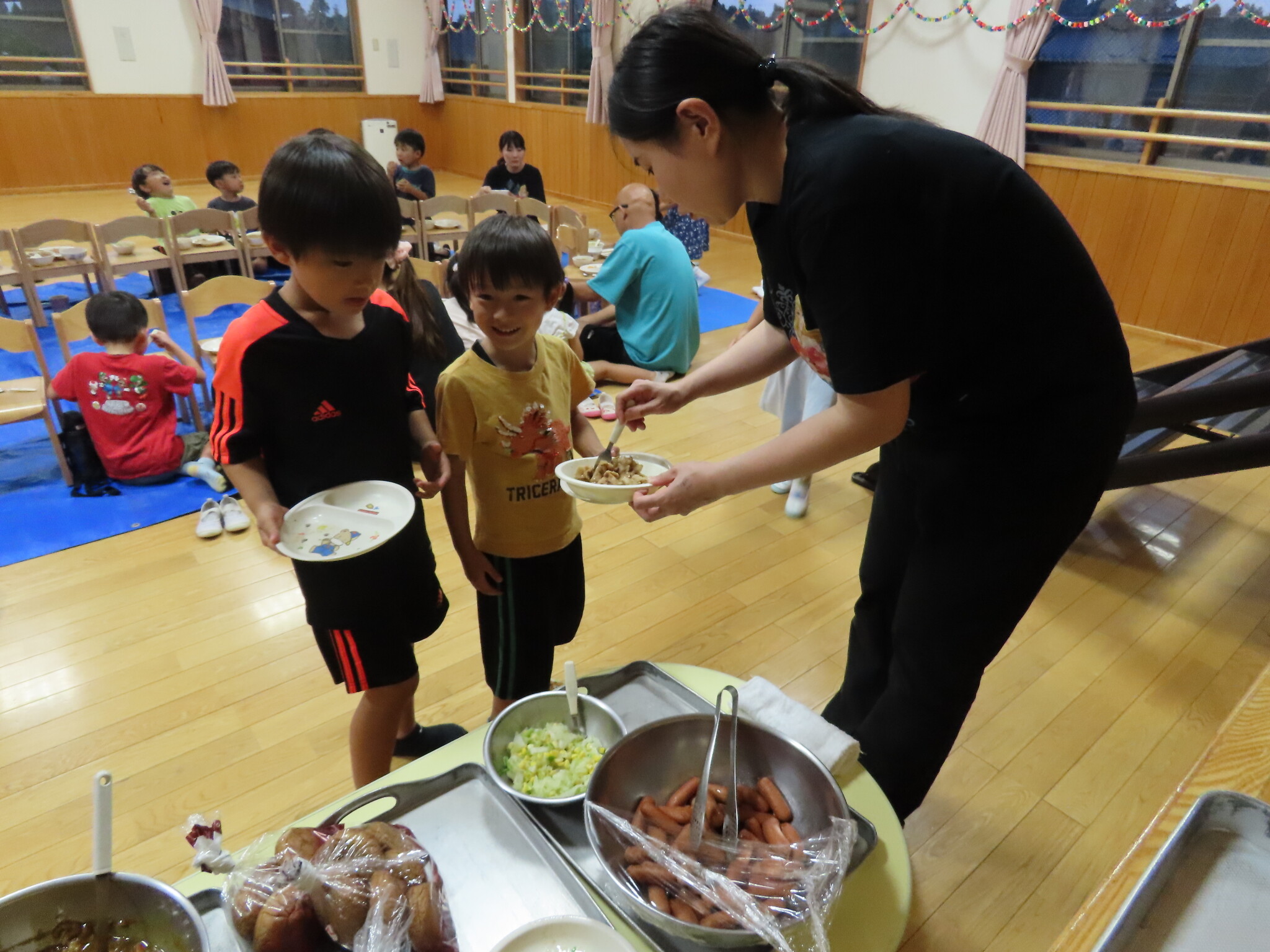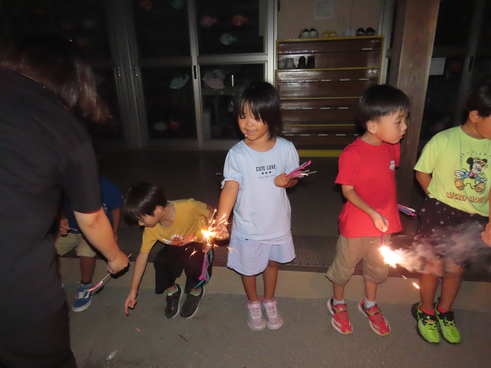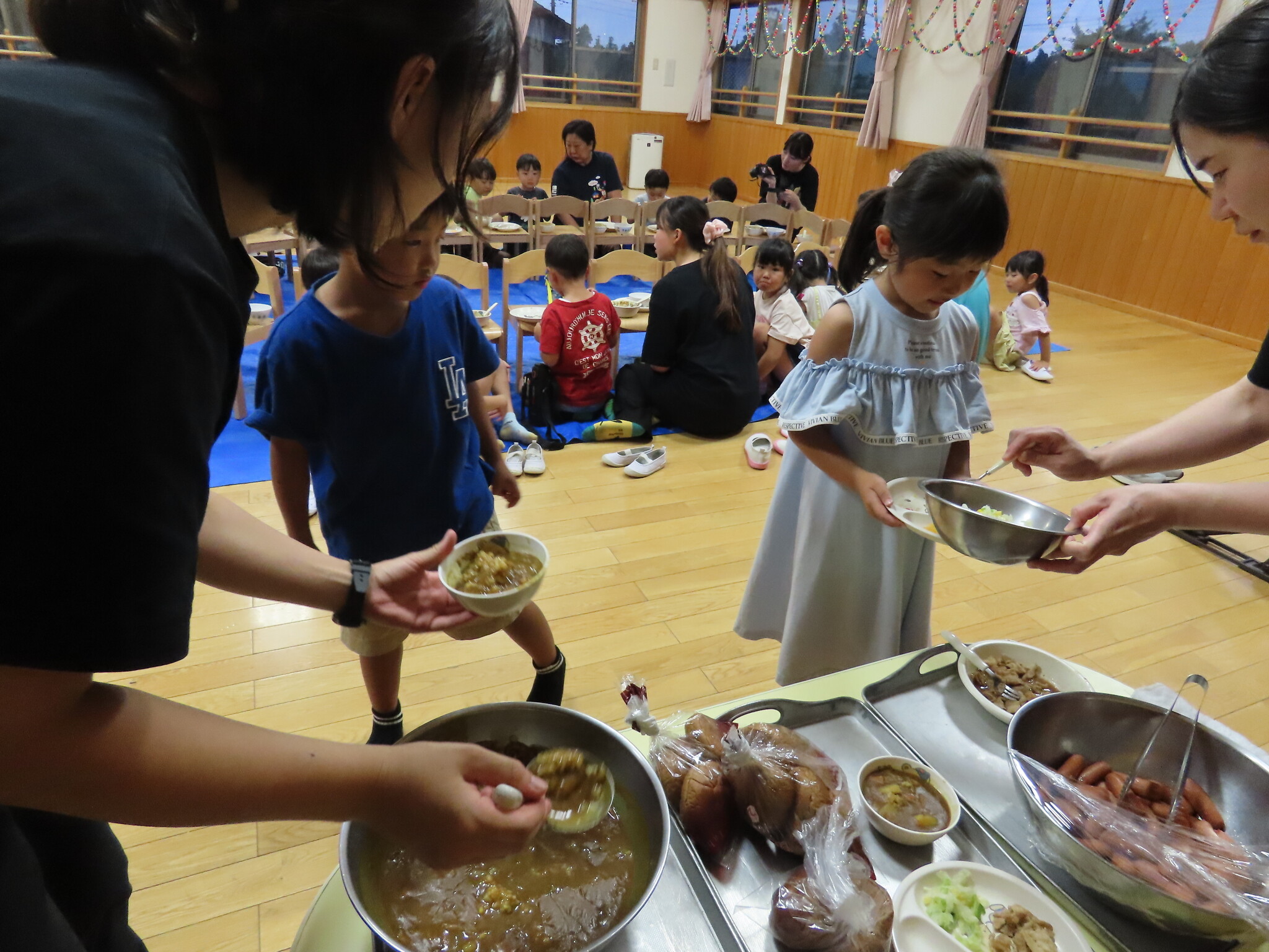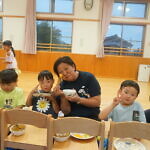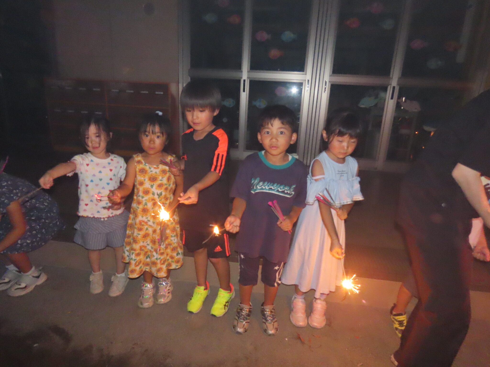 夕涼み会④ 公開済み: 2024年7月26日更新: 2024年7月26日 保育園に帰ってきた後は夕ご飯をたべました!! みんなが買ってきた食材はカレー、焼き肉、サラダ、みかんになりました!! 本当だと園庭でピクニック風に食べる予定でしたが雨のため叶わず、、、代わりにホールでたべました😁 給食のあとは待ちに待った花火の時間!! 雨の為、キャンプファイヤーはできませんでしたが、花火はできました!! 雨の為全て計画通りには行きませんでしたが楽しい時間が過ごせました😁