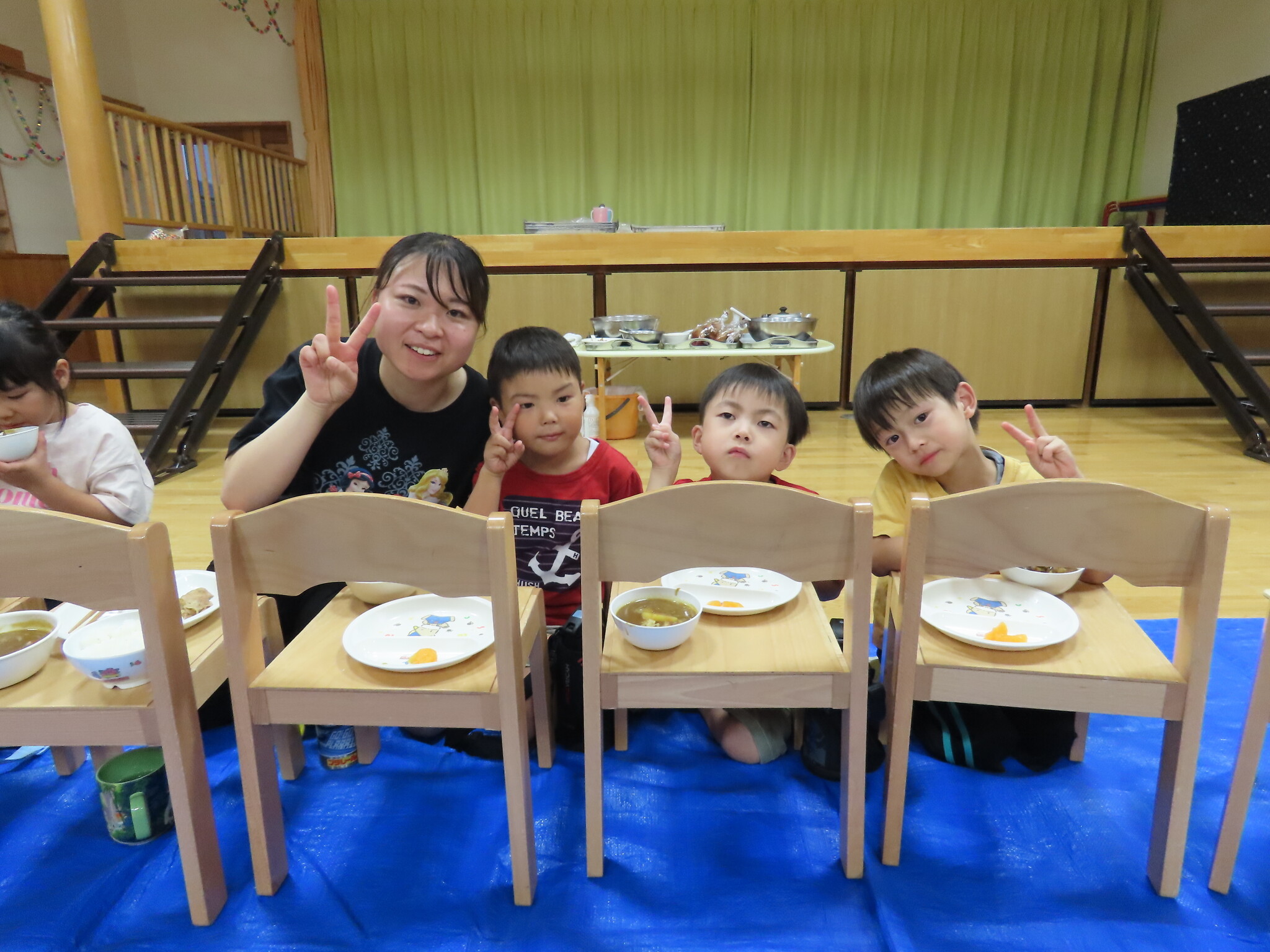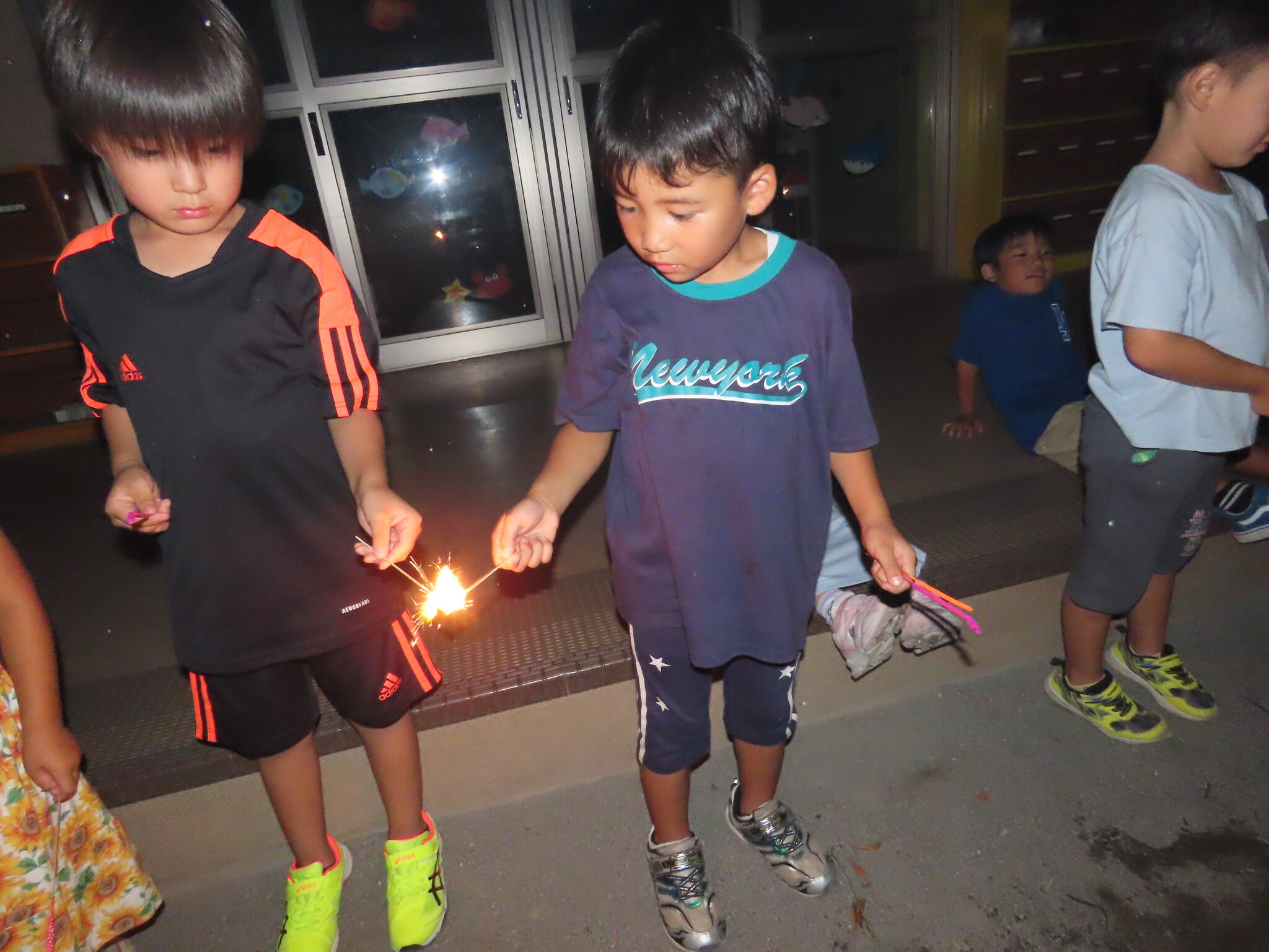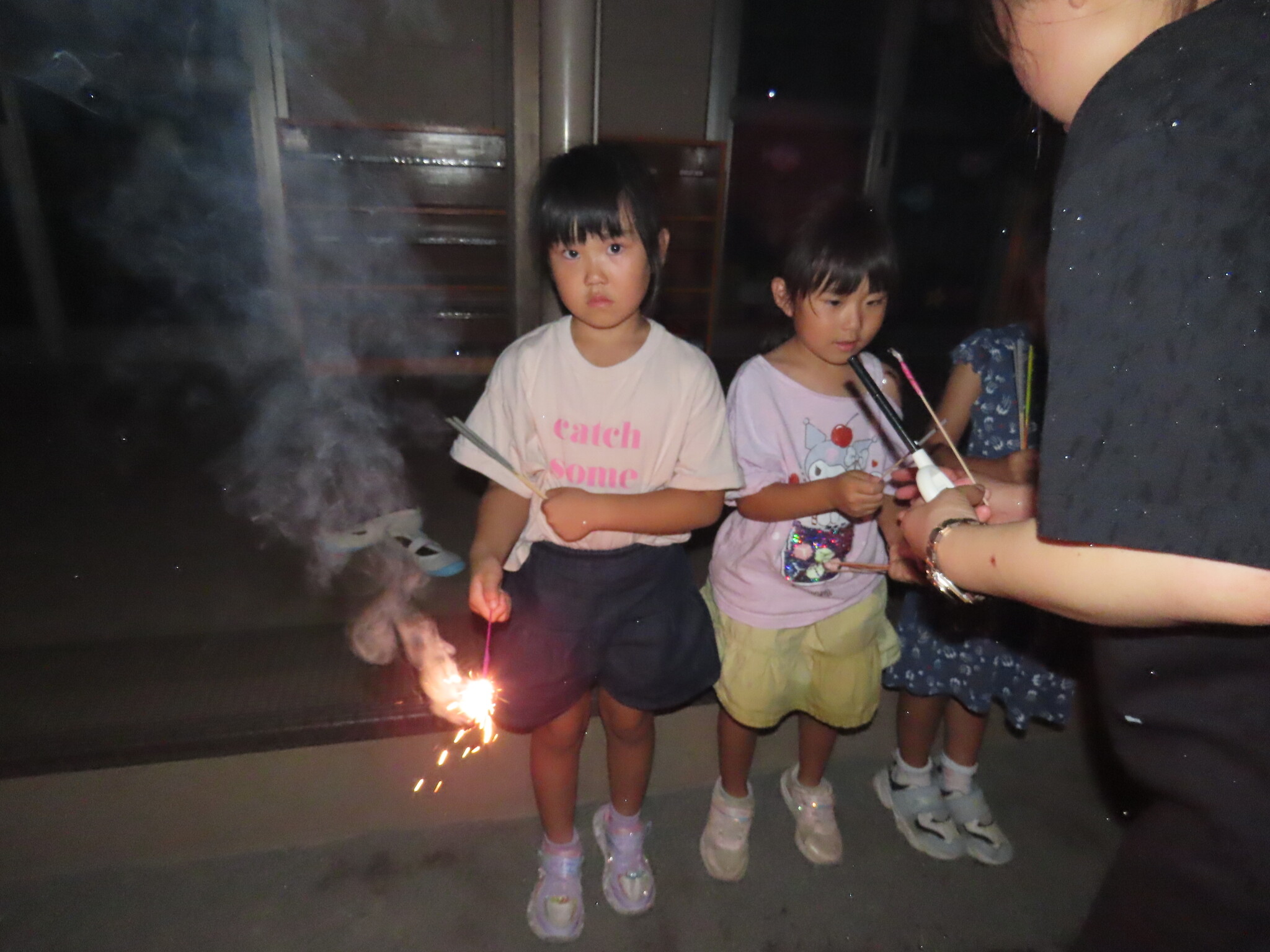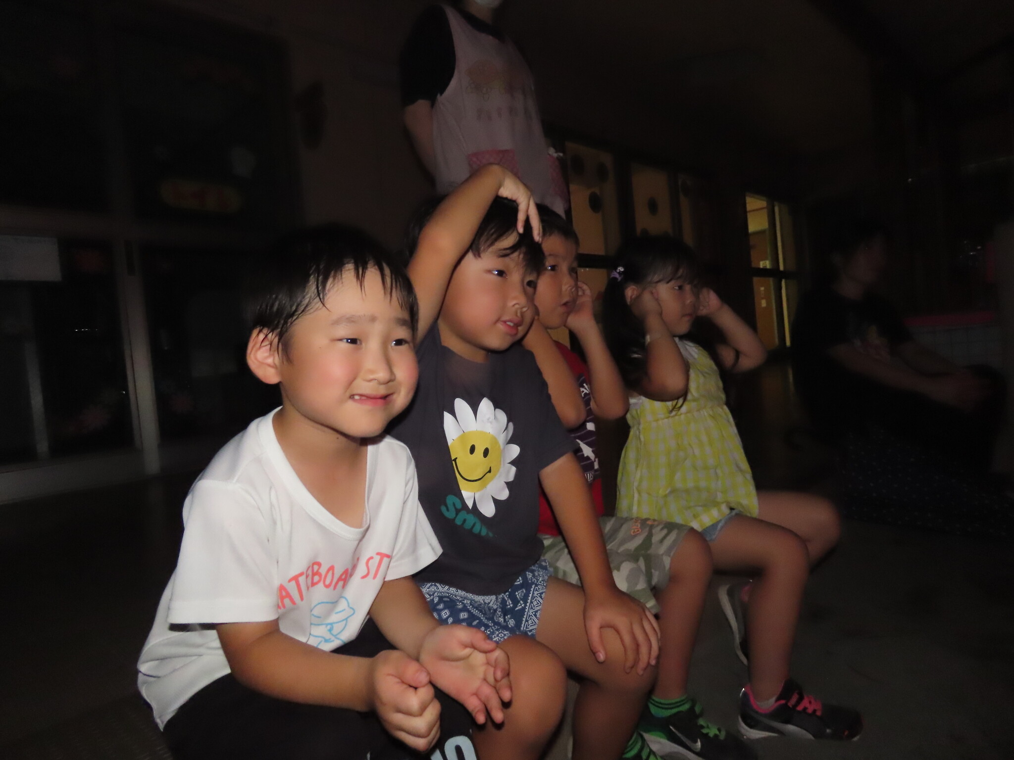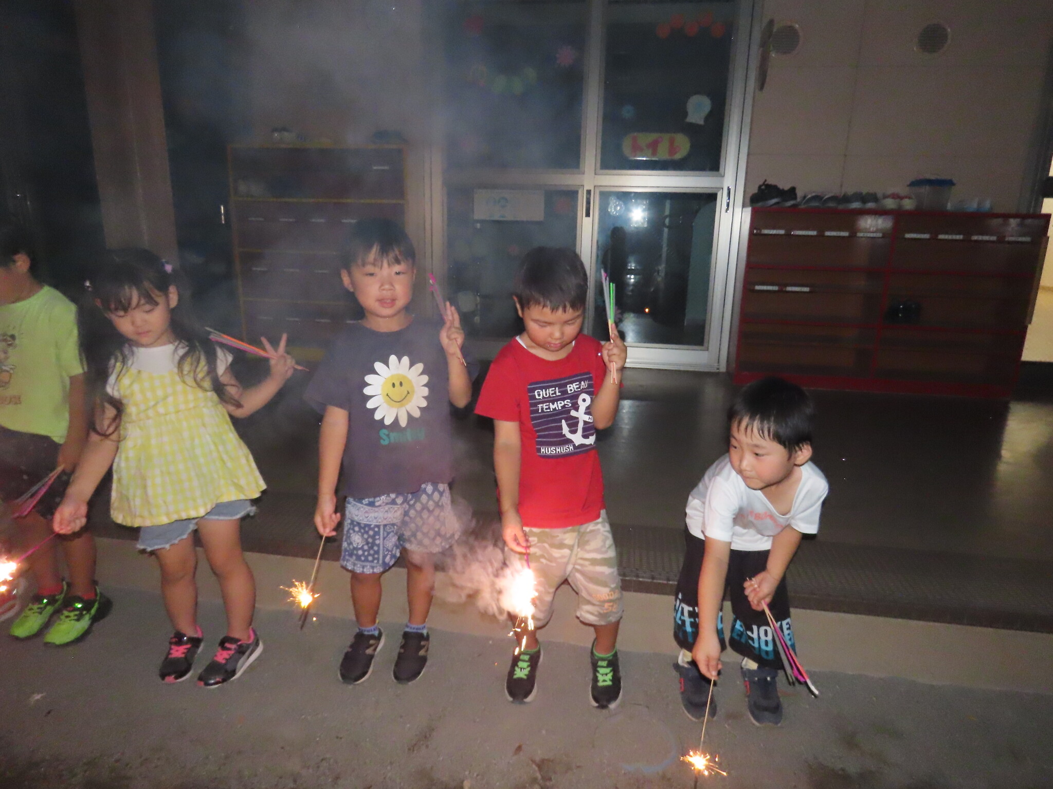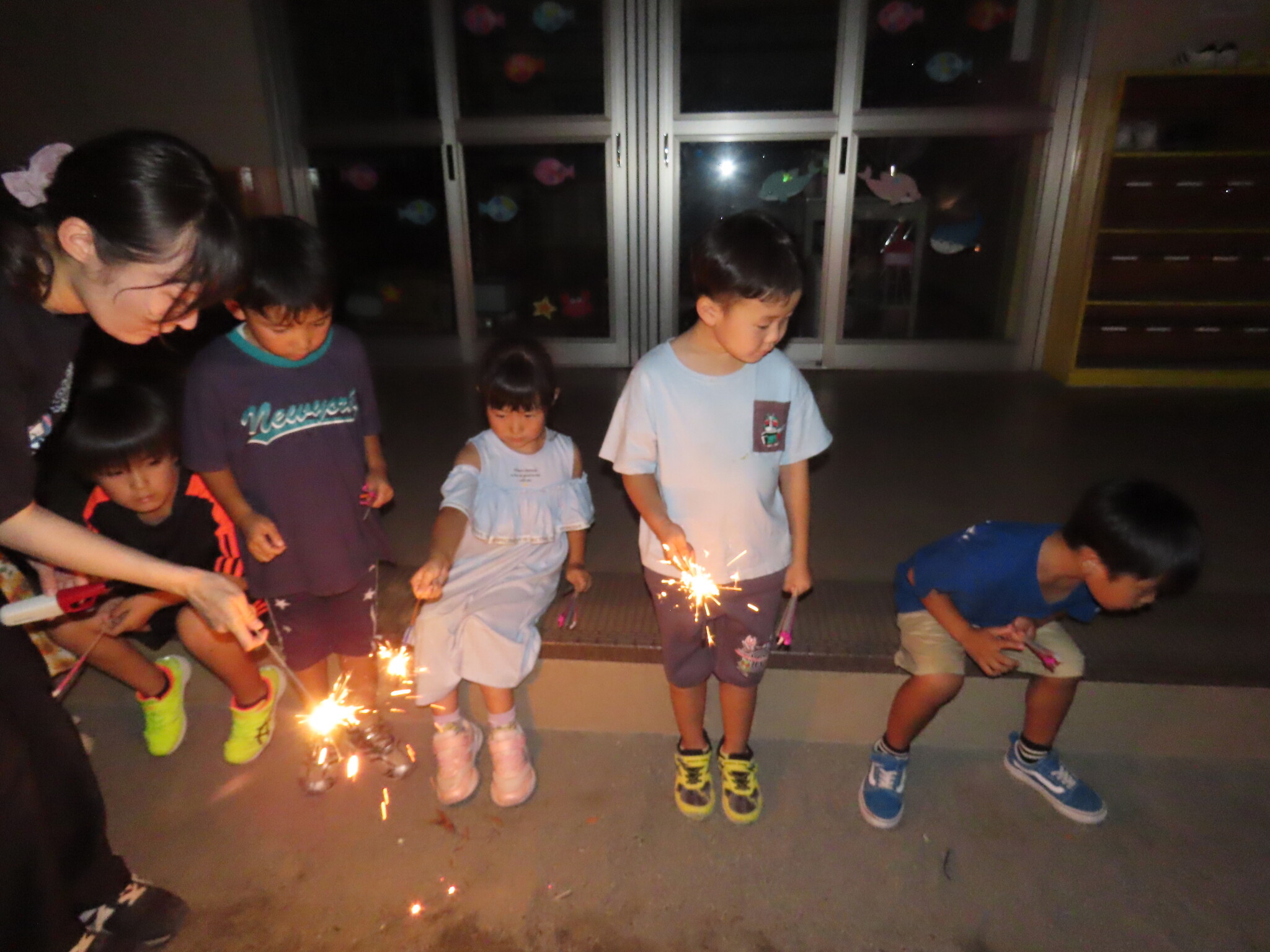 夕涼み会④ 公開済み: 2024年7月26日更新: 2024年7月26日 保育園に帰ってきた後は夕ご飯をたべました!! みんなが買ってきた食材はカレー、焼き肉、サラダ、みかんになりました!! 本当だと園庭でピクニック風に食べる予定でしたが雨のため叶わず、、、代わりにホールでたべました😁 給食のあとは待ちに待った花火の時間!! 雨の為、キャンプファイヤーはできませんでしたが、花火はできました!! 雨の為全て計画通りには行きませんでしたが楽しい時間が過ごせました😁