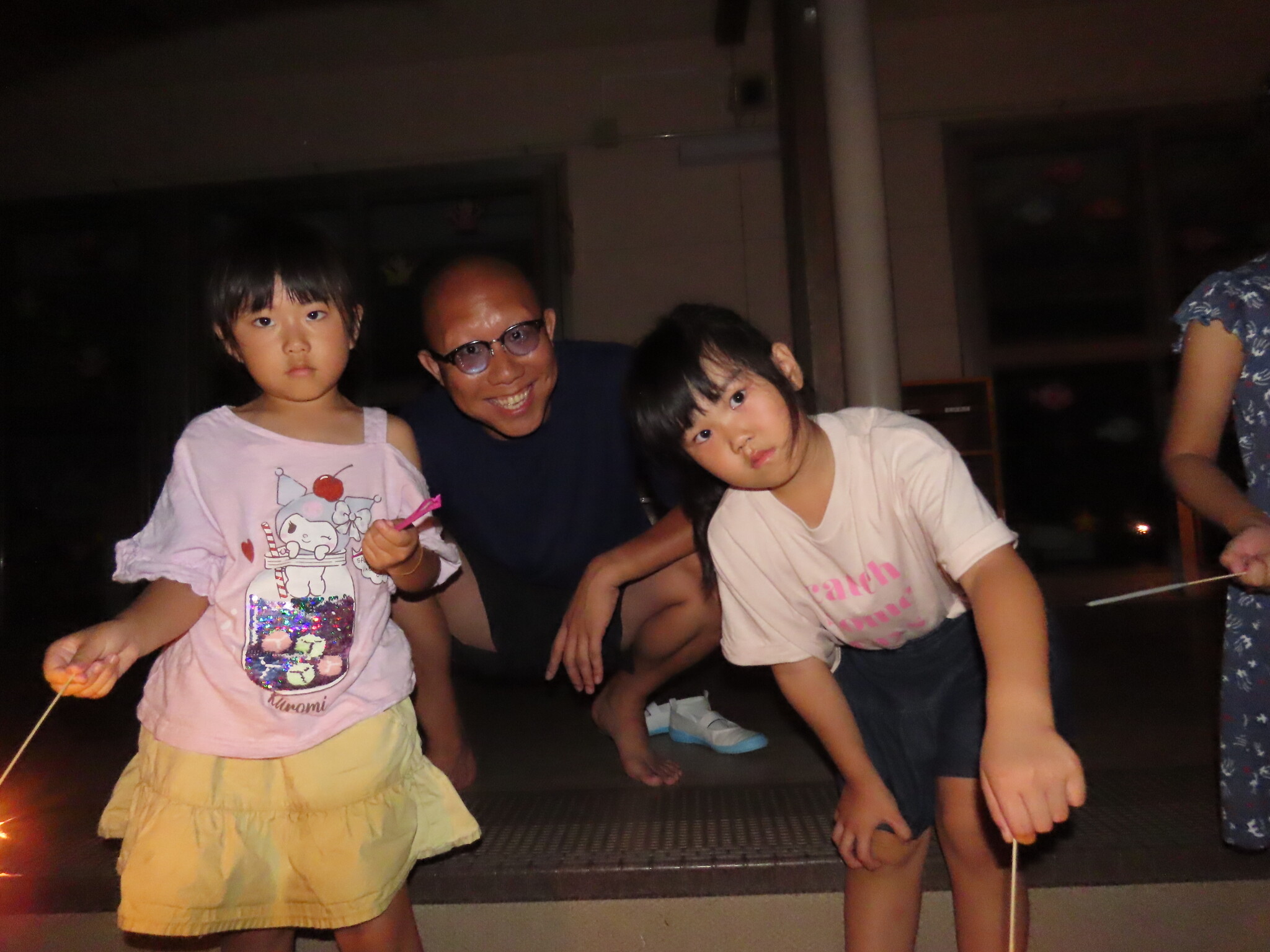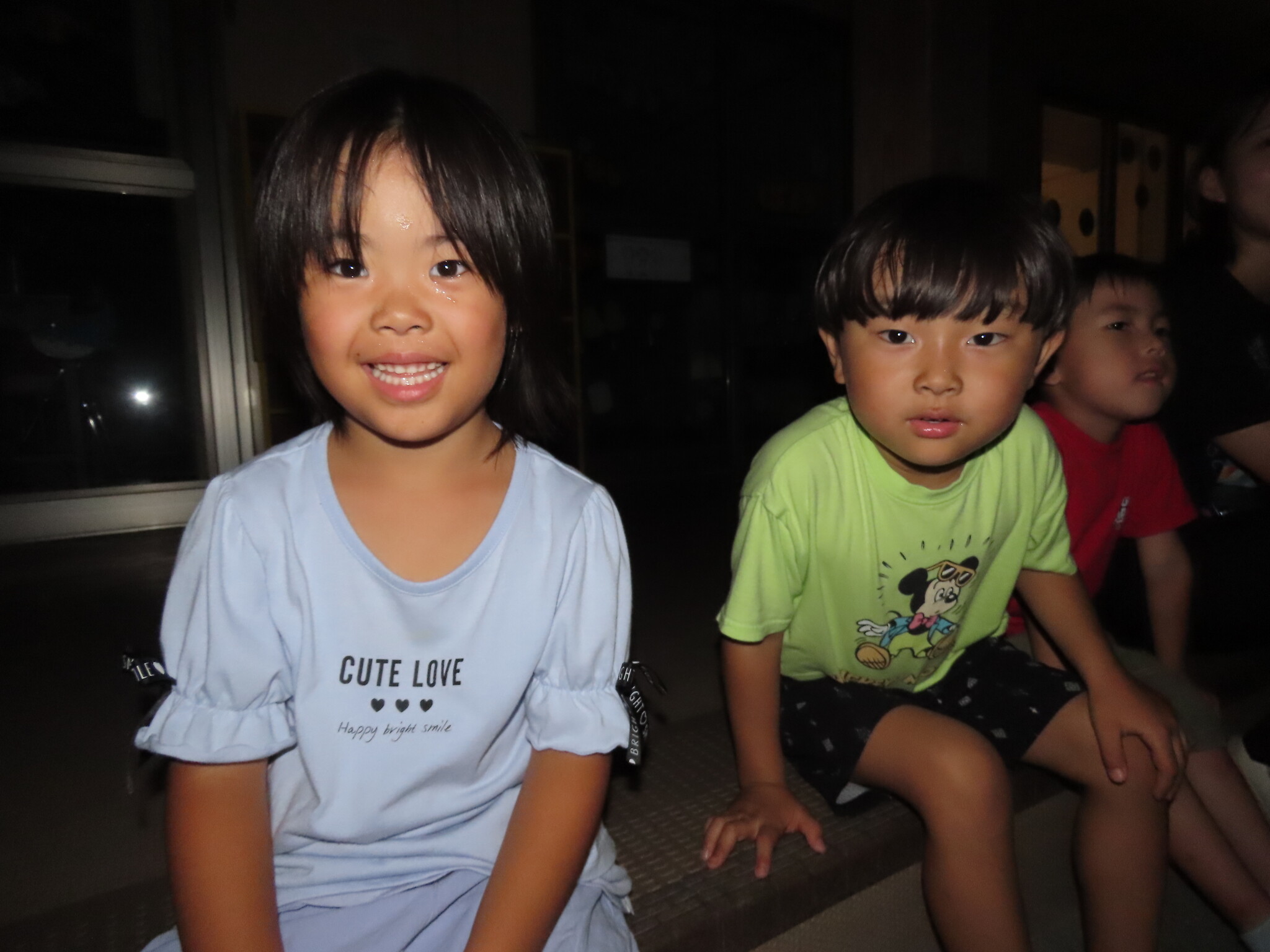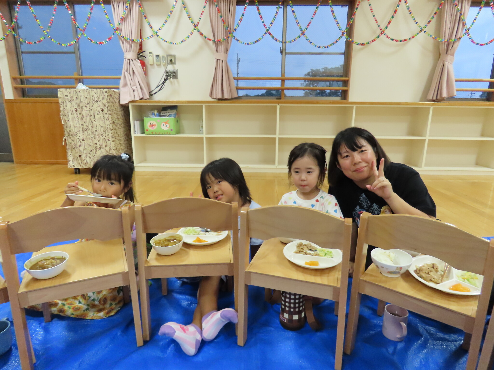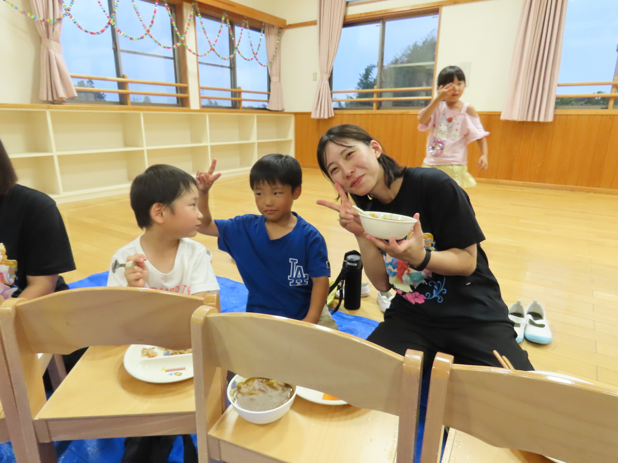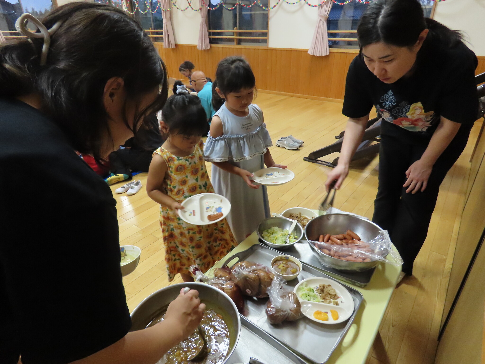 夕涼み会④ 公開済み: 2024年7月26日更新: 2024年7月26日 保育園に帰ってきた後は夕ご飯をたべました!! みんなが買ってきた食材はカレー、焼き肉、サラダ、みかんになりました!! 本当だと園庭でピクニック風に食べる予定でしたが雨のため叶わず、、、代わりにホールでたべました😁 給食のあとは待ちに待った花火の時間!! 雨の為、キャンプファイヤーはできませんでしたが、花火はできました!! 雨の為全て計画通りには行きませんでしたが楽しい時間が過ごせました😁