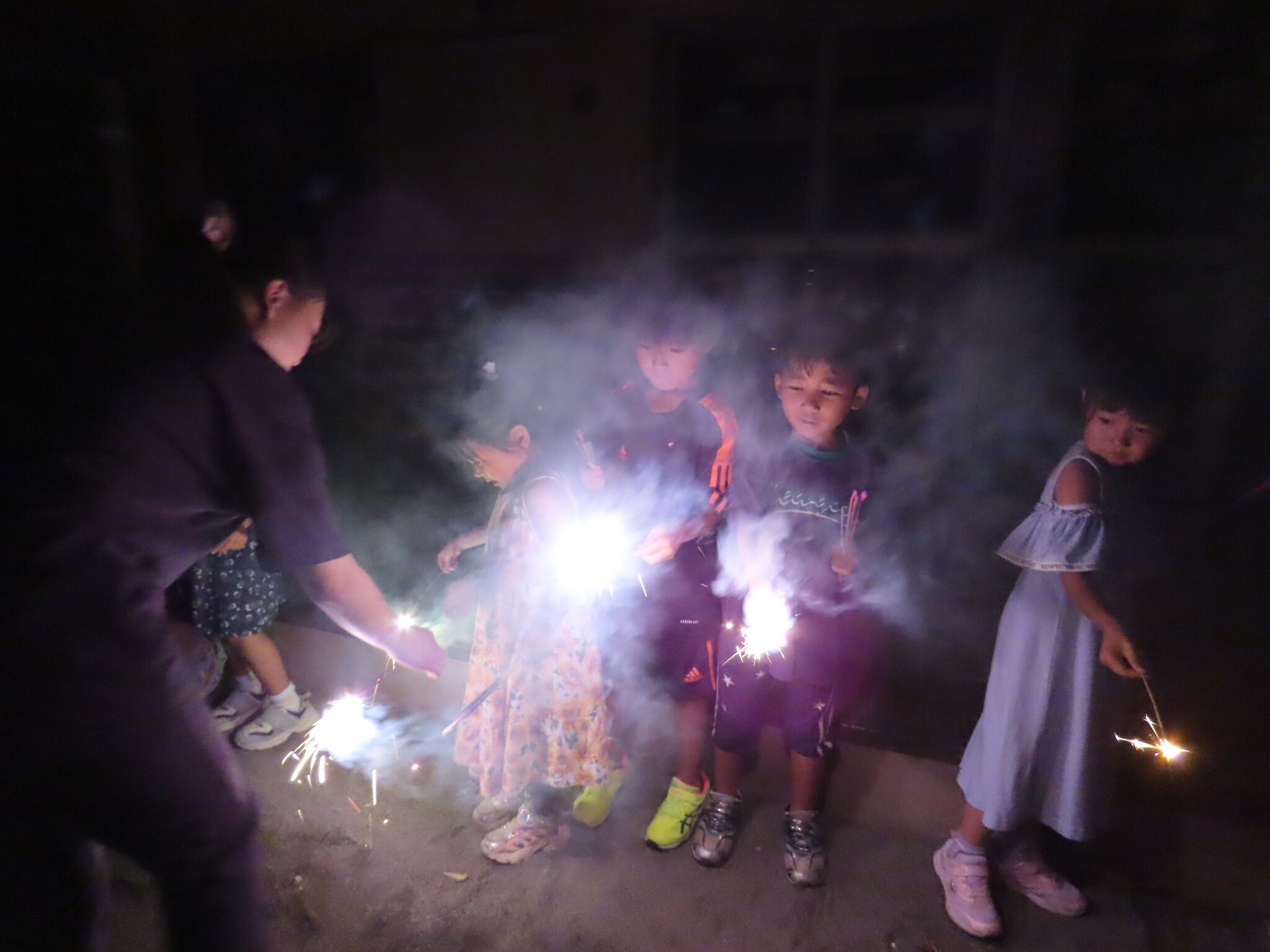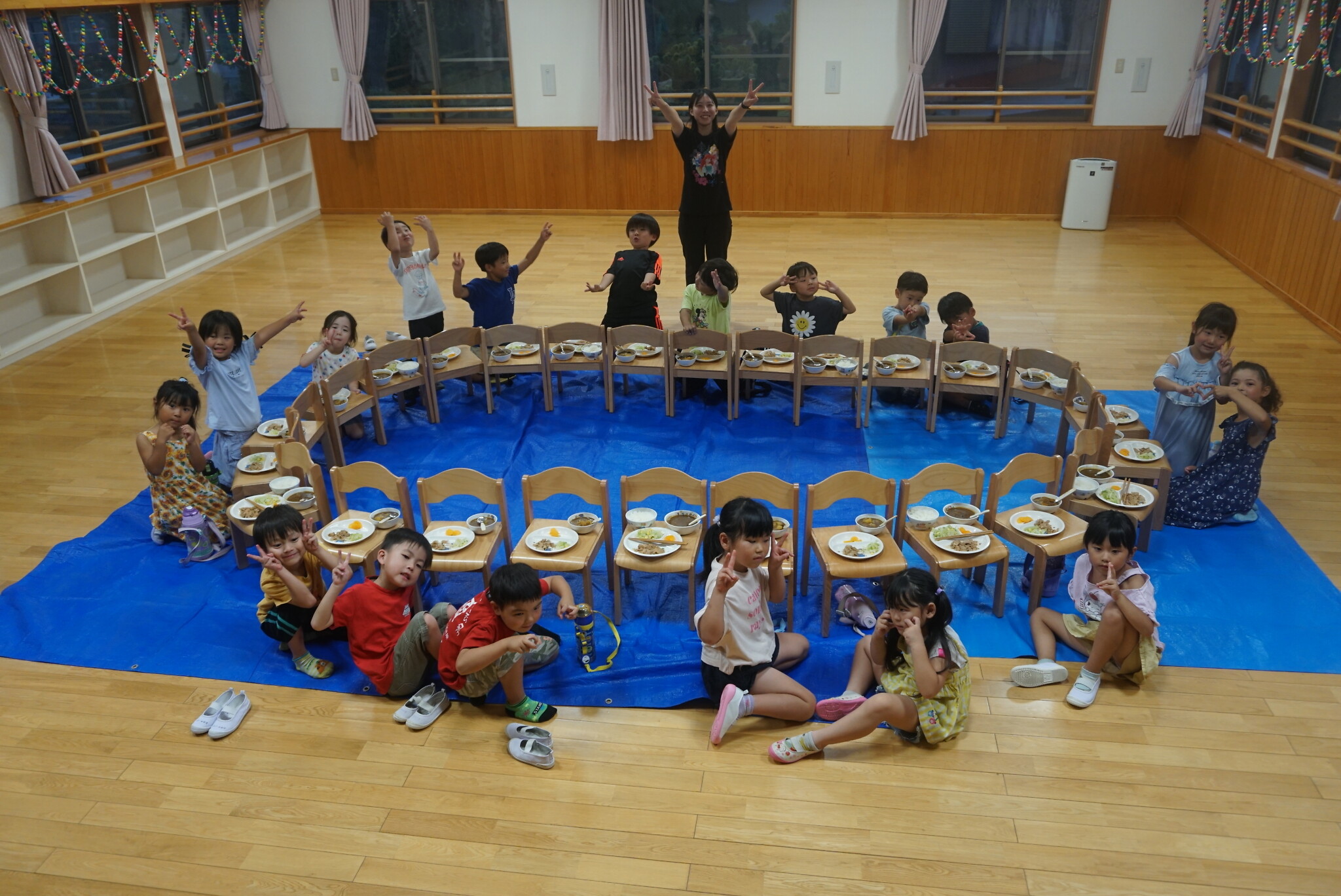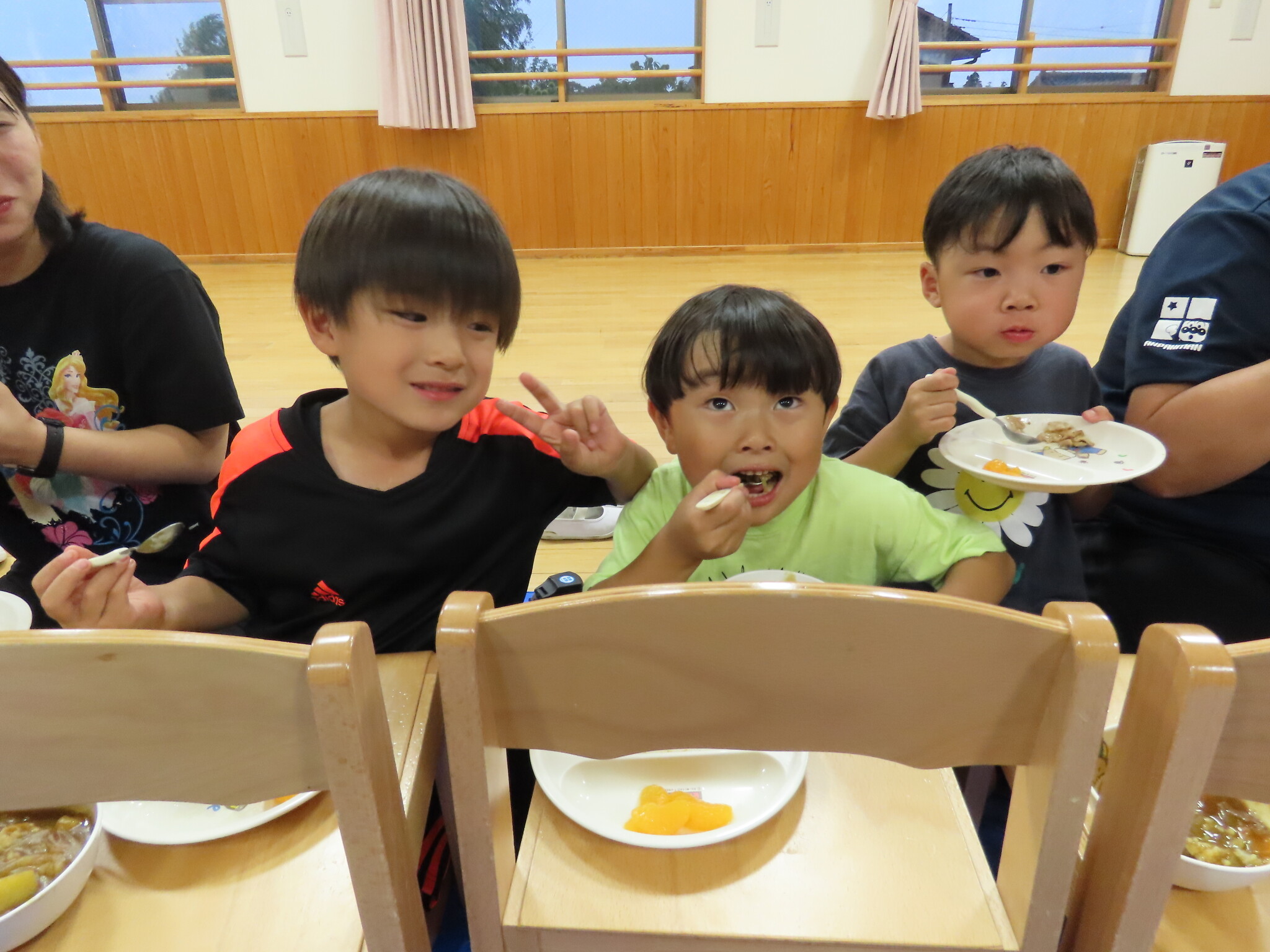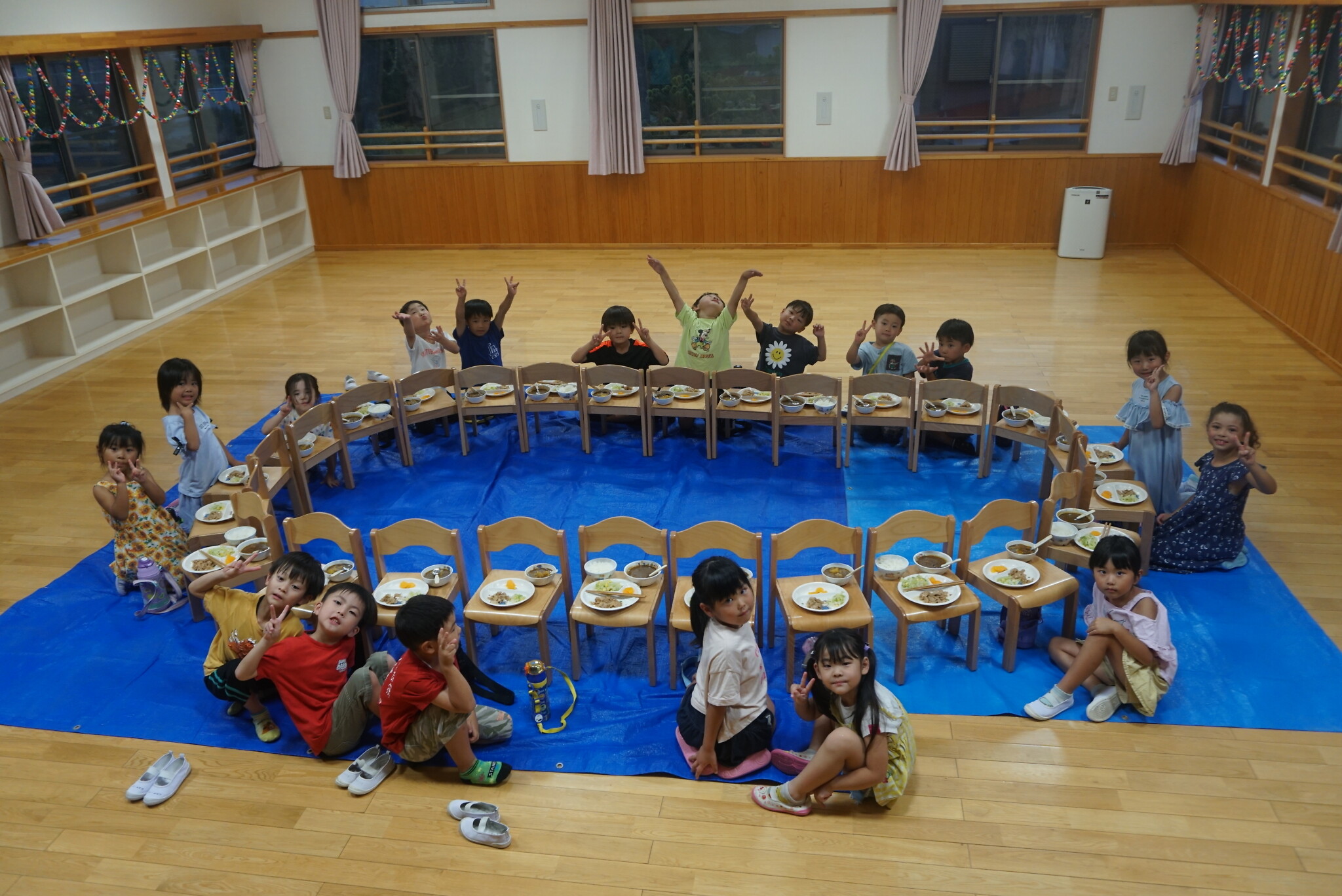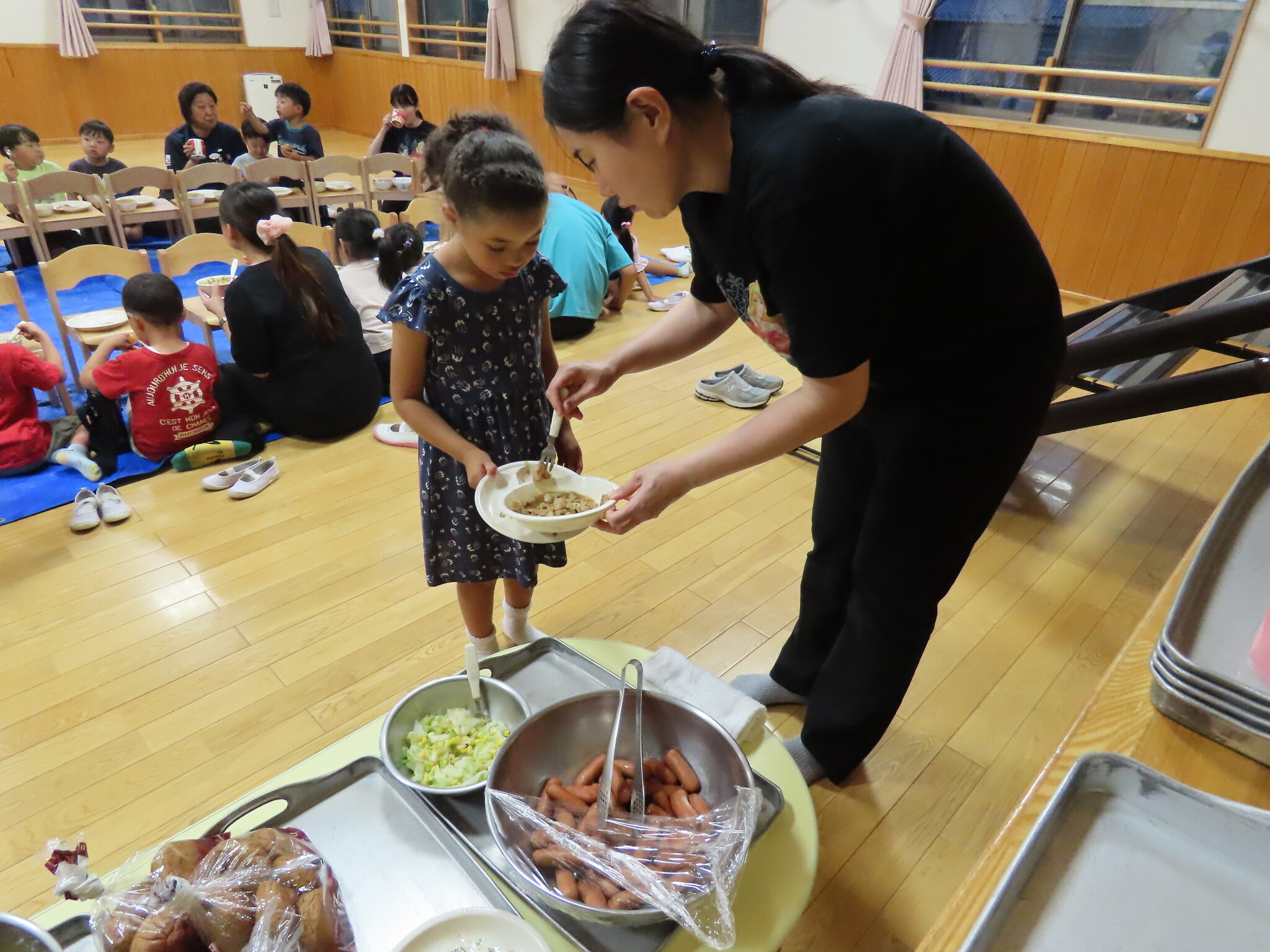 夕涼み会④ 公開済み: 2024年7月26日更新: 2024年7月26日 保育園に帰ってきた後は夕ご飯をたべました!! みんなが買ってきた食材はカレー、焼き肉、サラダ、みかんになりました!! 本当だと園庭でピクニック風に食べる予定でしたが雨のため叶わず、、、代わりにホールでたべました😁 給食のあとは待ちに待った花火の時間!! 雨の為、キャンプファイヤーはできませんでしたが、花火はできました!! 雨の為全て計画通りには行きませんでしたが楽しい時間が過ごせました😁