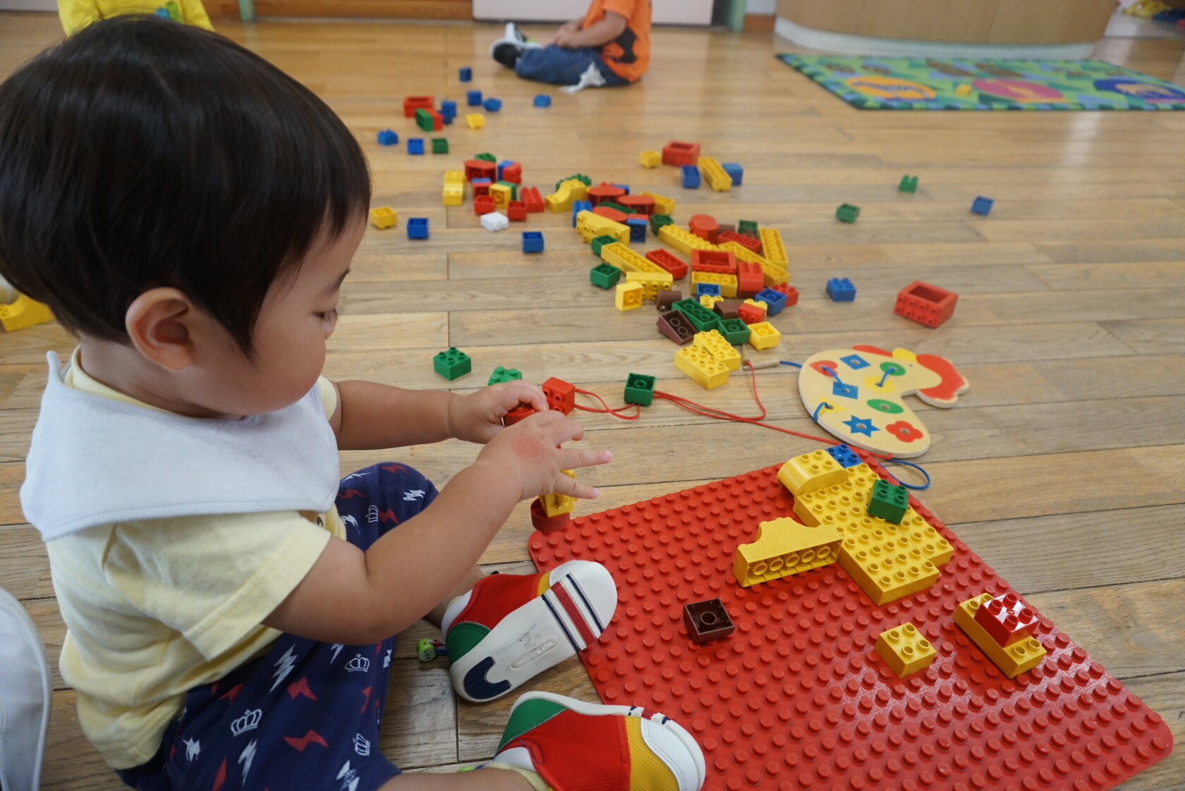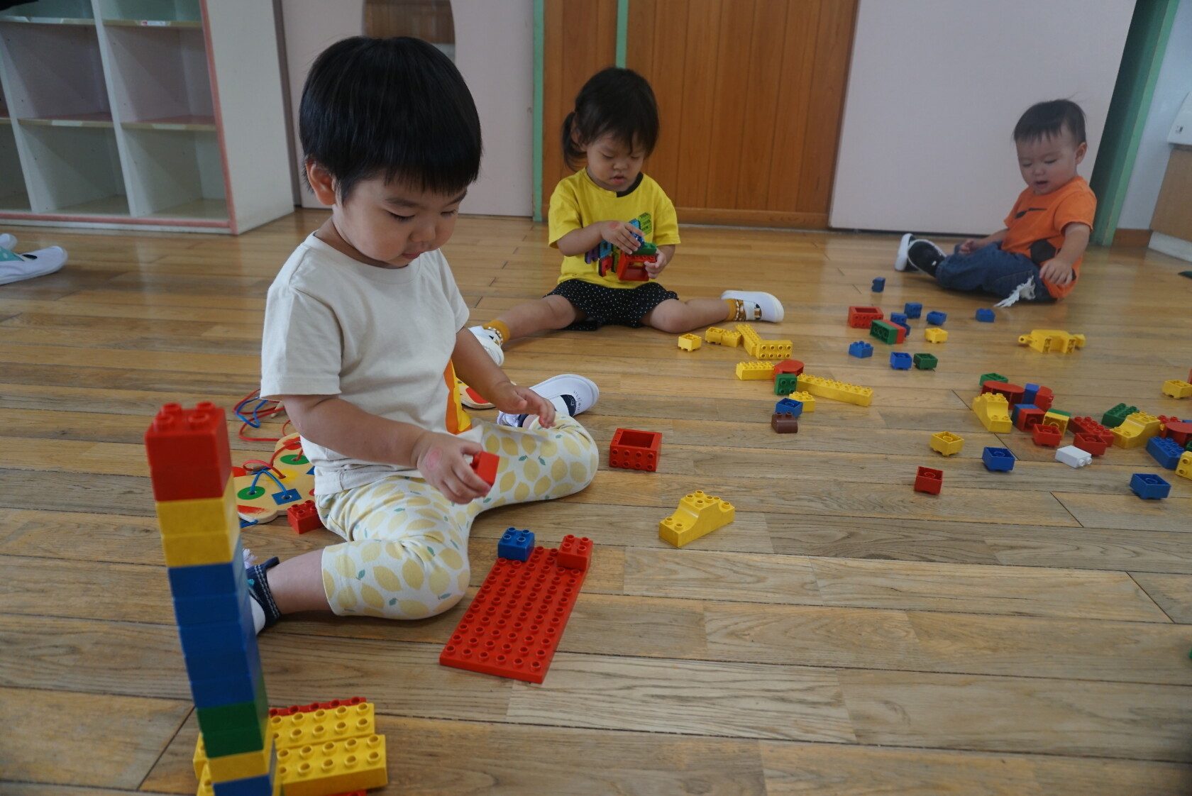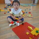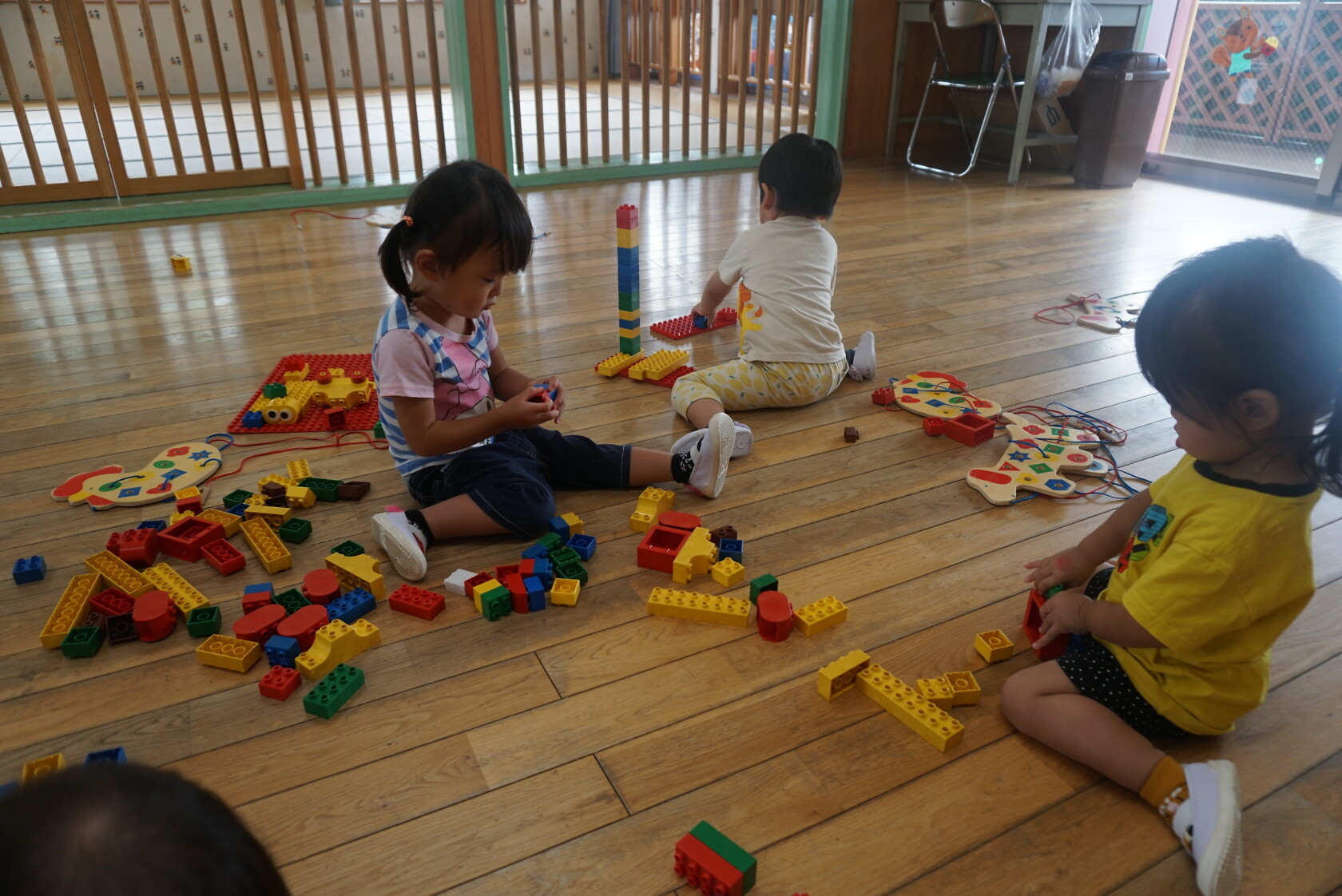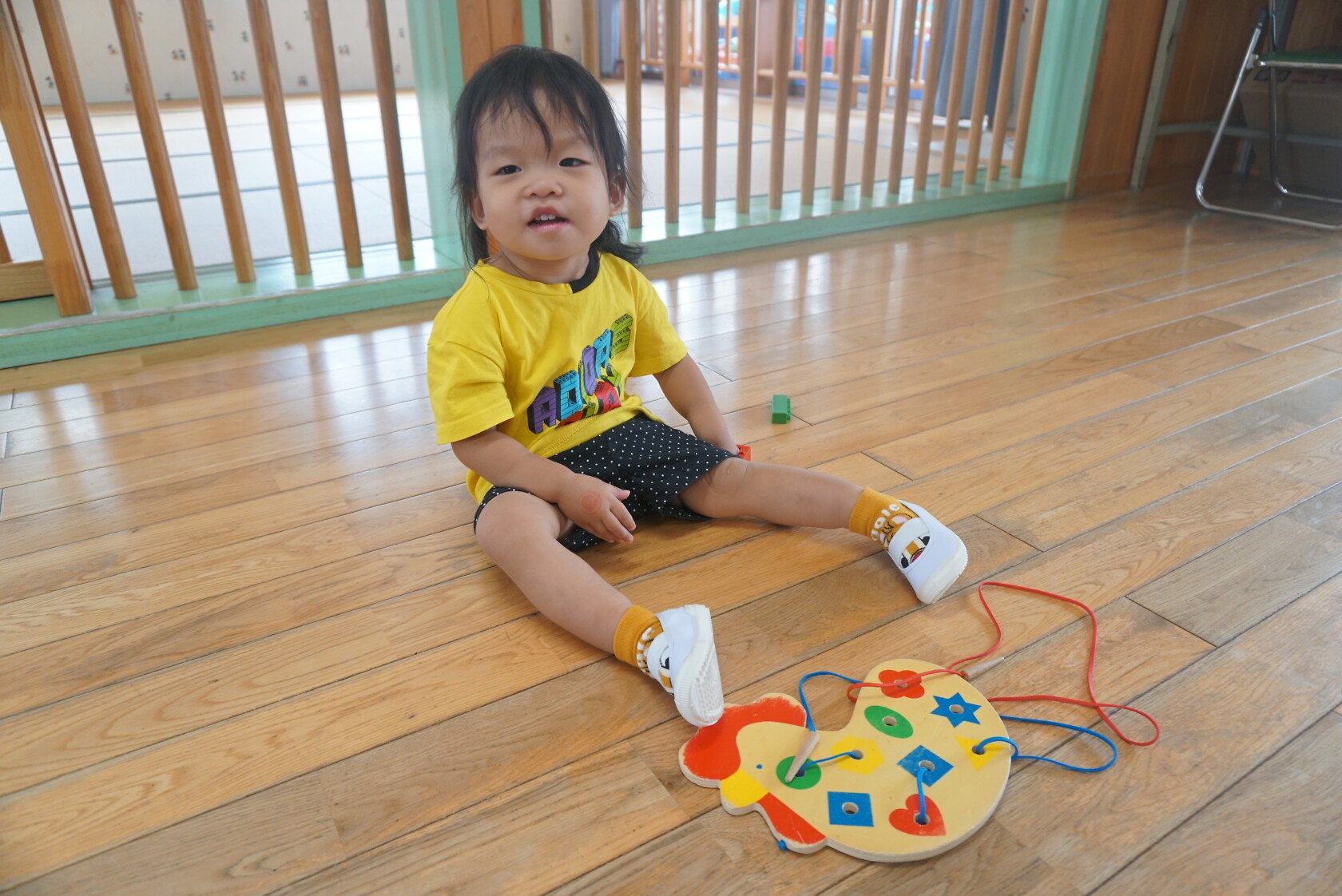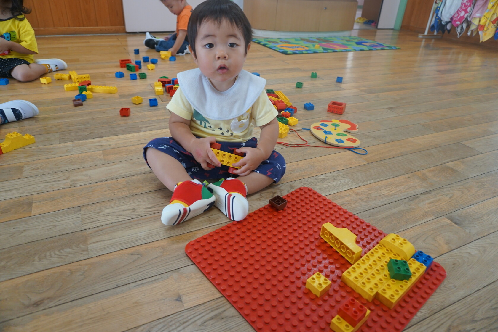 楽しい水遊びが終わり、水分補給をしてから休息の時間を楽しんでいる、さくら組さんです🎵 今日は、レゴブロックと紐通しをして遊びました😊 初めて使うおもちゃに興味を示し、自分なりにやっている姿が見られました🎼