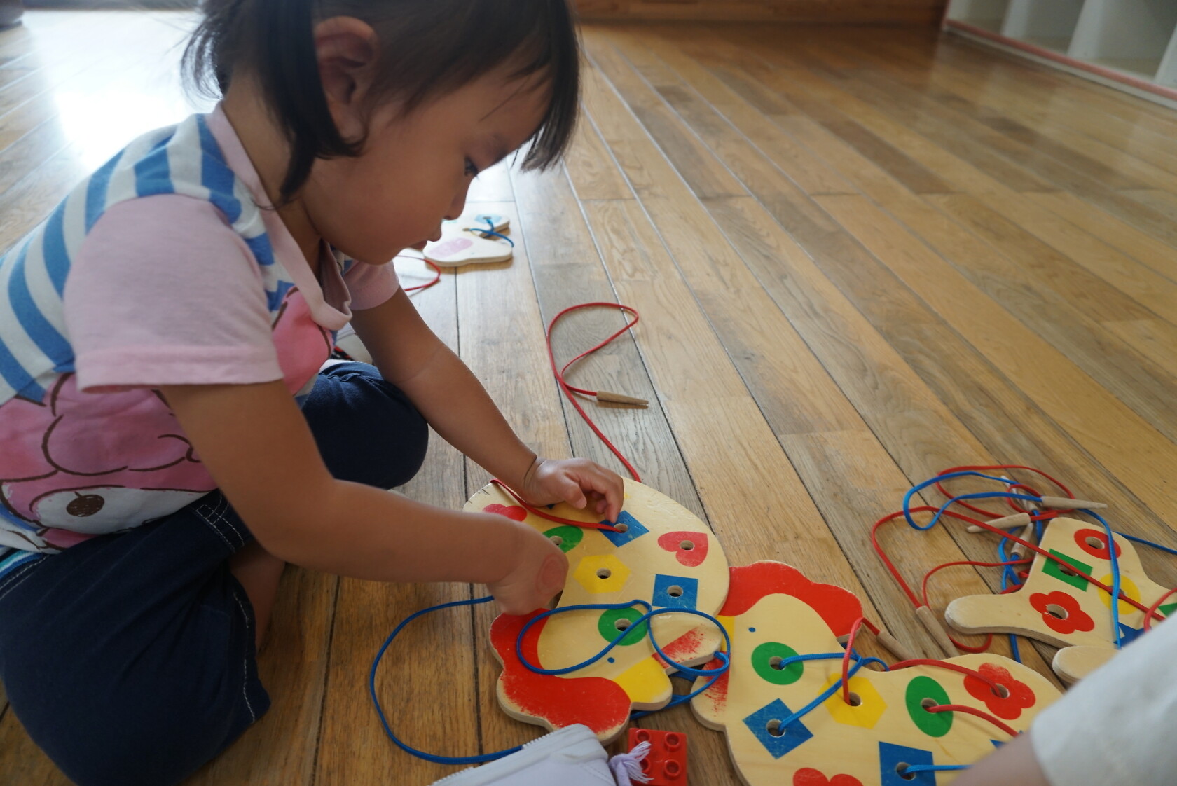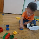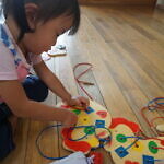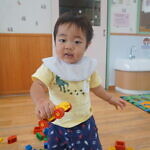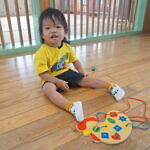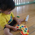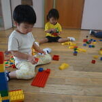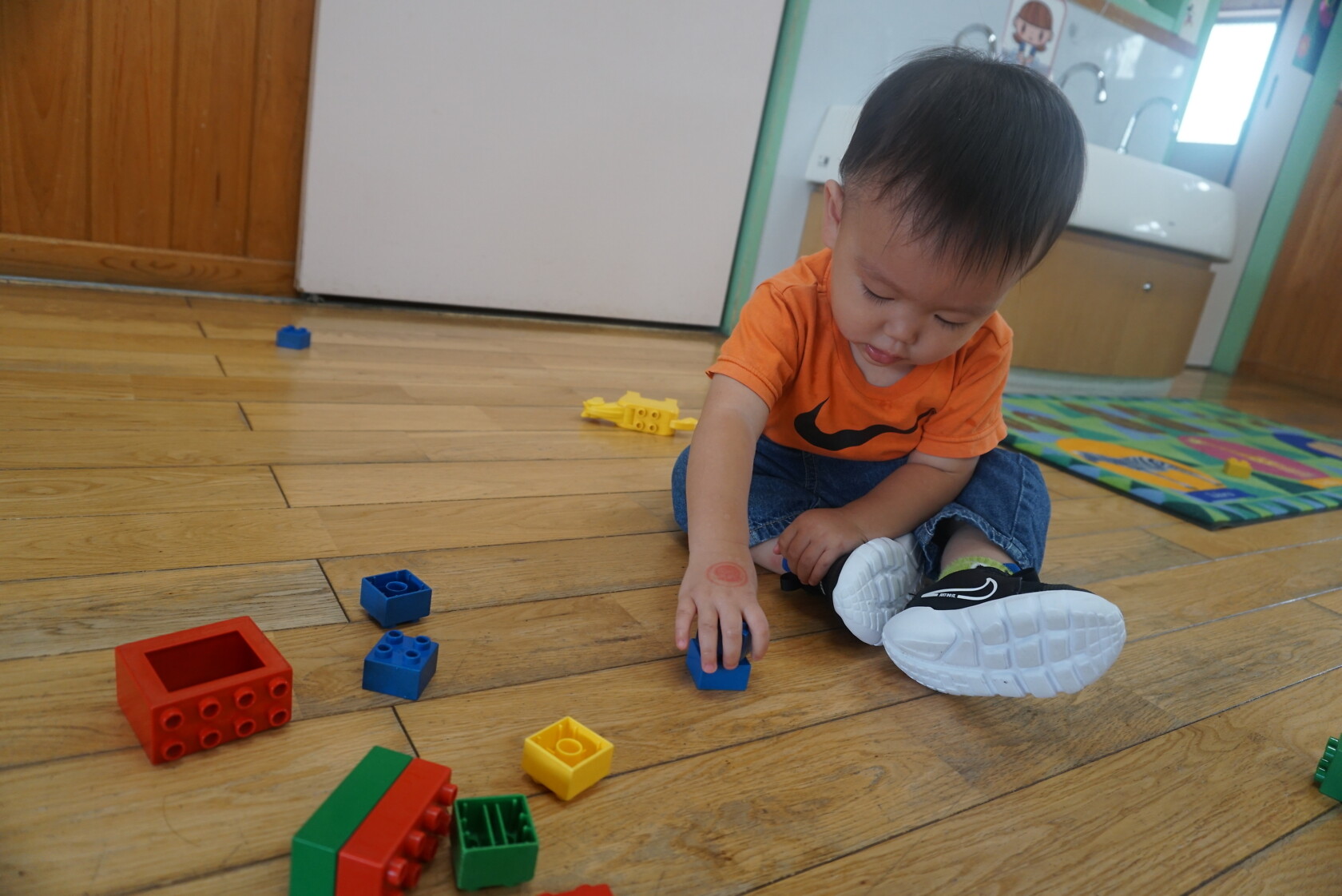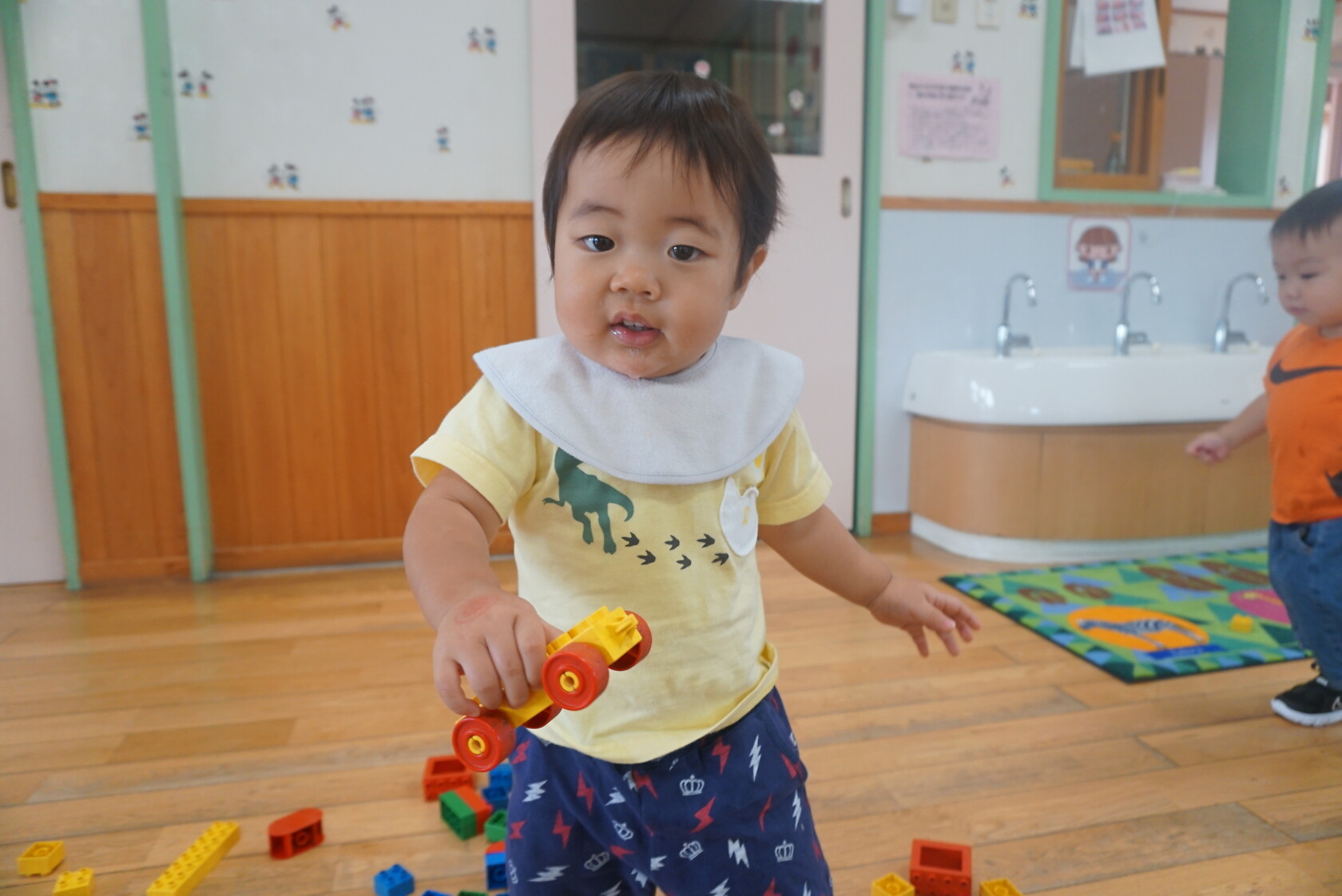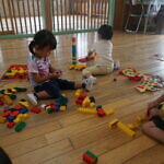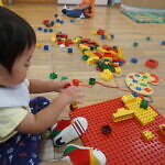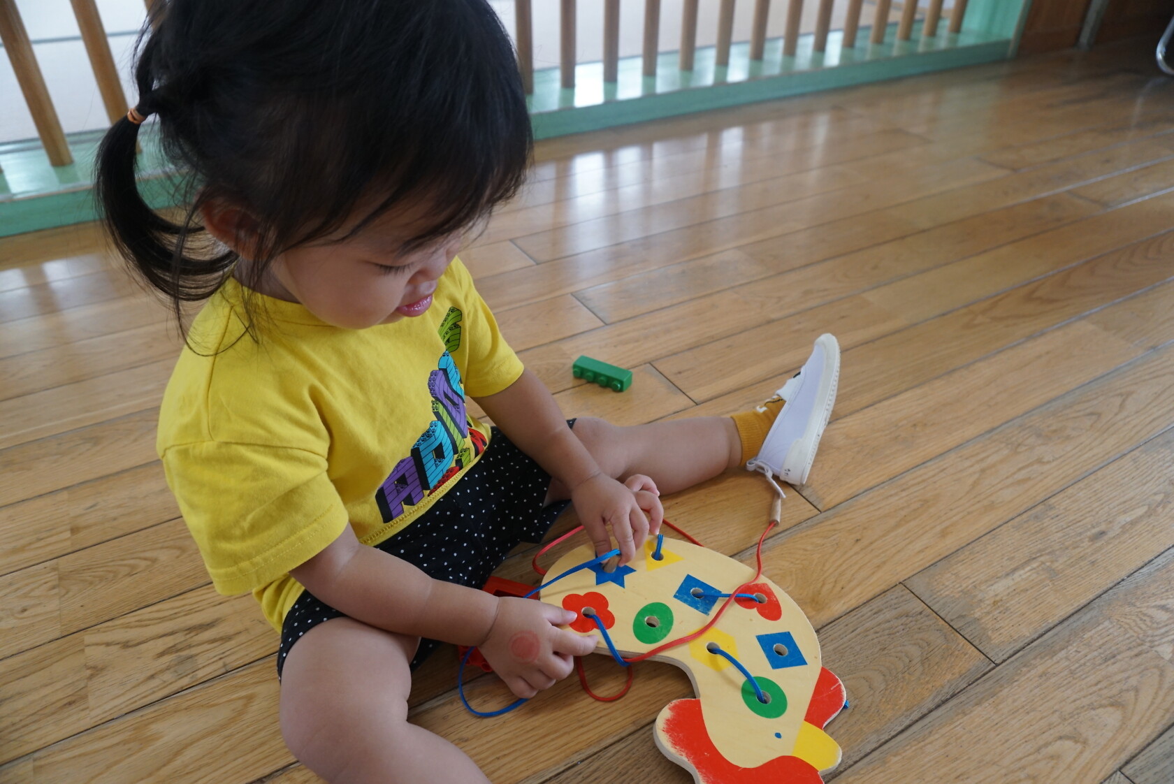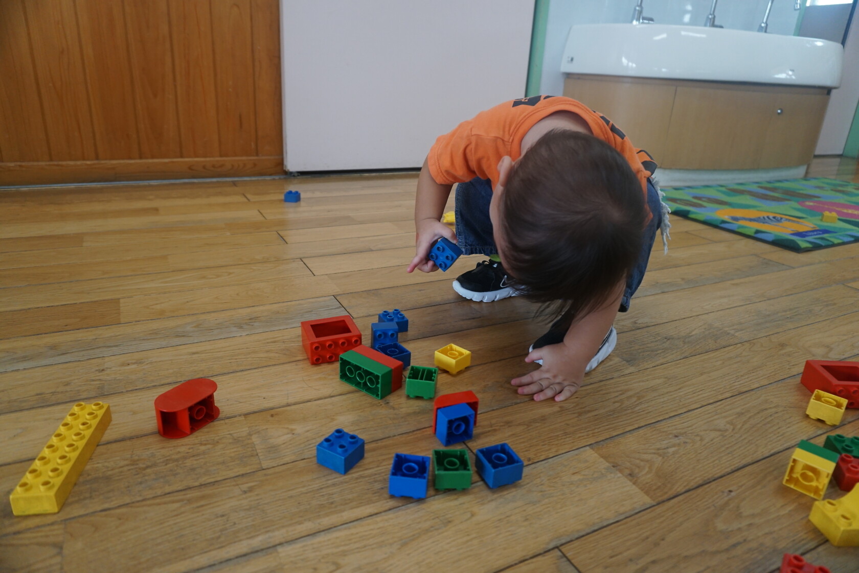 楽しい水遊びが終わり、水分補給をしてから休息の時間を楽しんでいる、さくら組さんです🎵 今日は、レゴブロックと紐通しをして遊びました😊 初めて使うおもちゃに興味を示し、自分なりにやっている姿が見られました🎼