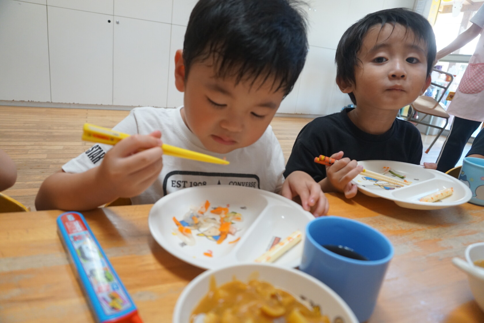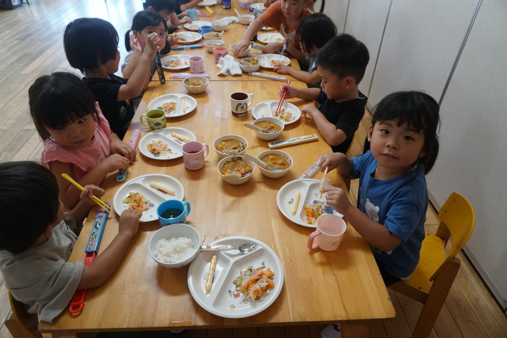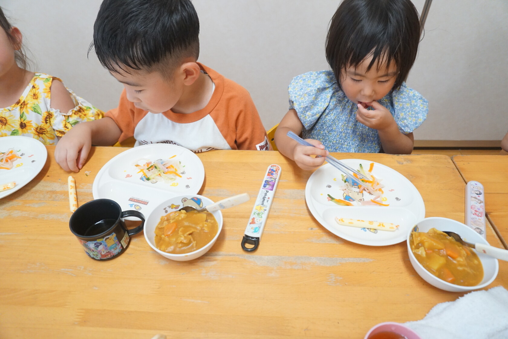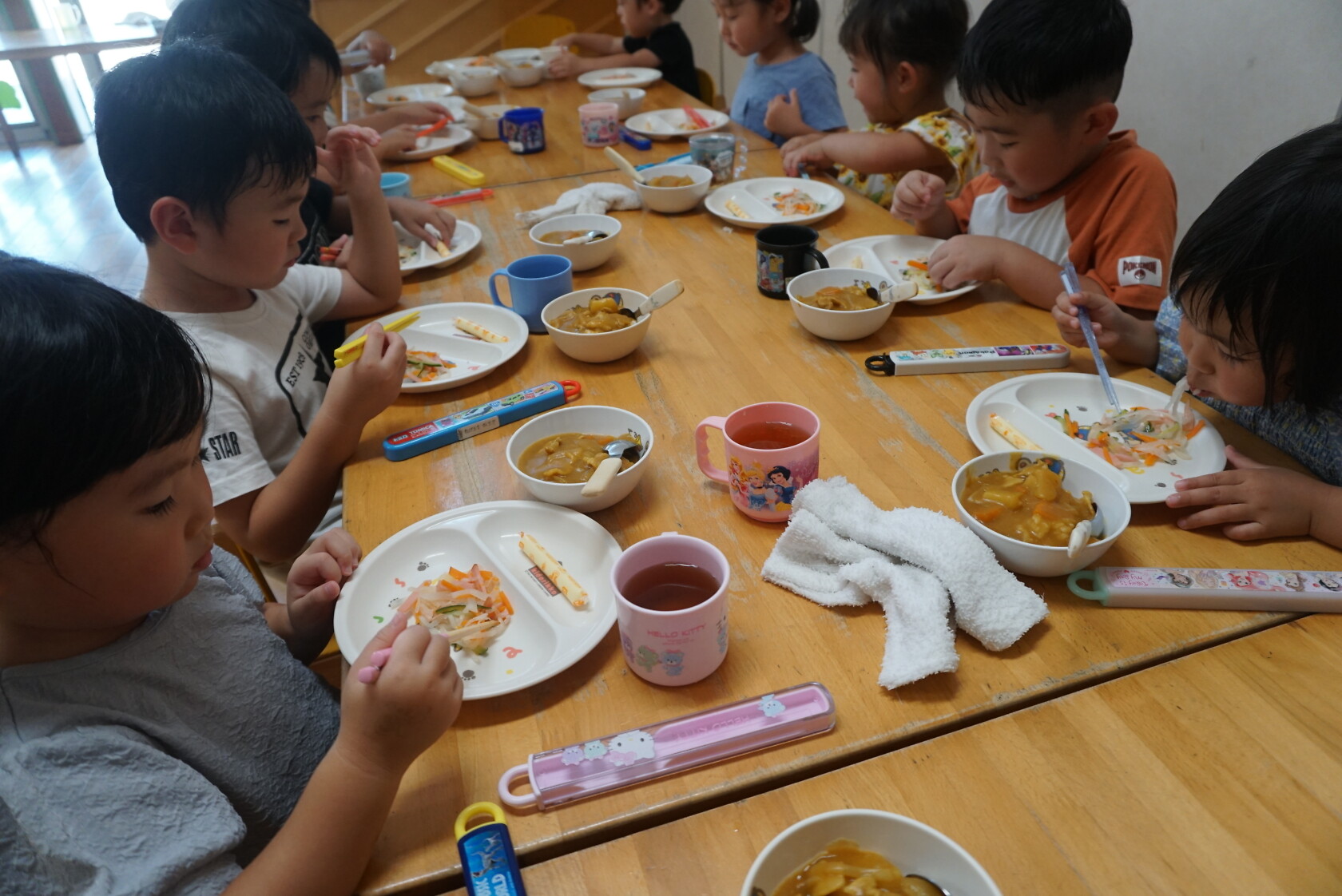 今日は、みんなの大好きなカレーでした。カメラを向けると大きな口を開け、食べているところを見せてくれた子ども達でした✨