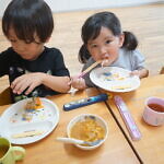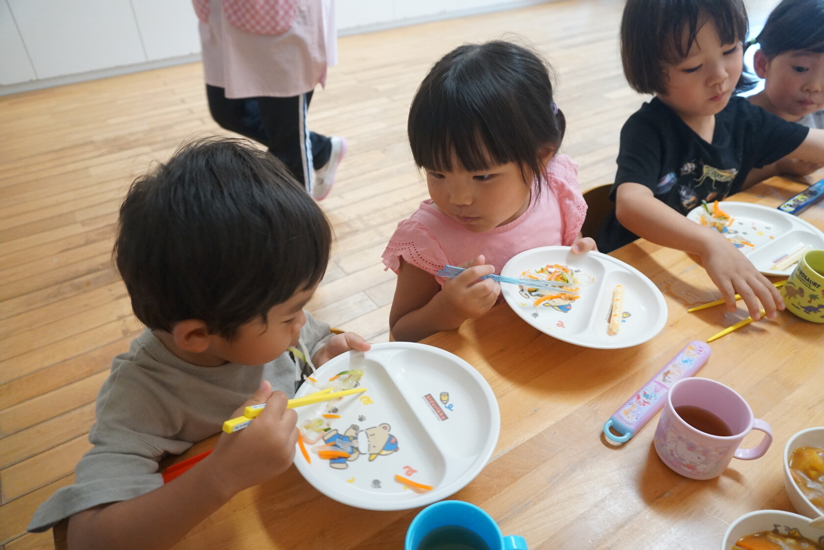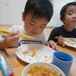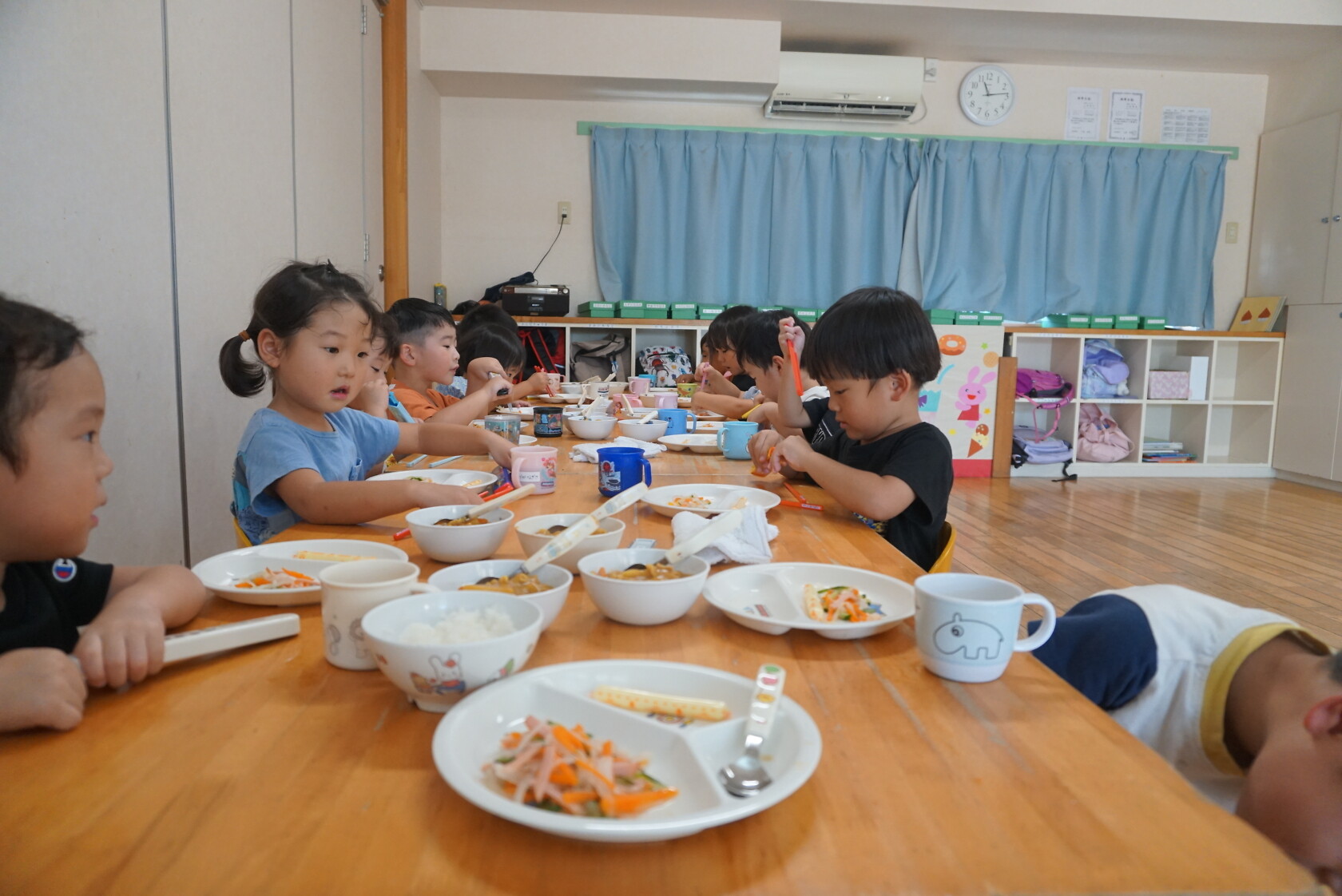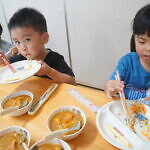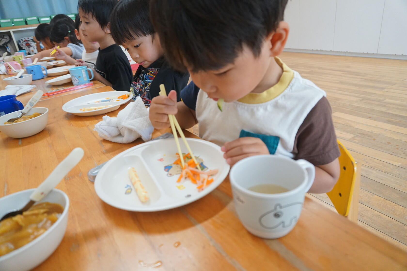 今日は、みんなの大好きなカレーでした。カメラを向けると大きな口を開け、食べているところを見せてくれた子ども達でした✨