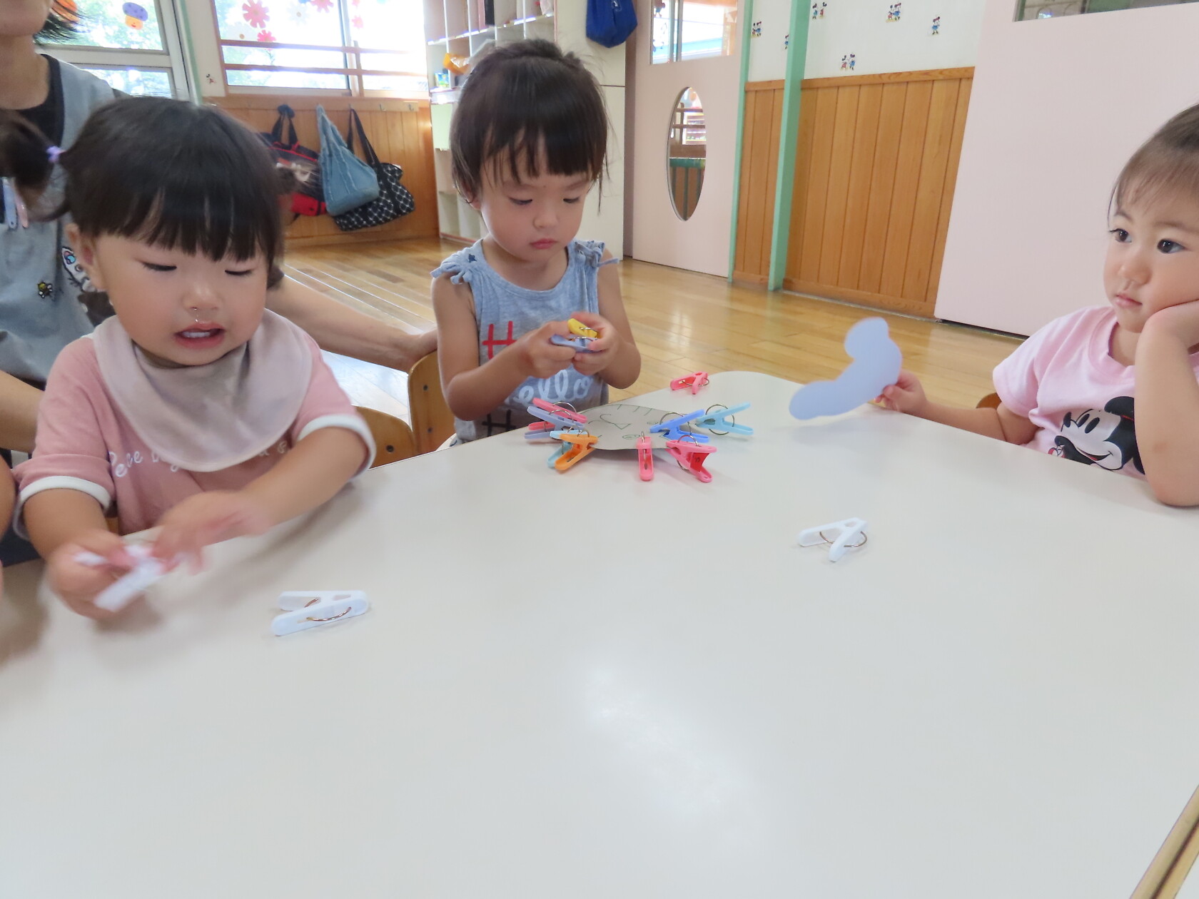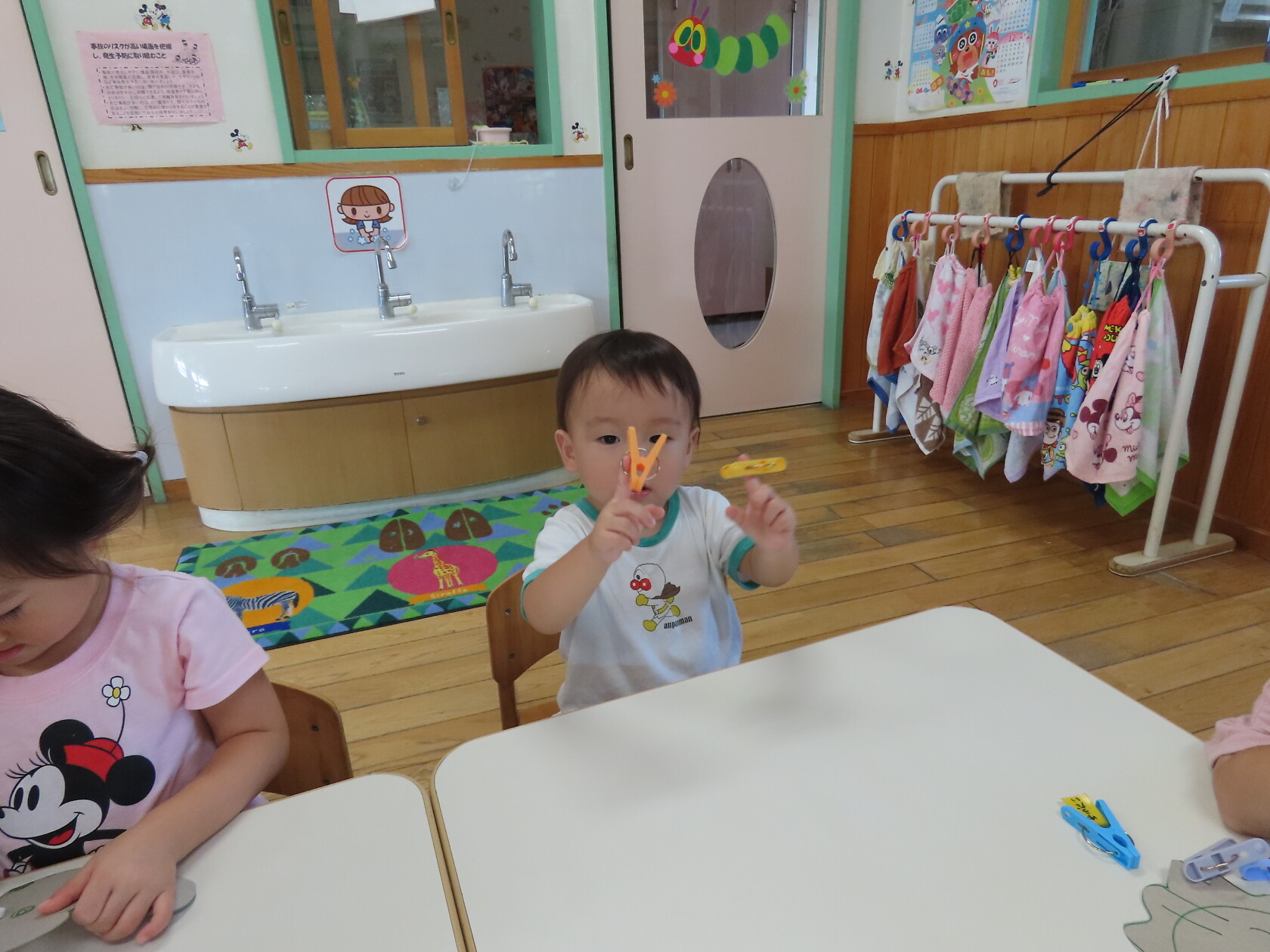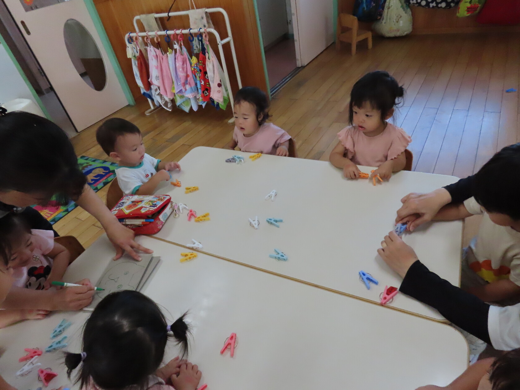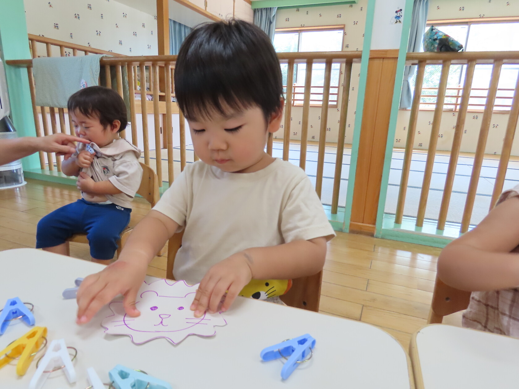 今日のできごと(さくら) 公開済み: 2024年9月12日更新: 2024年9月12日 今日は、指先の運動として洗濯ばさみで遊びました。指先に力が入らずうまく開けない子もいましたが、一緒に練習をして、できるように✨開けるようになったら、繋げたり、かわいい動物の顔につけてヒゲやライオンのたてがみに見立てて楽しみました🎵普段はおもちゃにならない物でも集中して遊んでいました😊お家でも楽しんでみてください💕