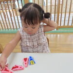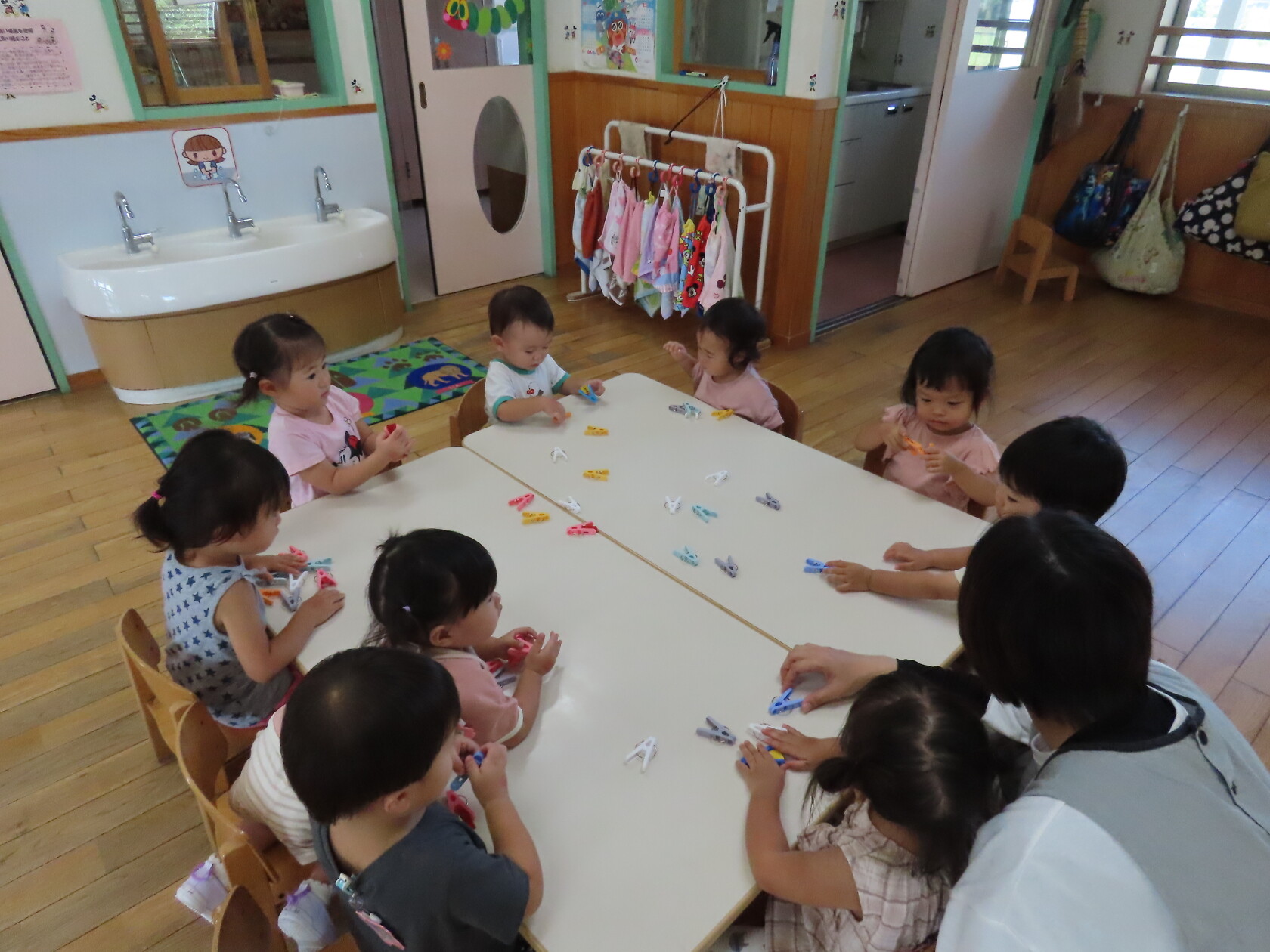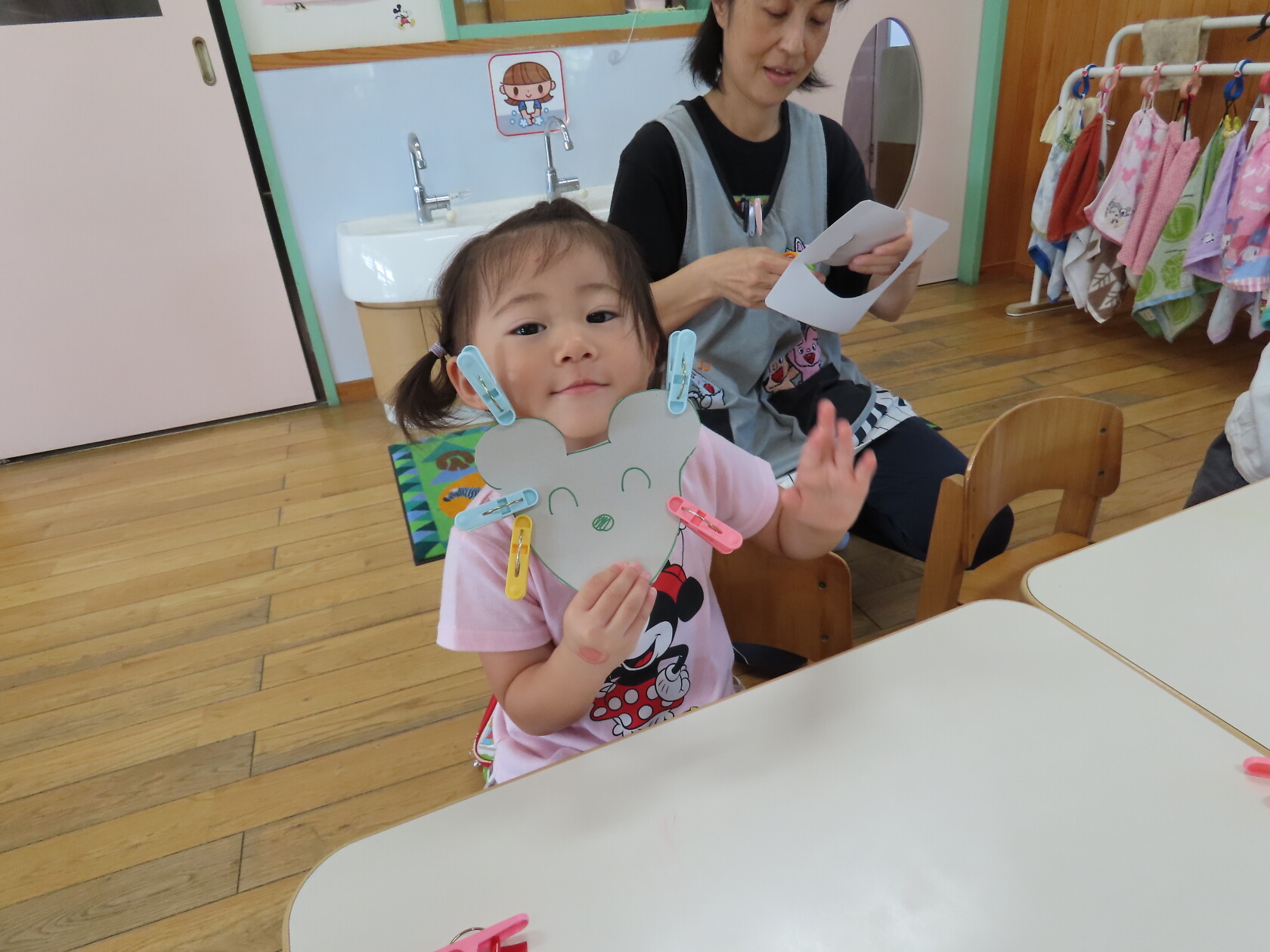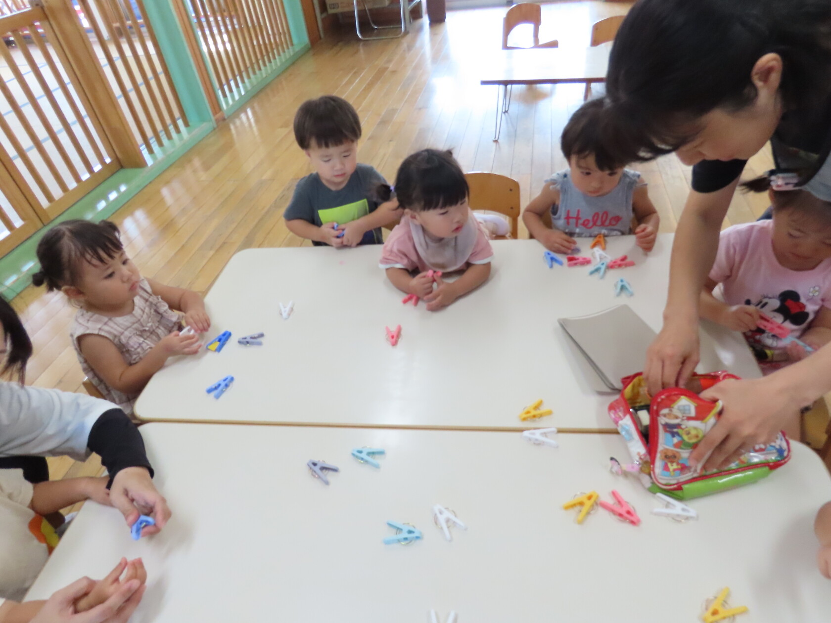 今日のできごと(さくら) 公開済み: 2024年9月12日更新: 2024年9月12日 今日は、指先の運動として洗濯ばさみで遊びました。指先に力が入らずうまく開けない子もいましたが、一緒に練習をして、できるように✨開けるようになったら、繋げたり、かわいい動物の顔につけてヒゲやライオンのたてがみに見立てて楽しみました🎵普段はおもちゃにならない物でも集中して遊んでいました😊お家でも楽しんでみてください💕