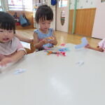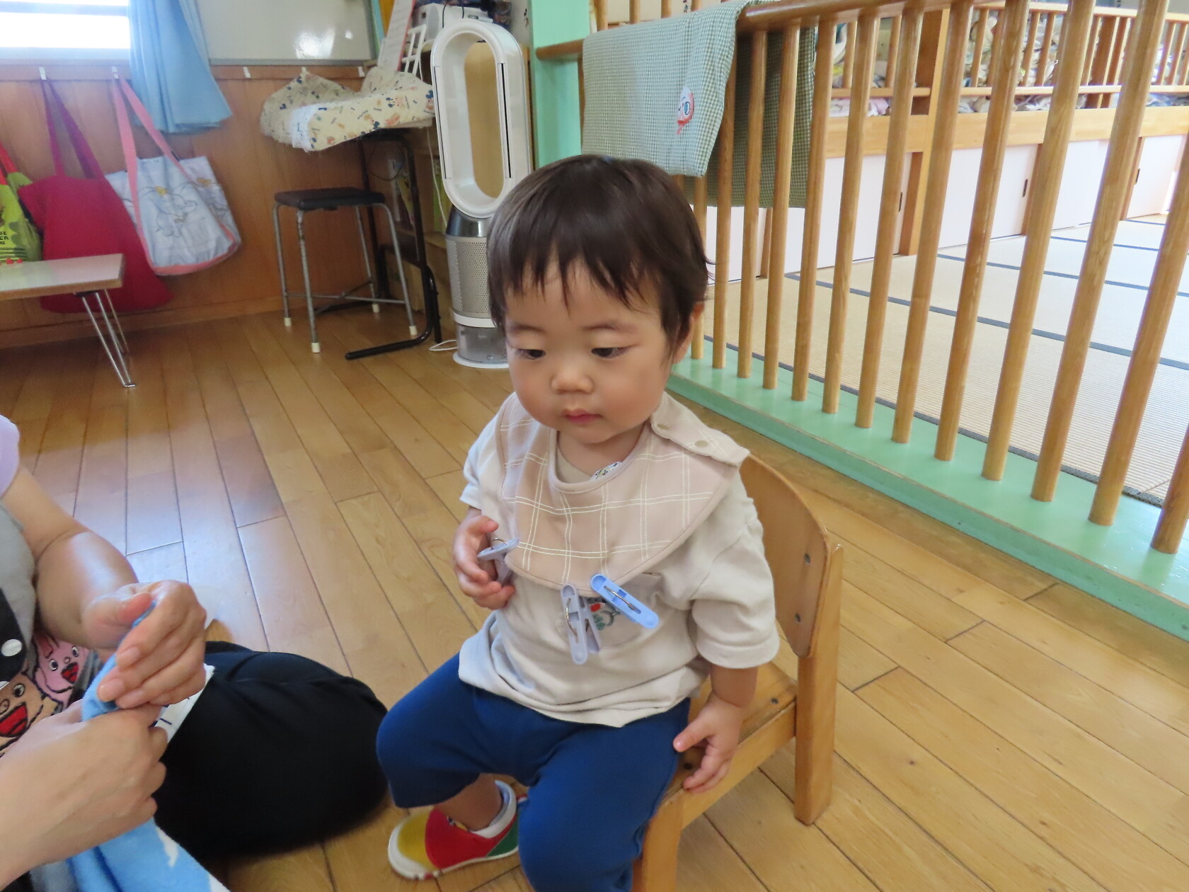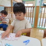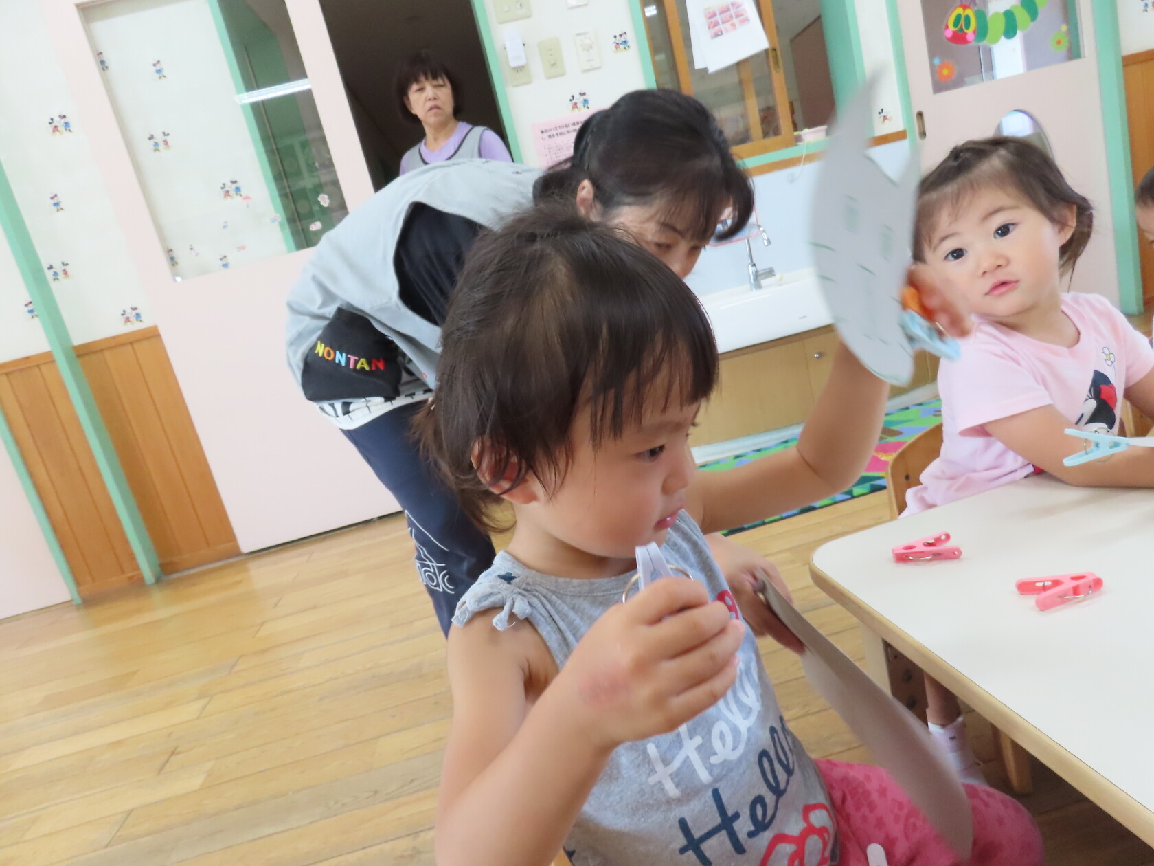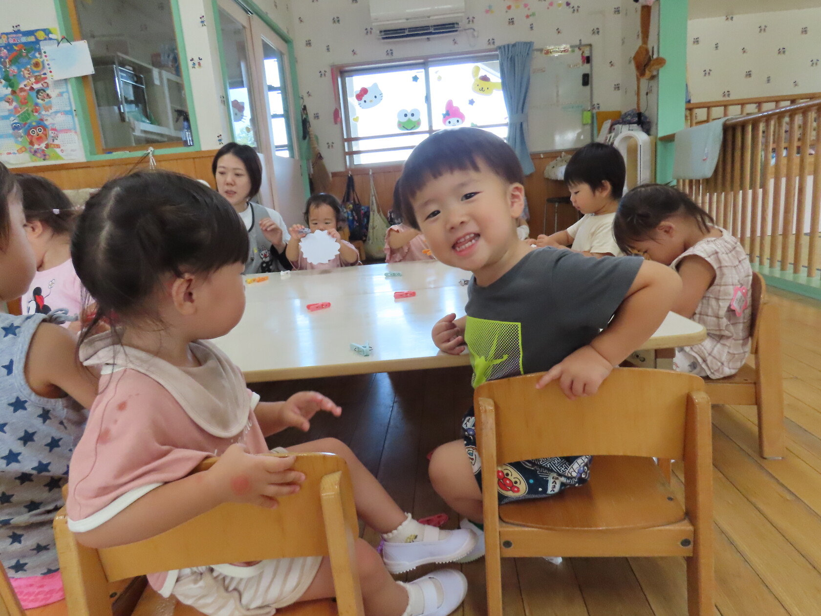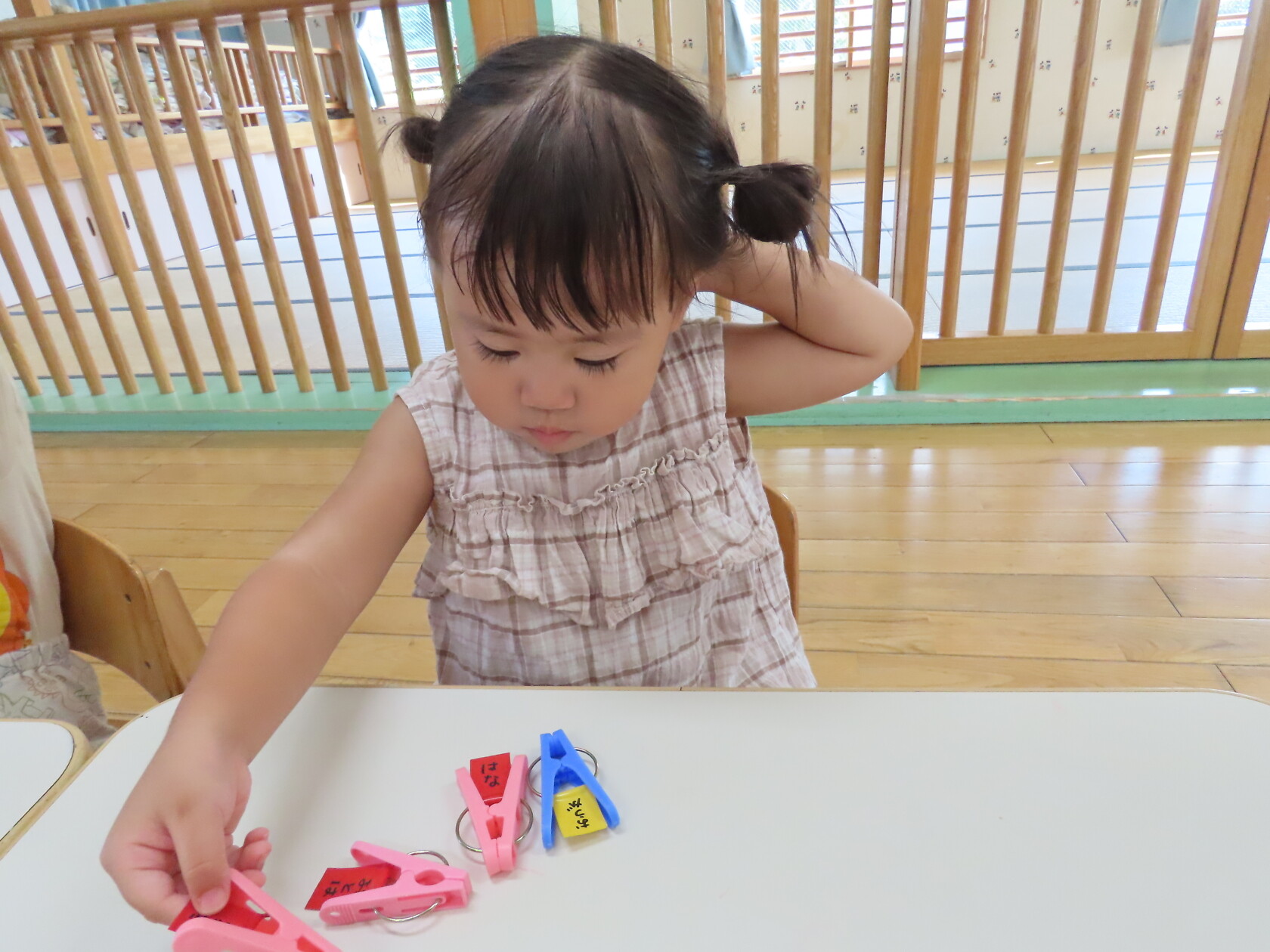 今日のできごと(さくら) 公開済み: 2024年9月12日更新: 2024年9月12日 今日は、指先の運動として洗濯ばさみで遊びました。指先に力が入らずうまく開けない子もいましたが、一緒に練習をして、できるように✨開けるようになったら、繋げたり、かわいい動物の顔につけてヒゲやライオンのたてがみに見立てて楽しみました🎵普段はおもちゃにならない物でも集中して遊んでいました😊お家でも楽しんでみてください💕