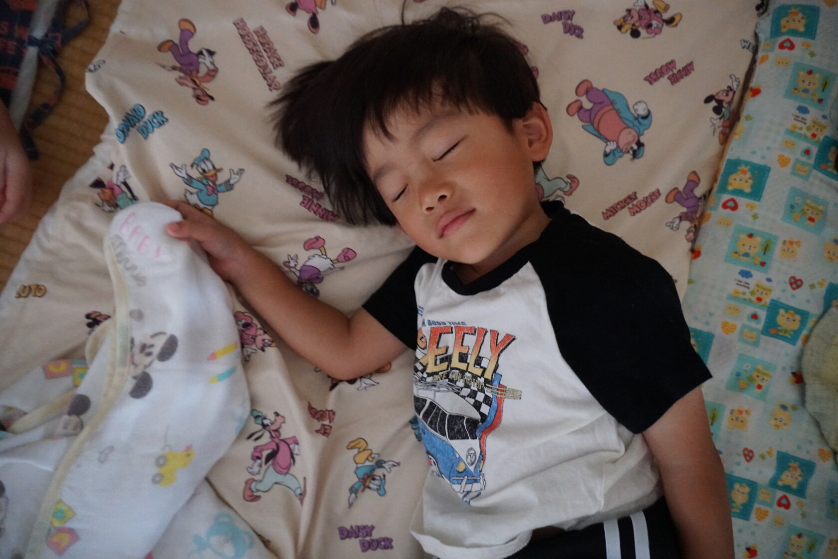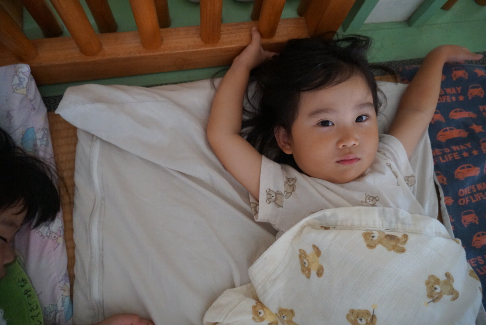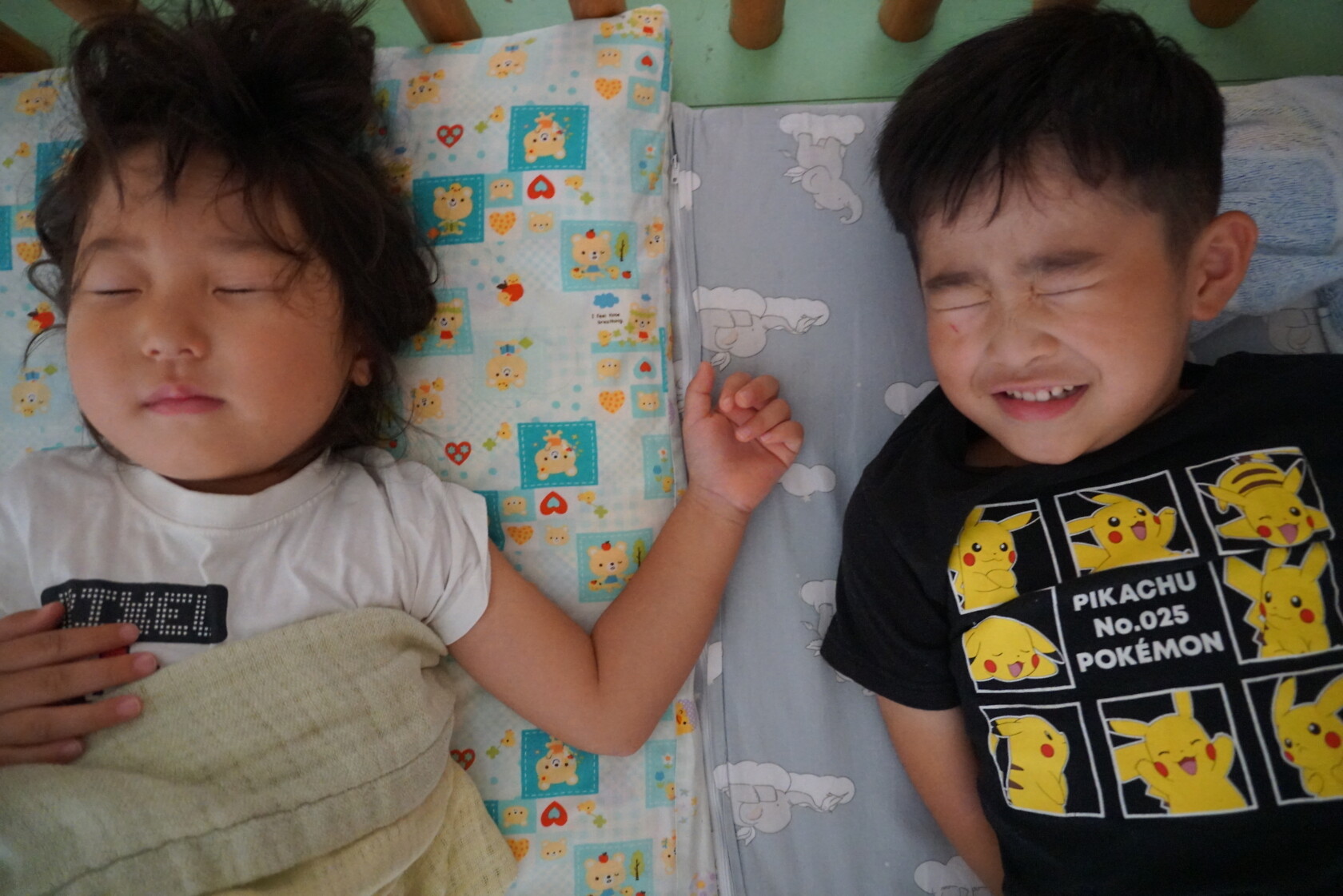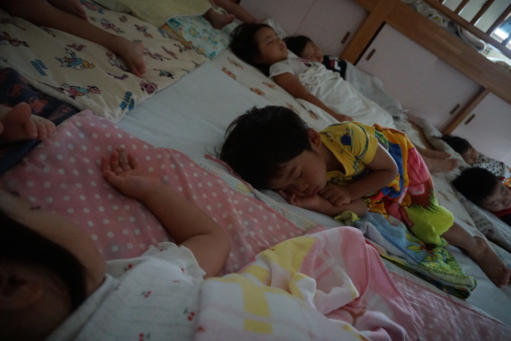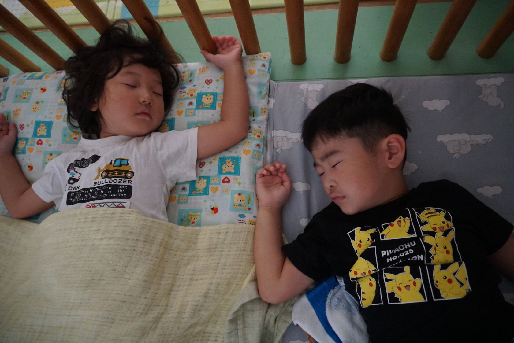 布団に入った子ども達に、「寝てるかな?」とカメラを向けると「先生寝てるよ!!」と目をつぶり用意してくる子も😂