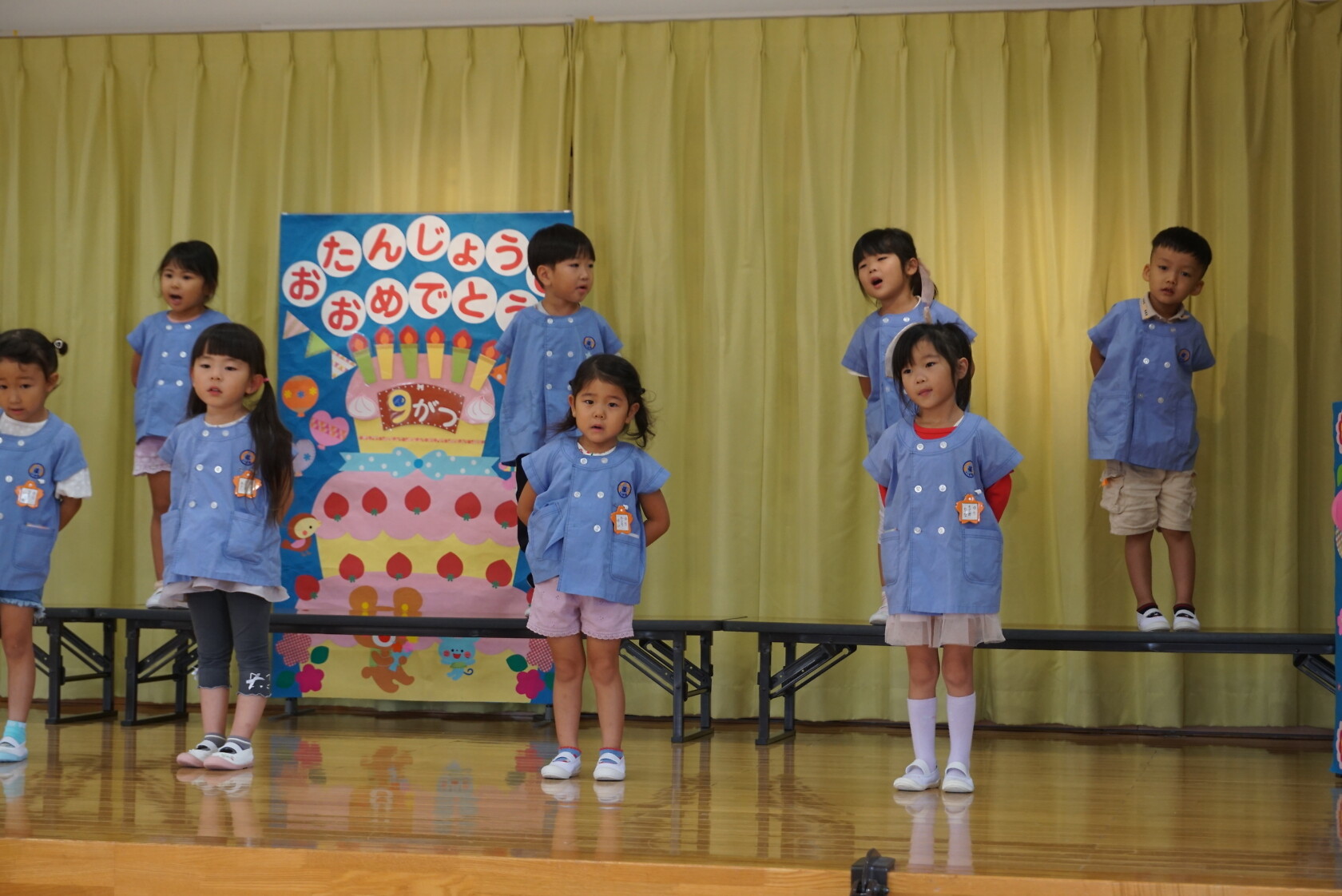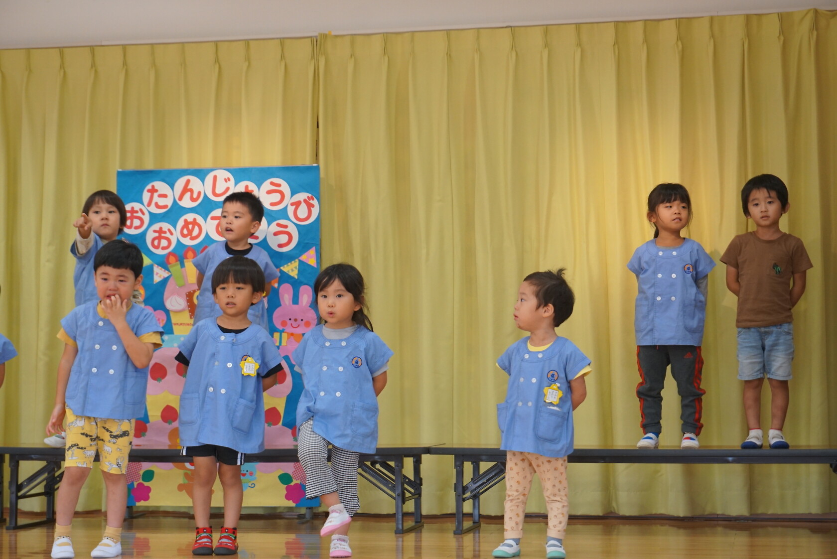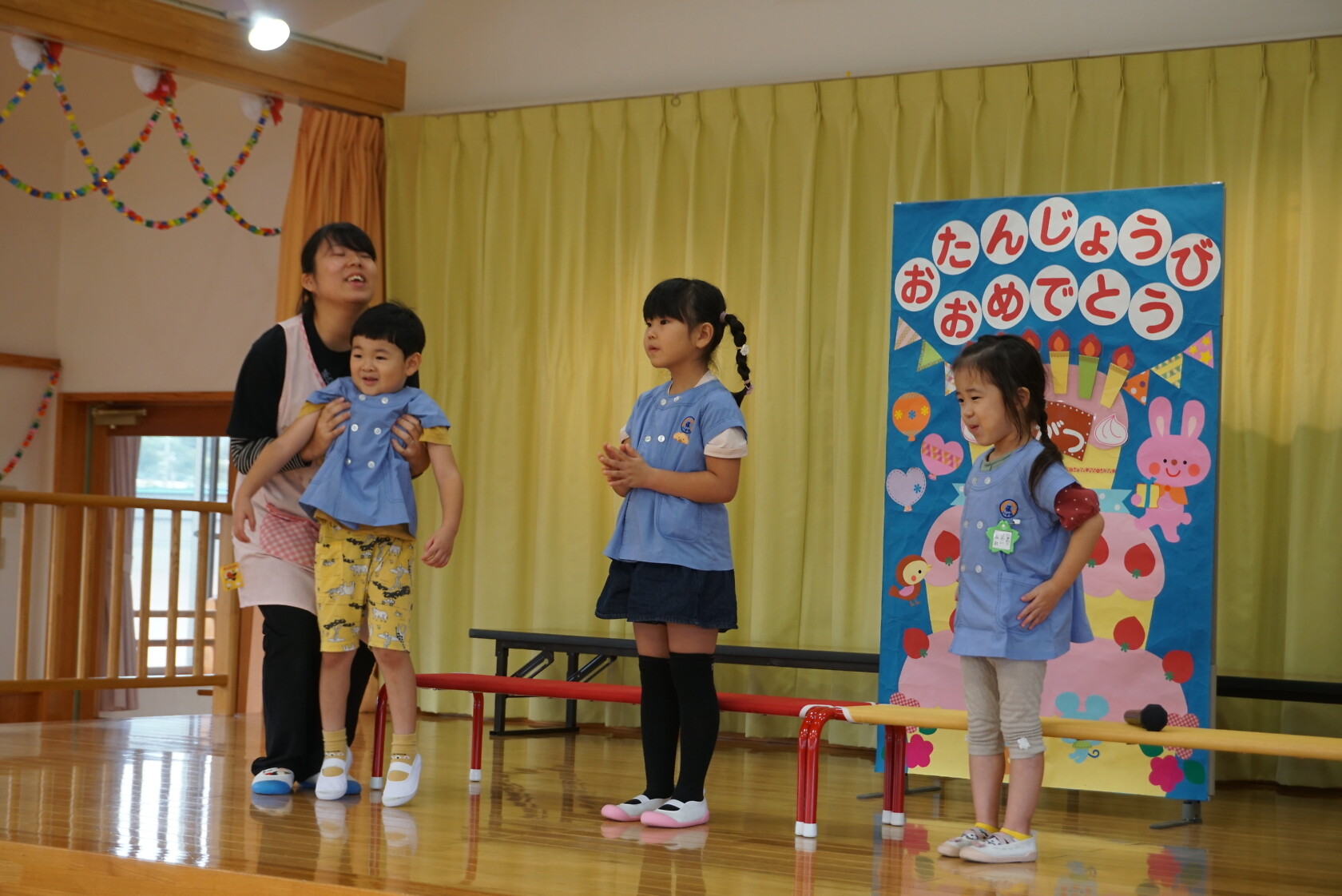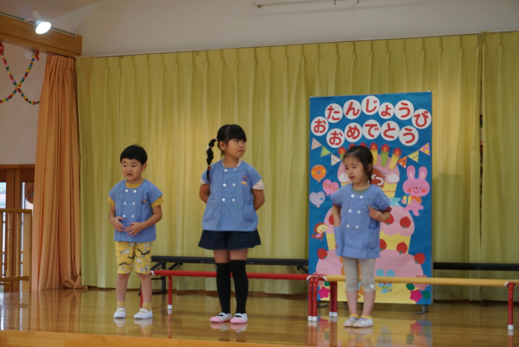 お誕生月のお友だちはひまわり組2人、すみれ組1人でした。舞台に登りお父さんやお母さんを見つけると可愛らしい笑顔😊を