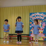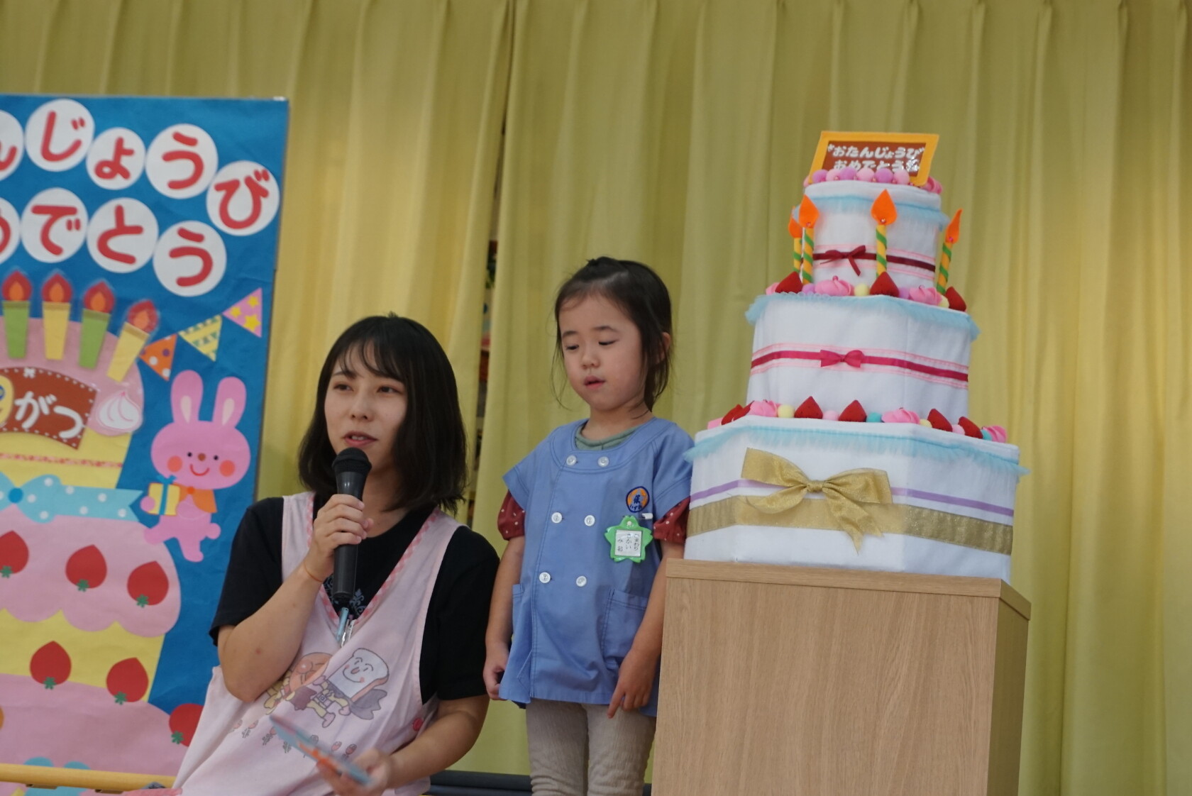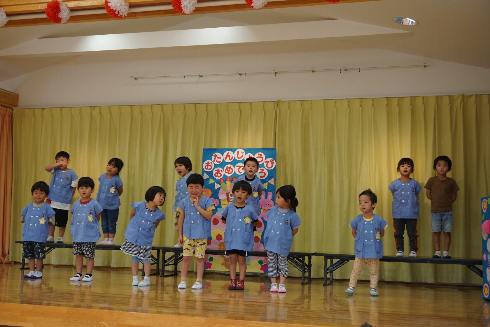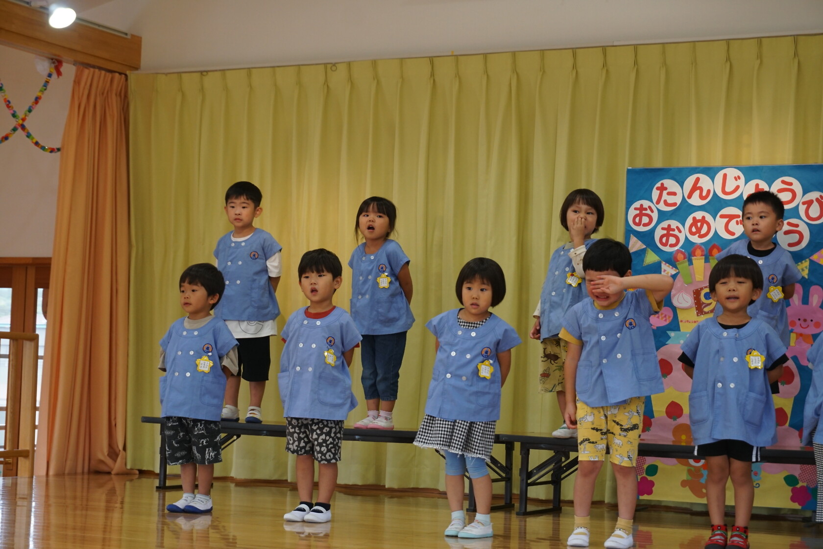 お誕生月のお友だちはひまわり組2人、すみれ組1人でした。舞台に登りお父さんやお母さんを見つけると可愛らしい笑顔😊を