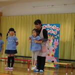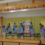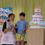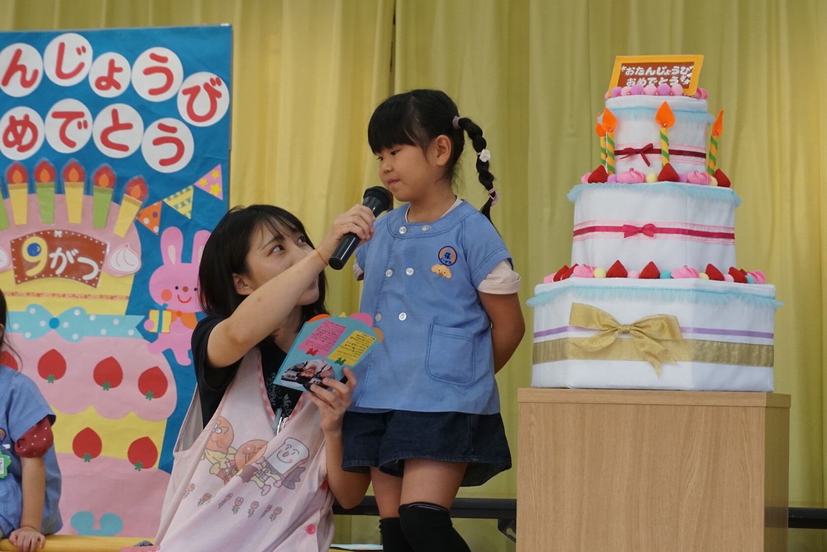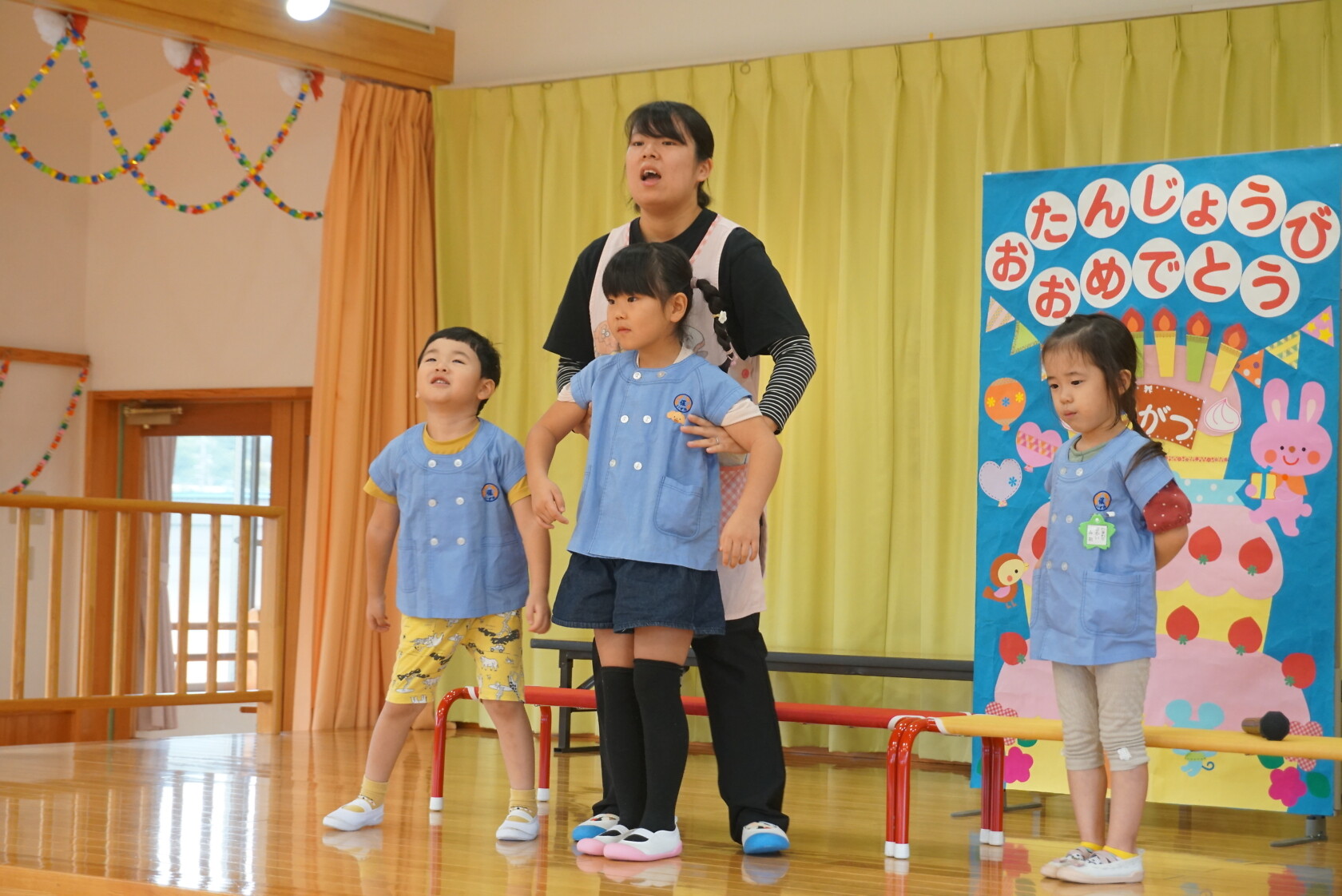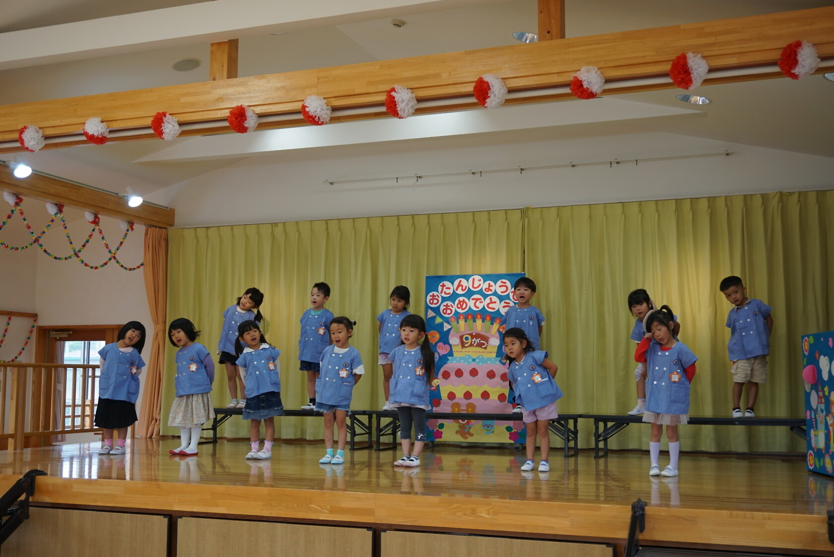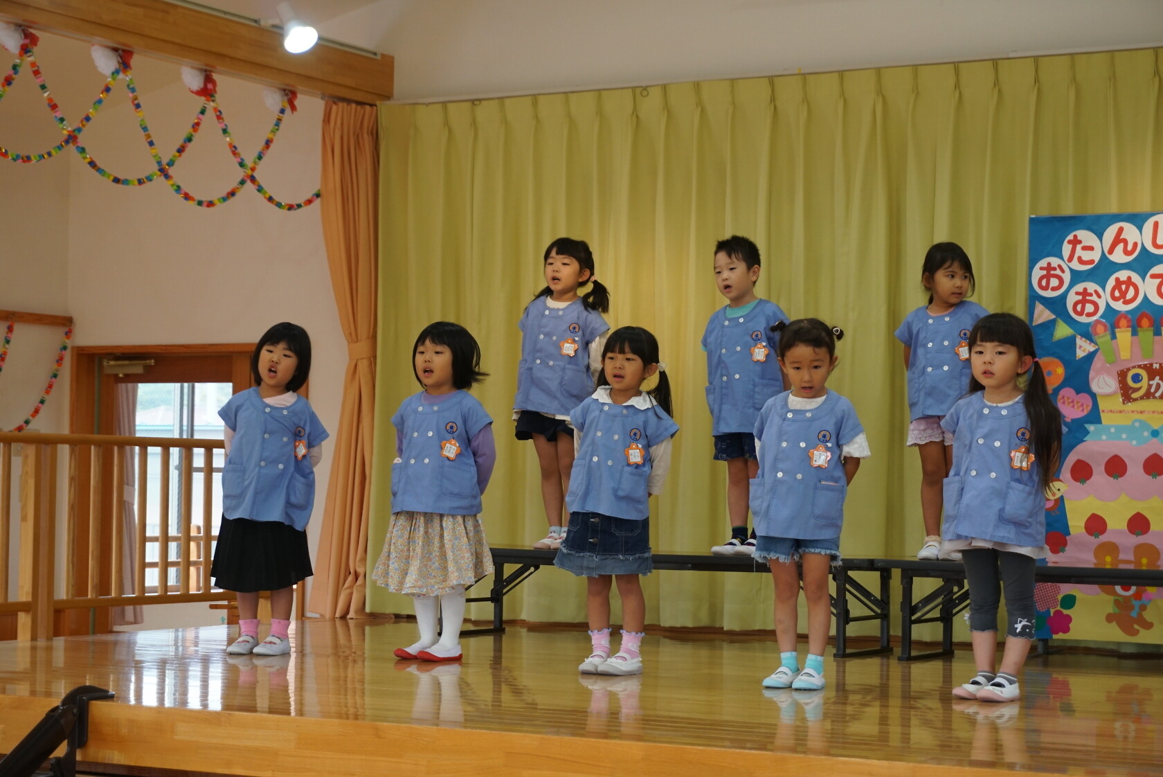 お誕生月のお友だちはひまわり組2人、すみれ組1人でした。舞台に登りお父さんやお母さんを見つけると可愛らしい笑顔😊を