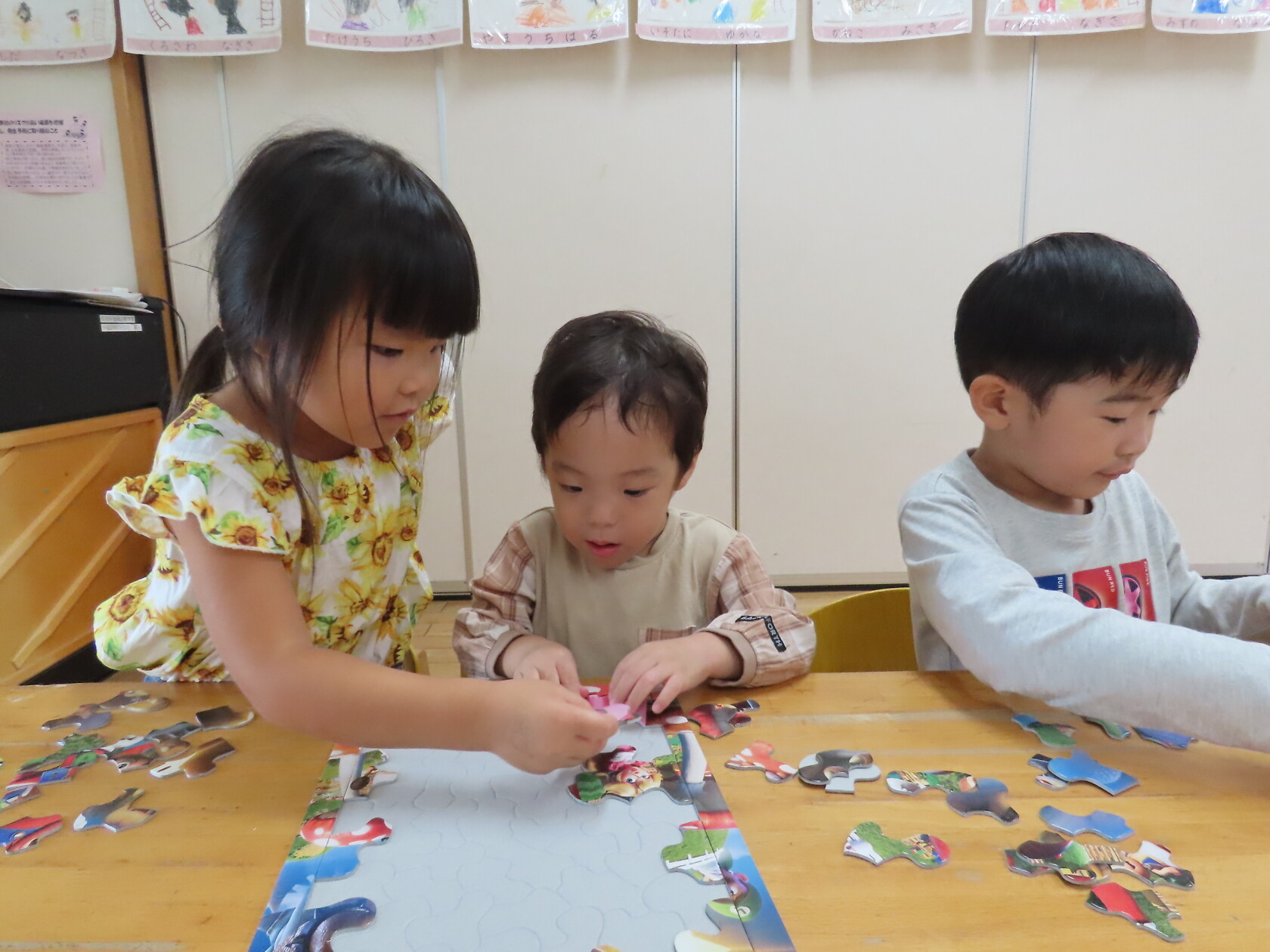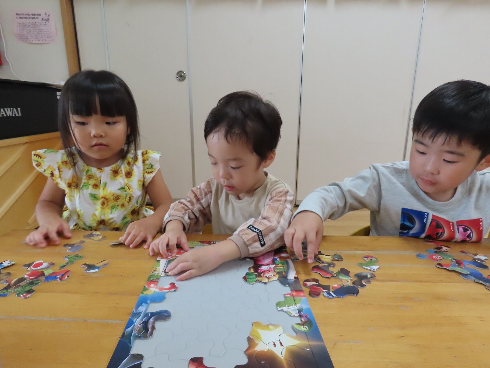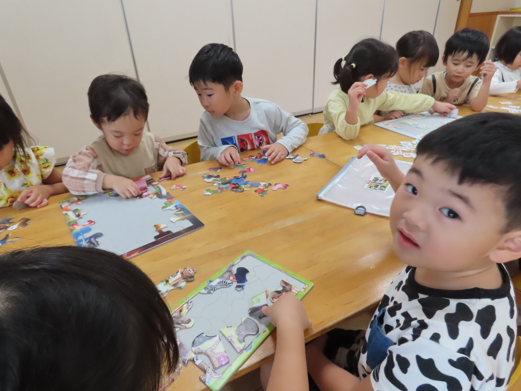今日のできごと(すみれ) 公開済み: 2024年10月8日更新: 2024年10月8日 今日は、未満児さんのダンスを見学した後、すみれぐみさんも一緒にダンスをしたり、親子競技や鼓笛パレードの練習をしました✨ 今、すみれぐみさんではパズルブーム到来‼ 少し時間があると「先生、パズルやりたーい!!」とみんなから声があがります。 今日は、パズルを楽しんでいる姿のひとこまです😊