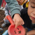 手を真っ黒にして、一生懸命に掘っていました。