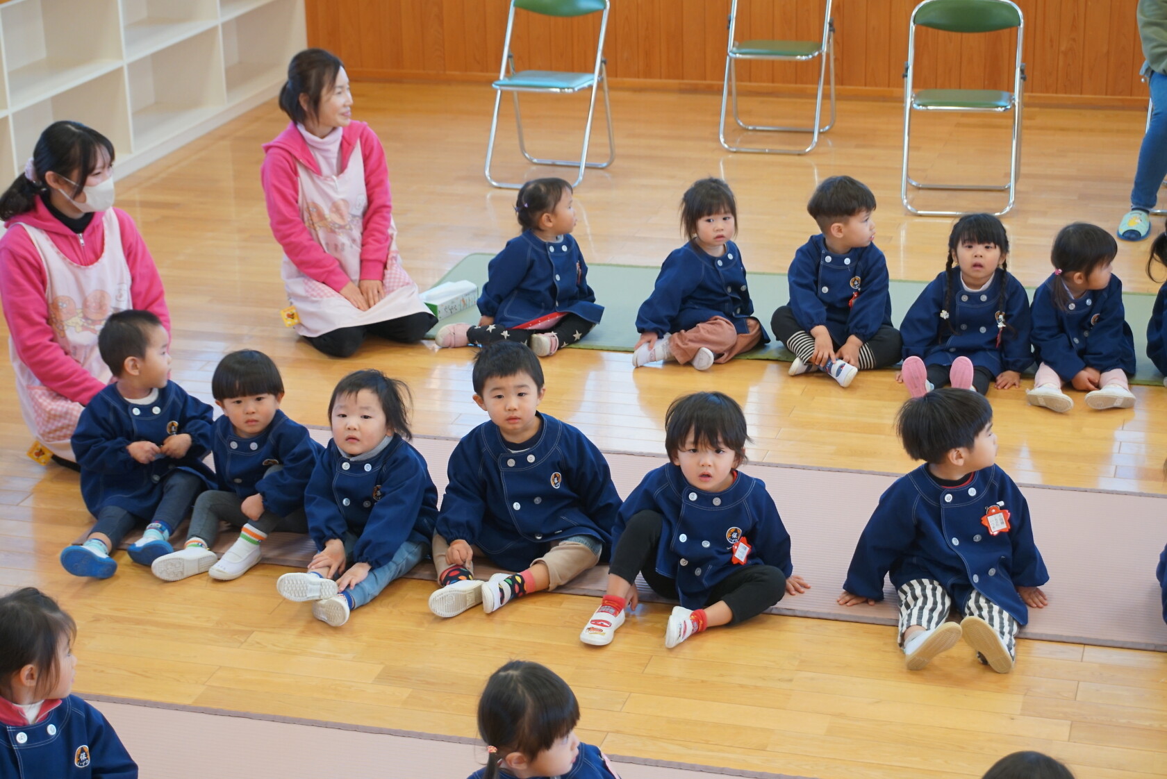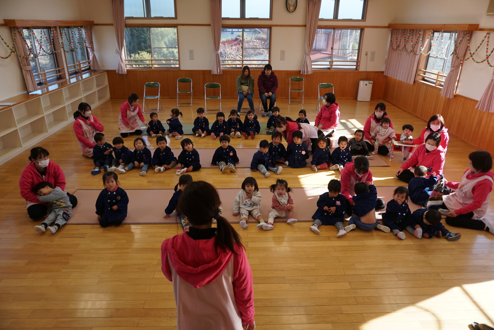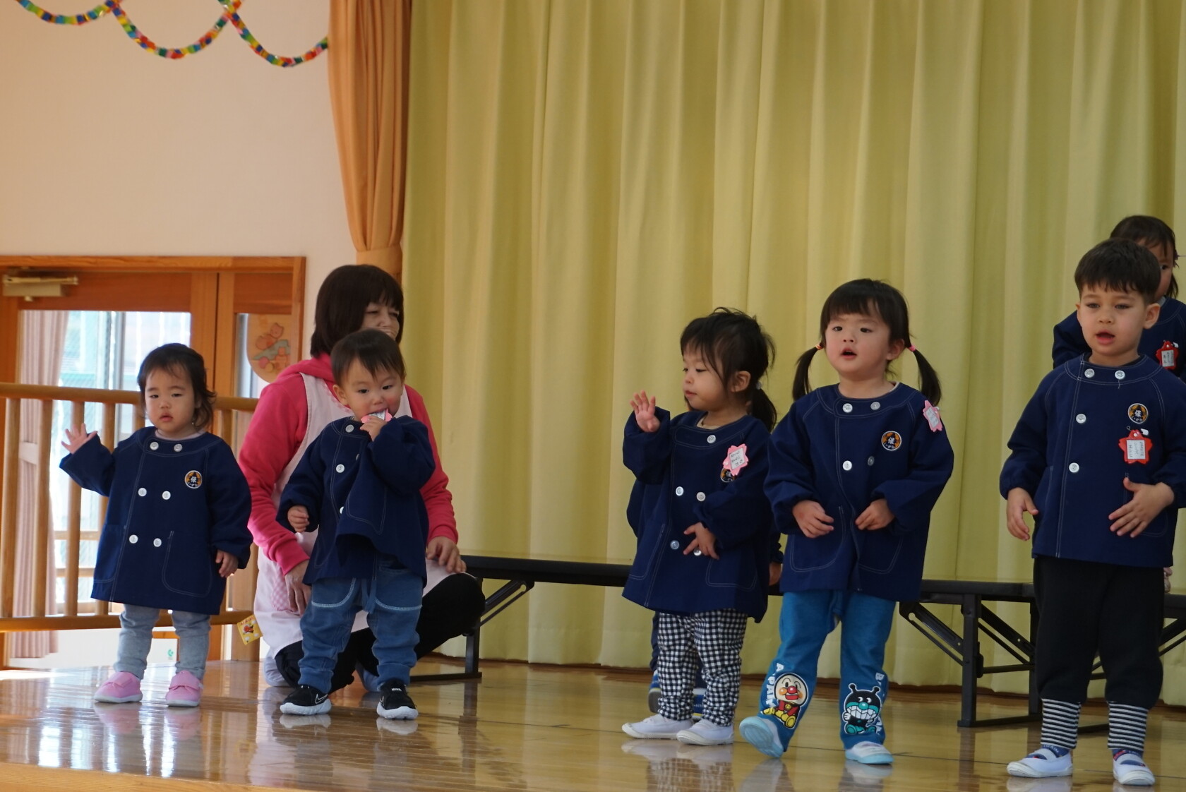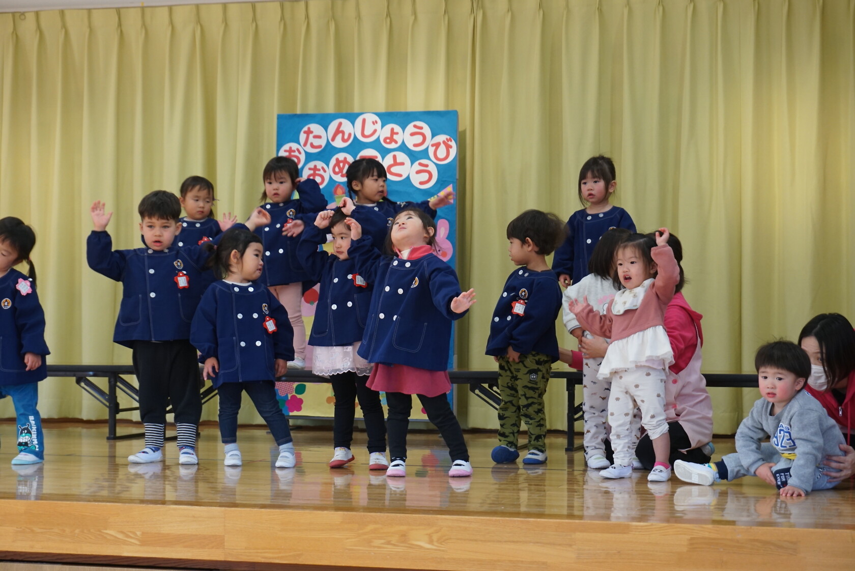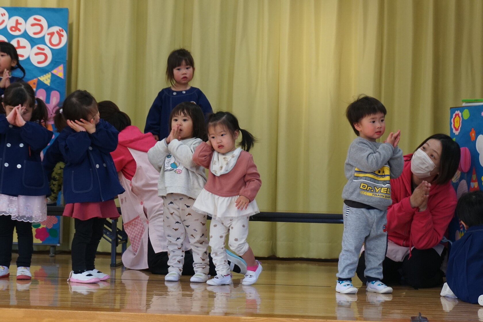 今月より本園のさくら組とちゅうりっぷ組は、合同で発表することになりました。小規模も本園も2歳児さんが手本となり、小さい子も真似をして、元気いっぱい発表することが出来ました!!