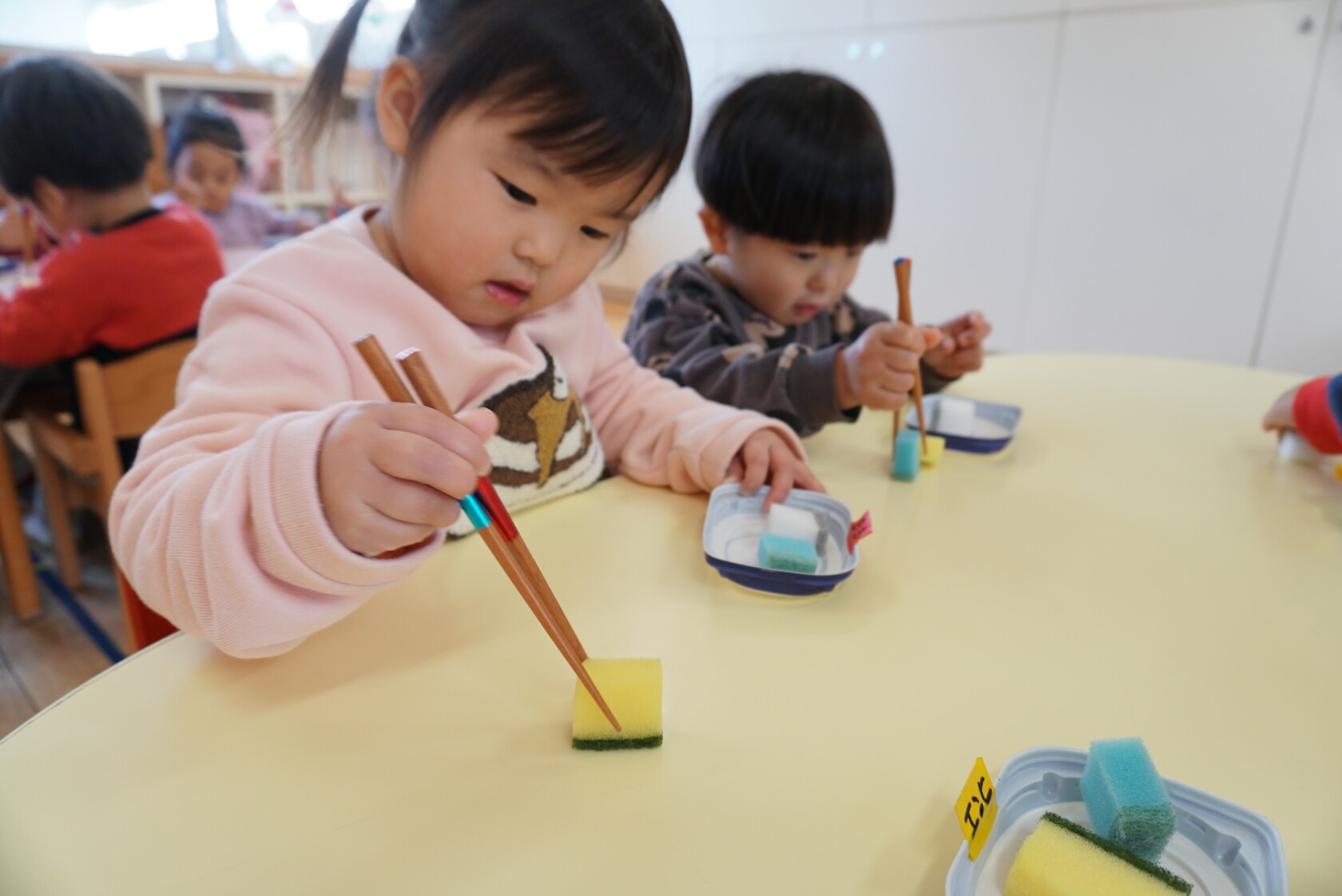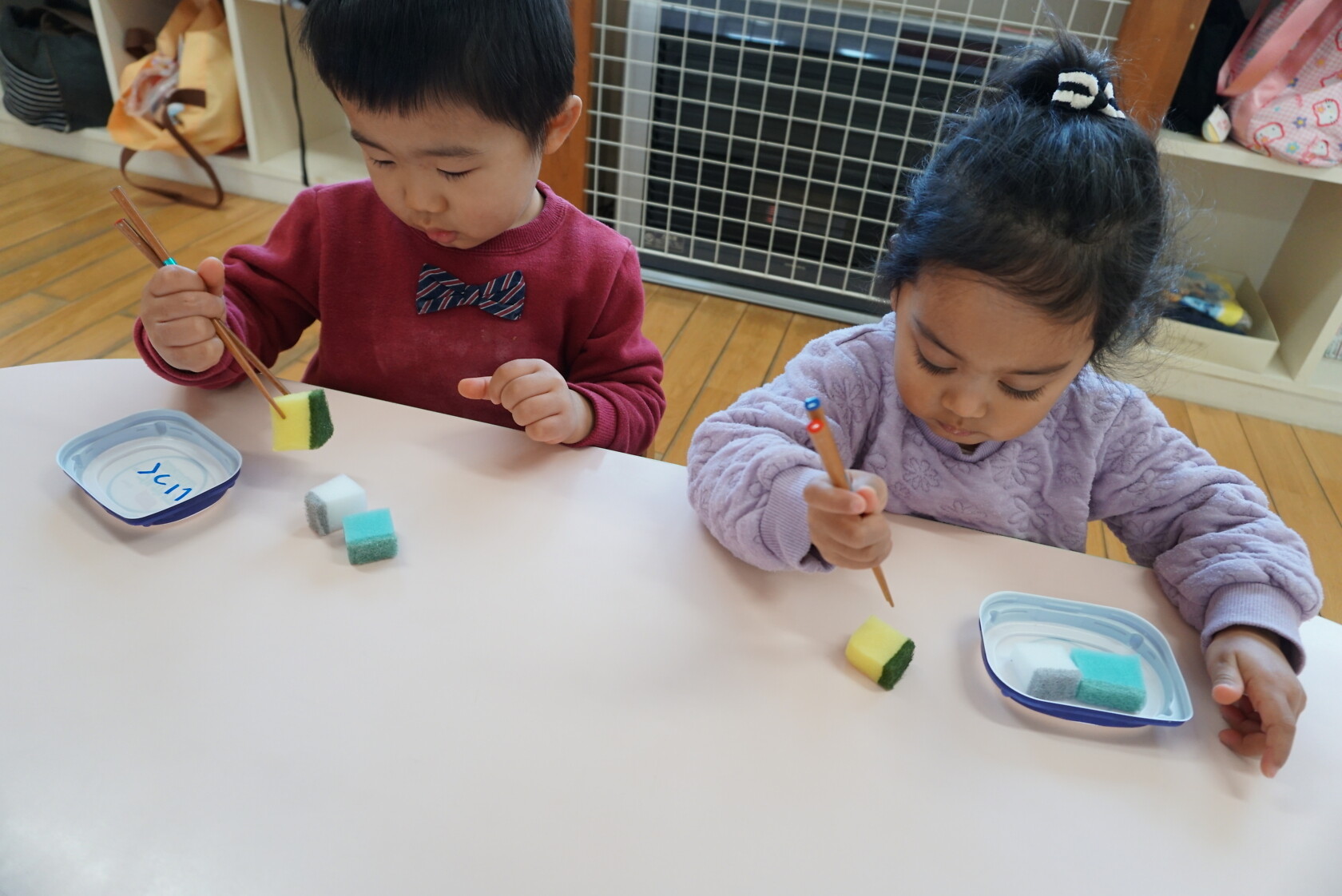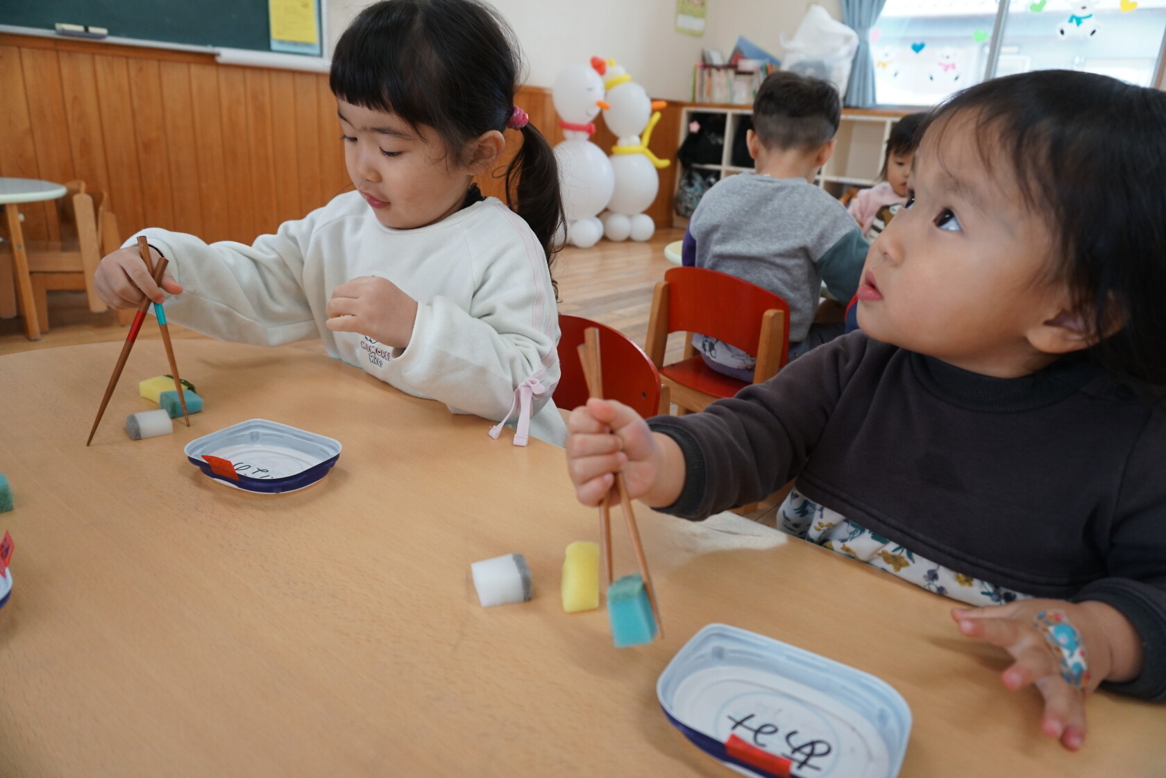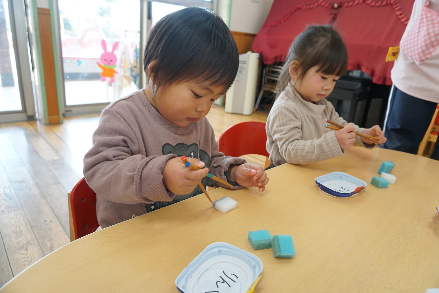 今日のできごと(ちゅうりっぷ・小規模ちゅうりっぷ) 公開済み: 2024年12月25日更新: 2025年8月7日 今日は本園のちゅうりっぷさんと、小規模のちゅうりっぷさん合同でお箸の練習をしました! 先週から始まったお箸の練習ですが、毎日少しずつ練習を重ね、今はスポンジをつかめるように頑張っているとことです💪 年末年始のお休み中、ぜひお箸での食事にチャレンジしてみて下さいね✨