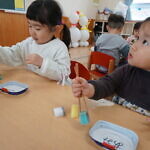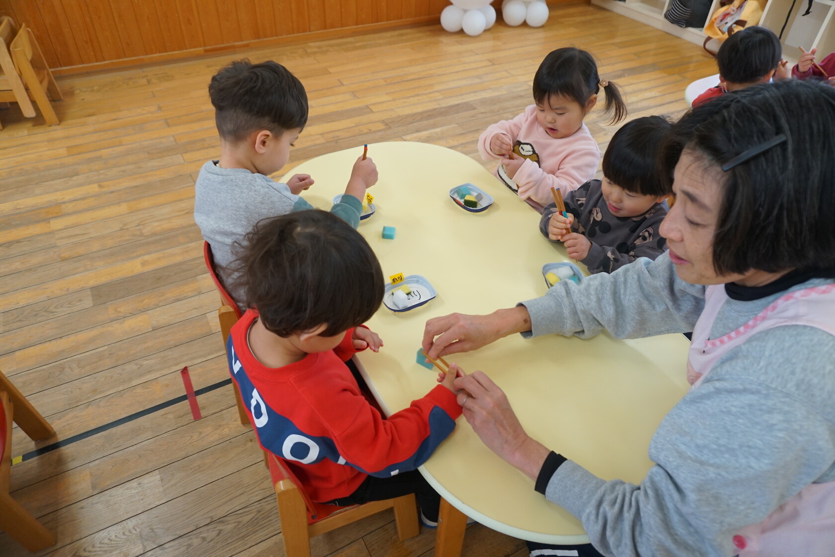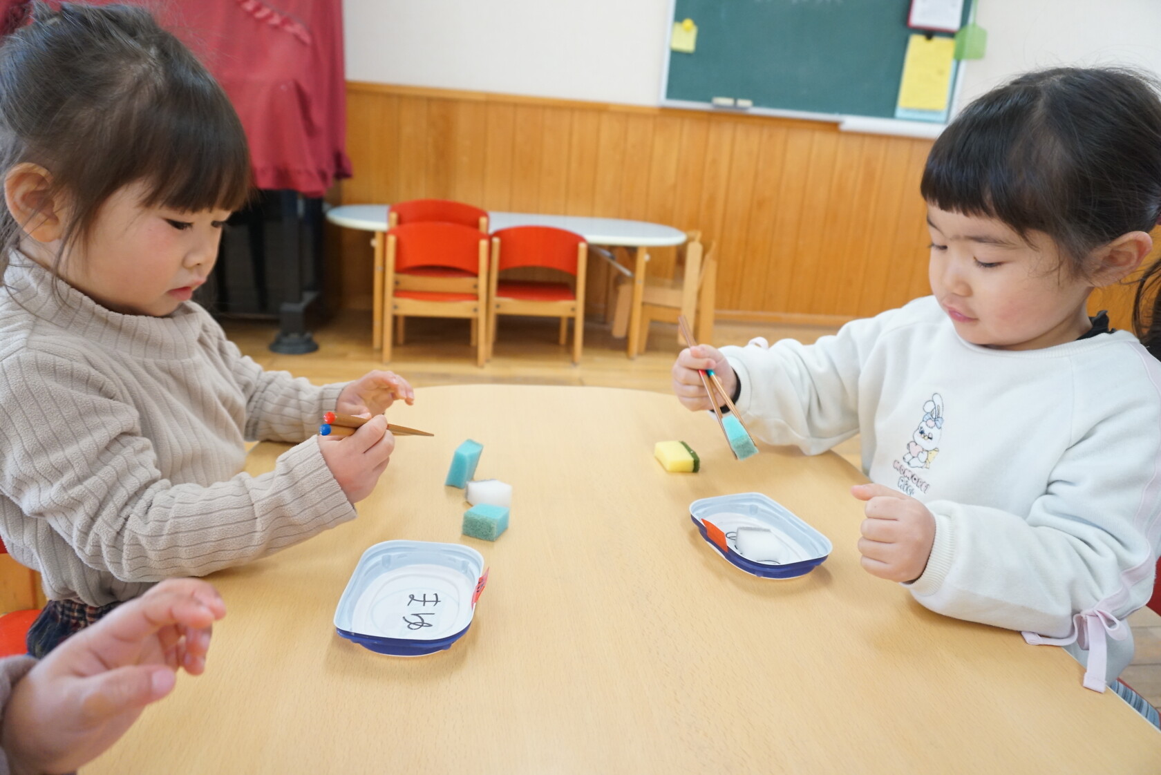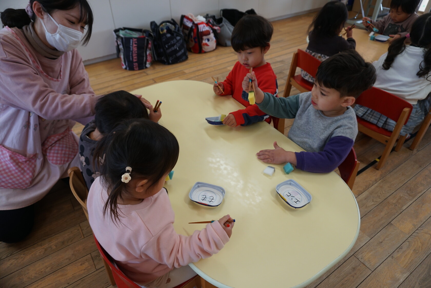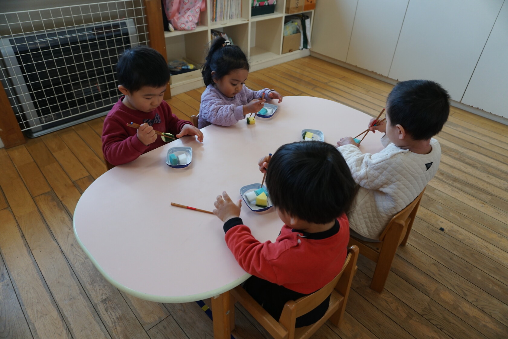 今日のできごと(ちゅうりっぷ・小規模ちゅうりっぷ) 公開済み: 2024年12月25日更新: 2025年8月7日 今日は本園のちゅうりっぷさんと、小規模のちゅうりっぷさん合同でお箸の練習をしました! 先週から始まったお箸の練習ですが、毎日少しずつ練習を重ね、今はスポンジをつかめるように頑張っているとことです💪 年末年始のお休み中、ぜひお箸での食事にチャレンジしてみて下さいね✨
