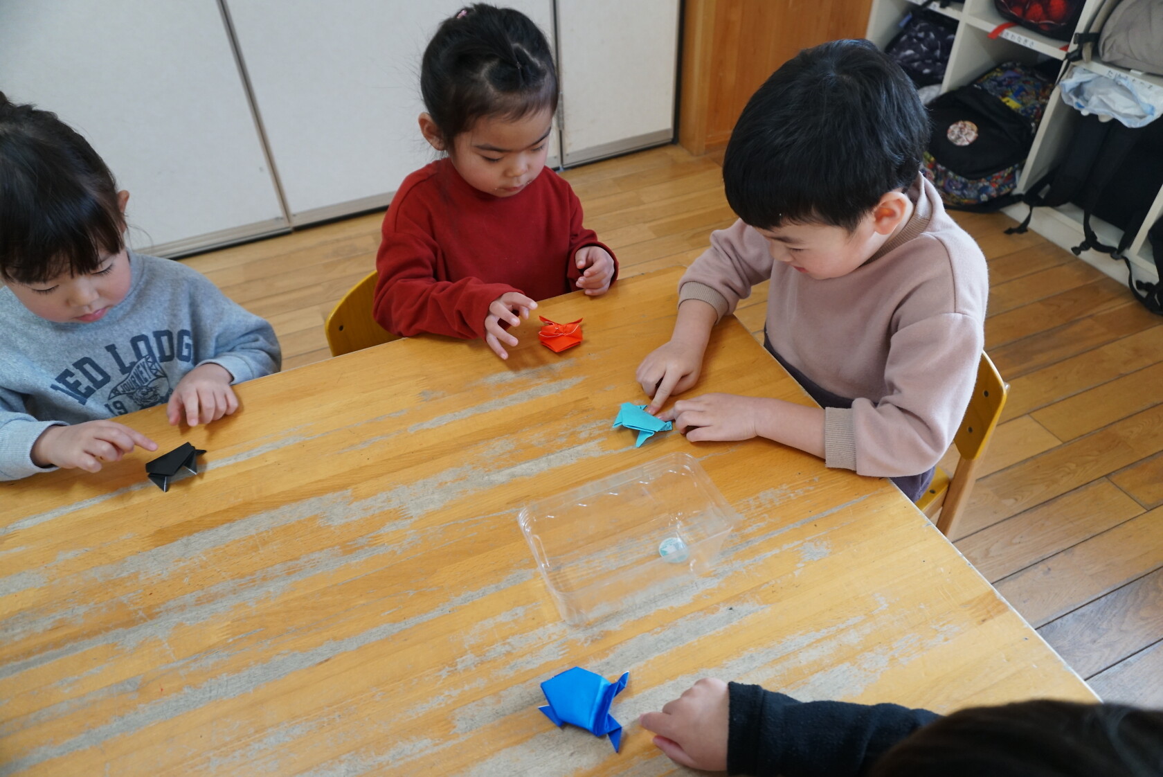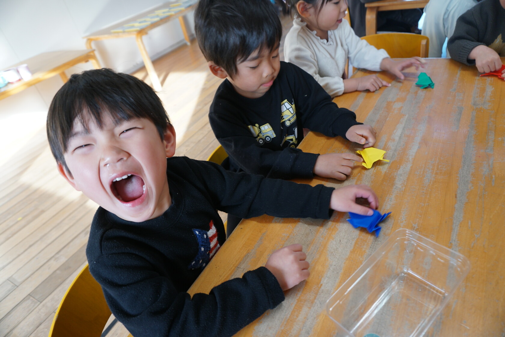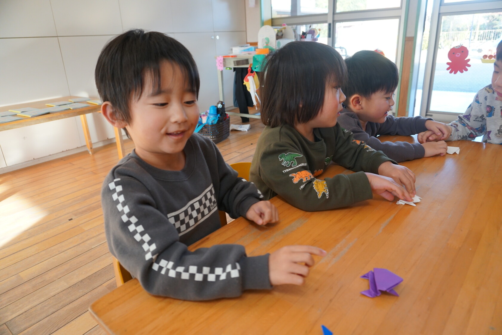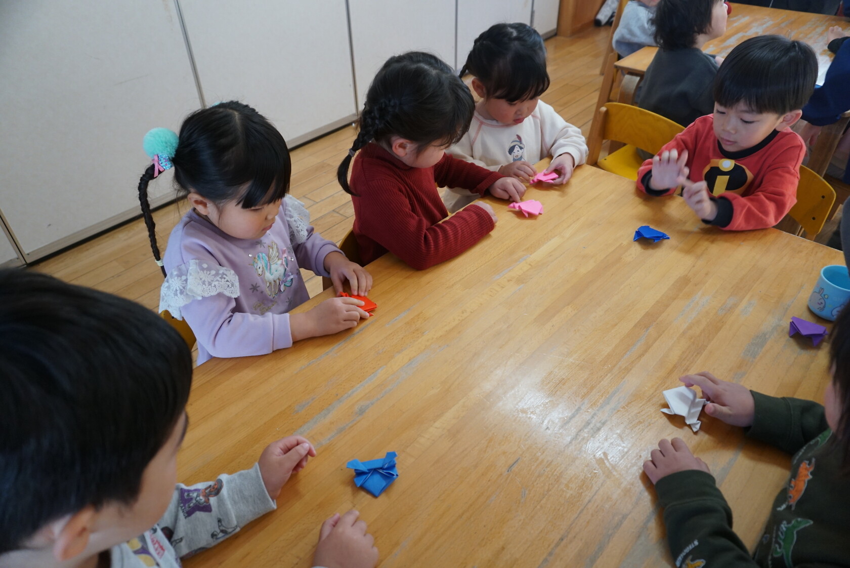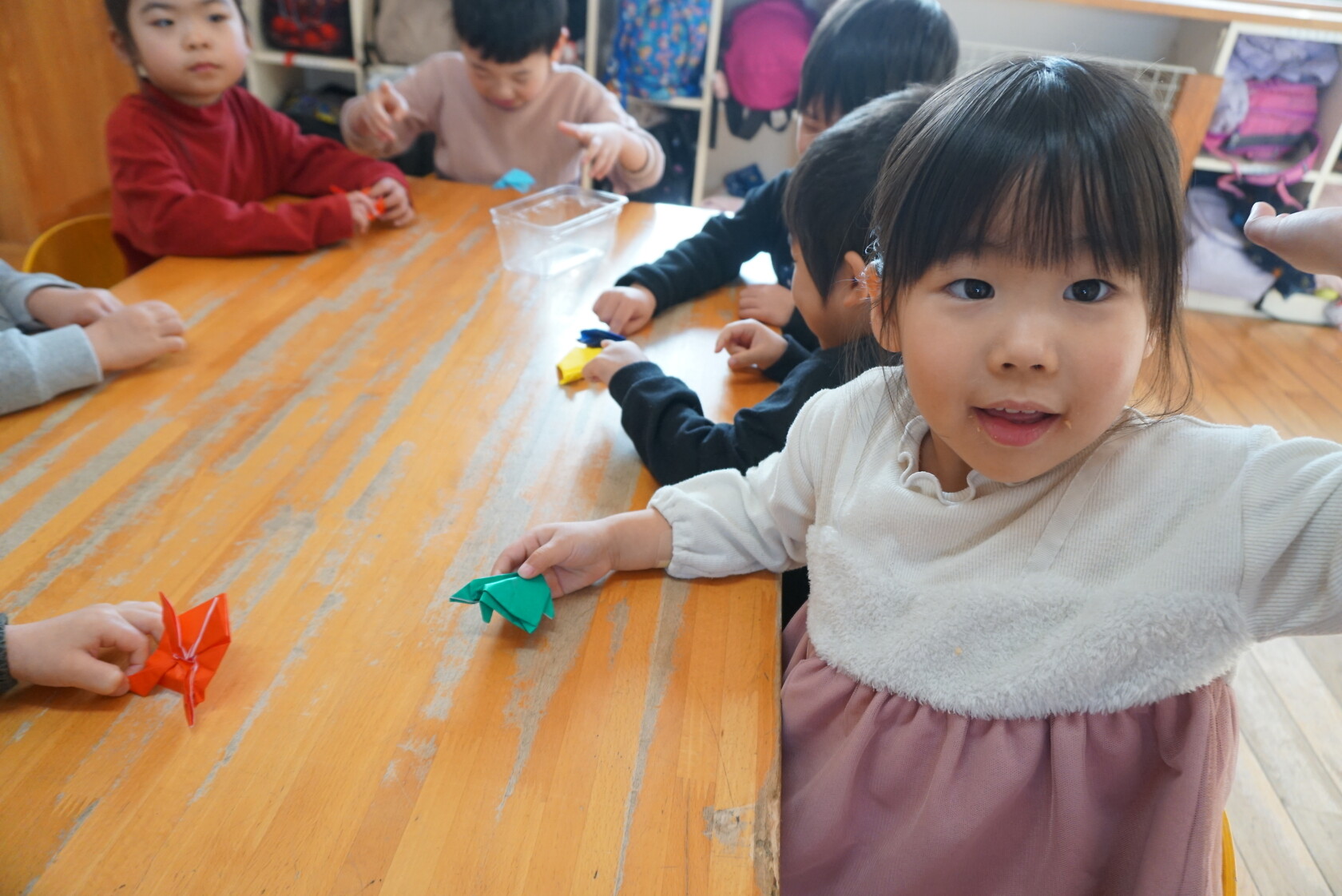 また今日はひまわりぐみさんがすみれぐみさんにピョンピョンがえる🐸の折り紙を折ってくれました😊