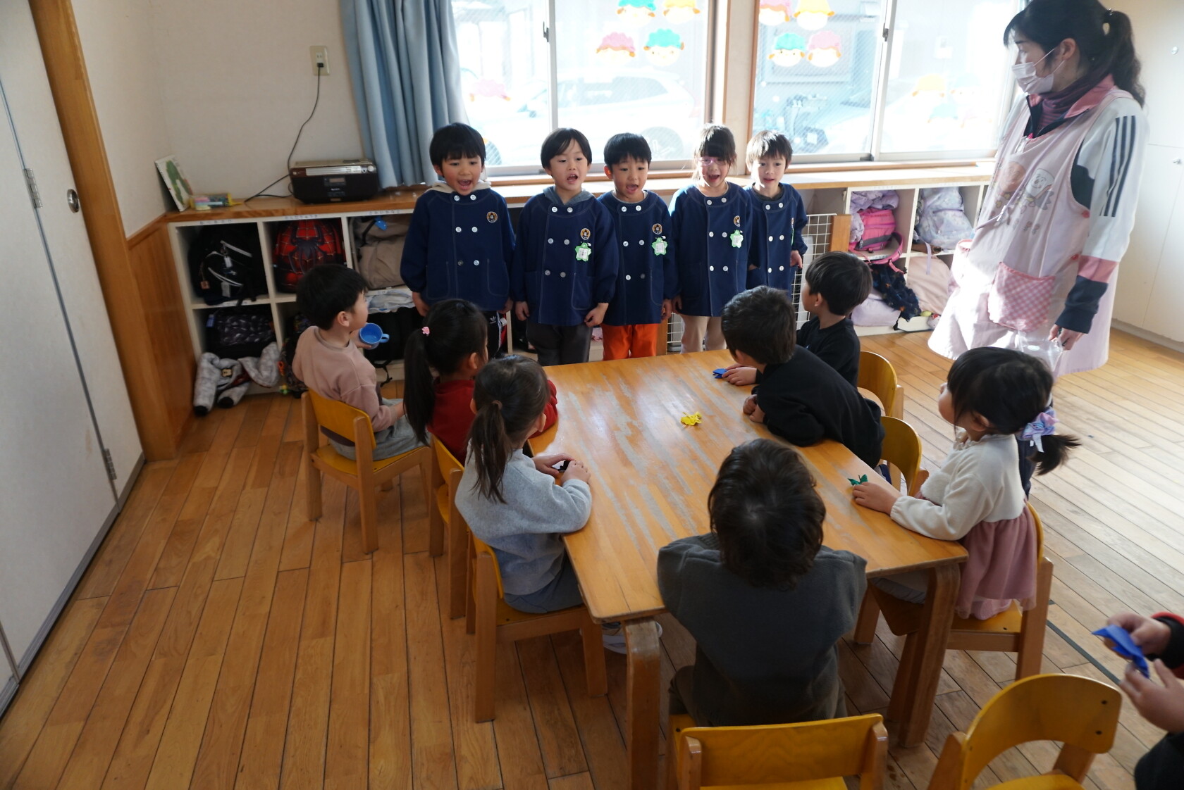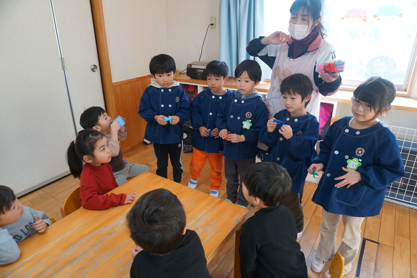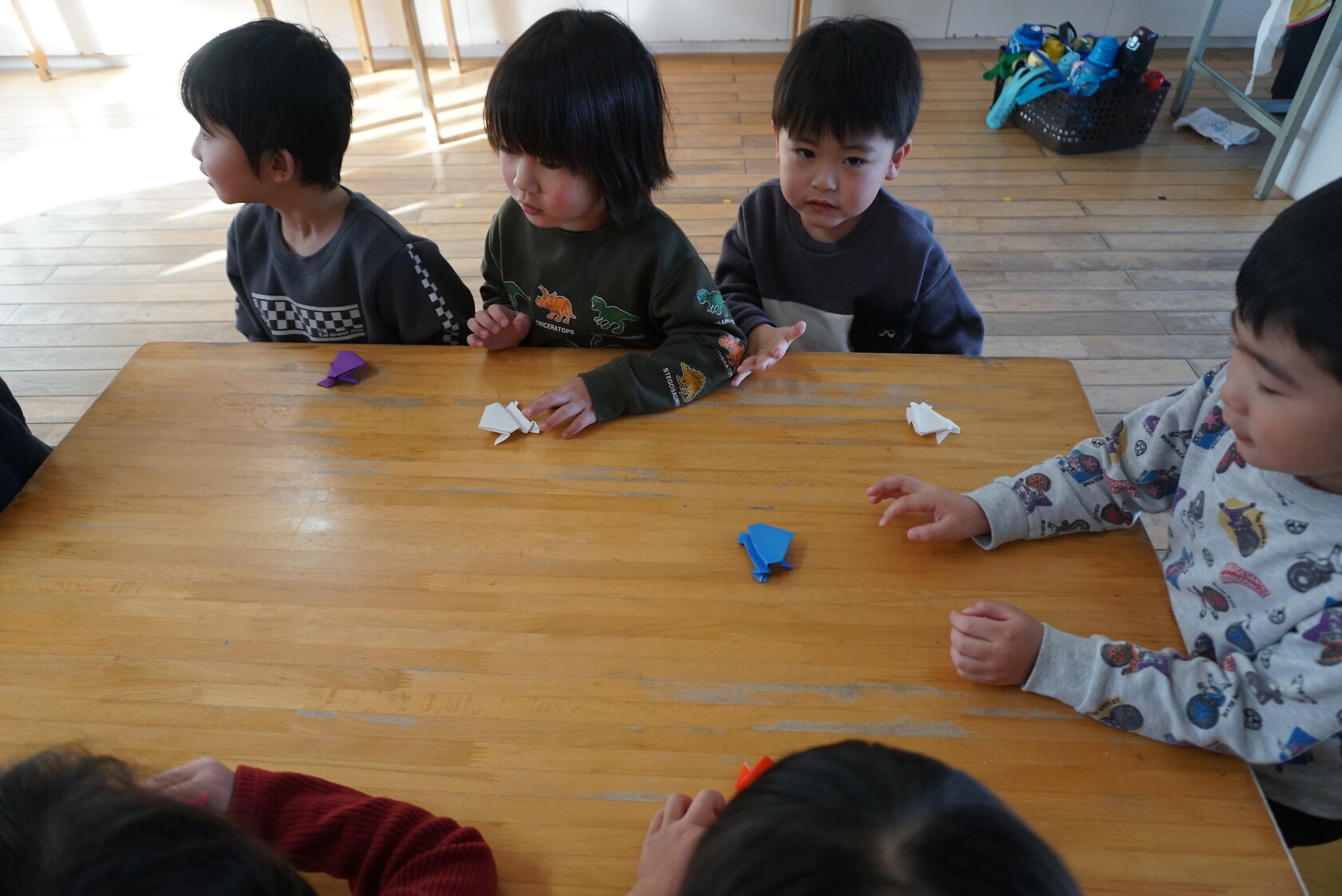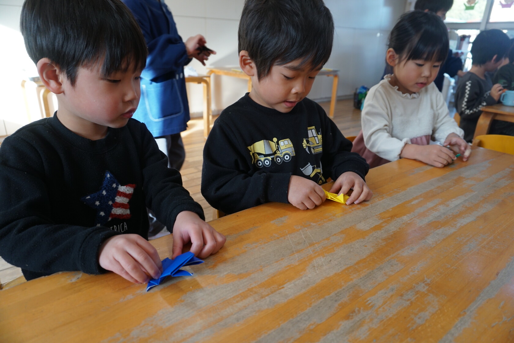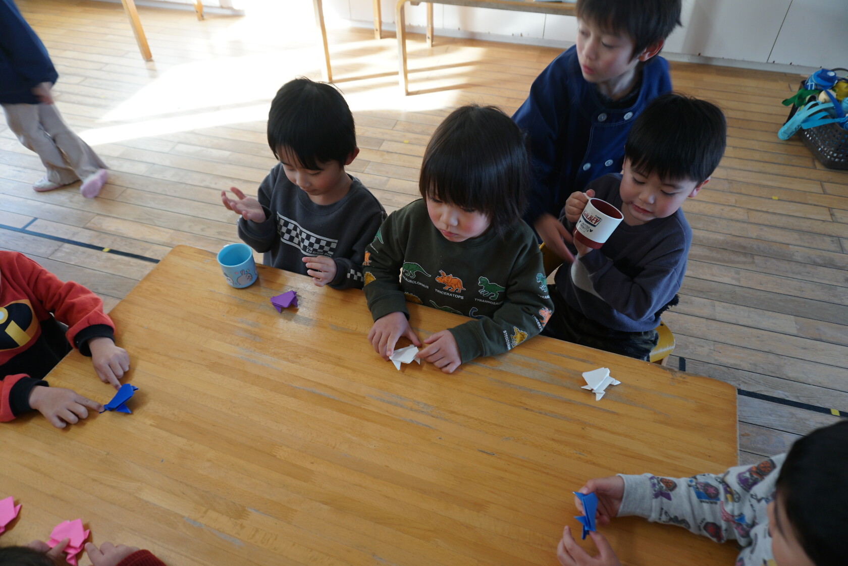また今日はひまわりぐみさんがすみれぐみさんにピョンピョンがえる🐸の折り紙を折ってくれました😊
