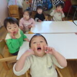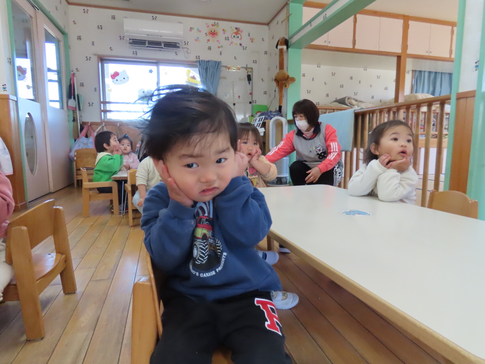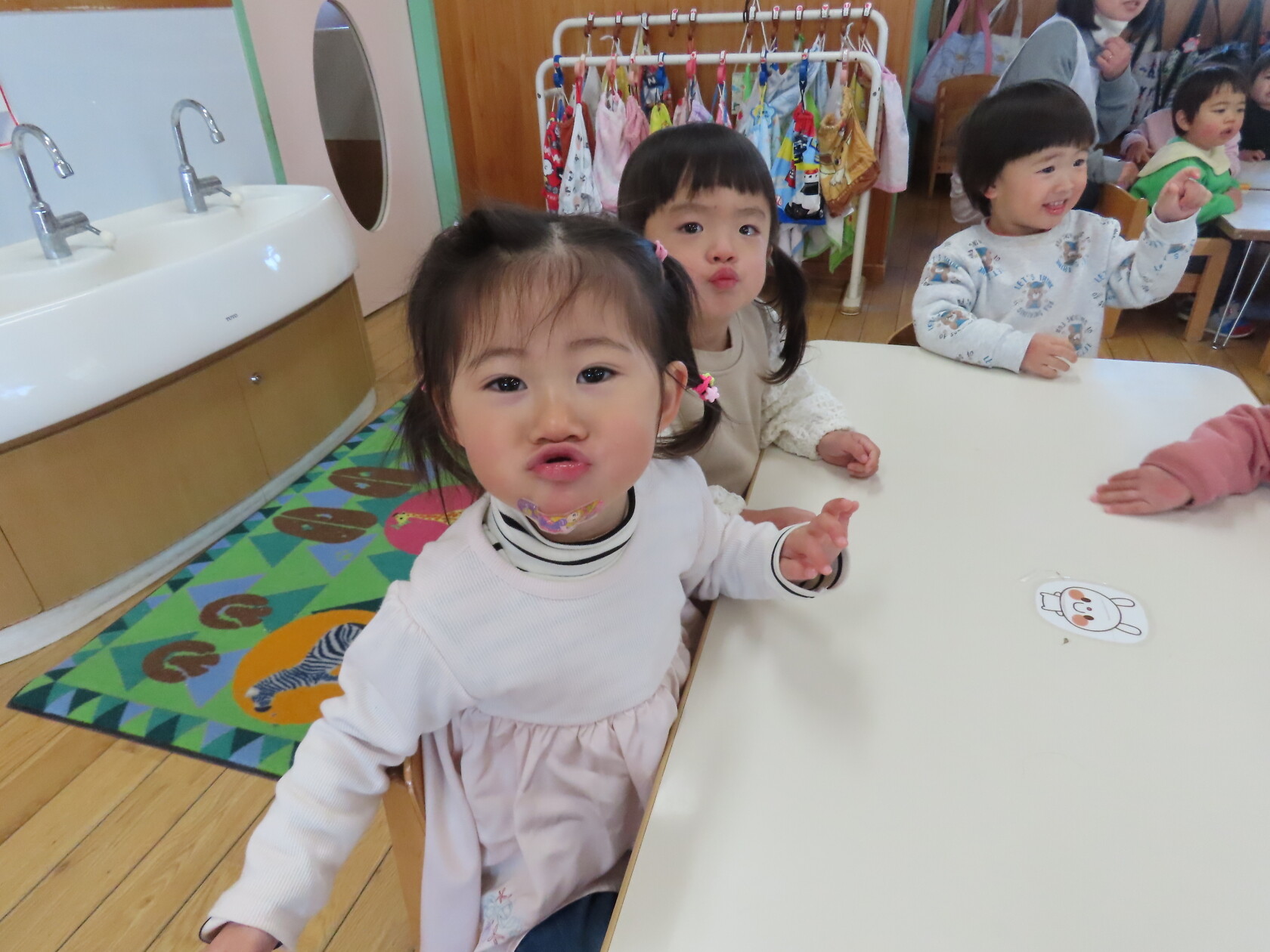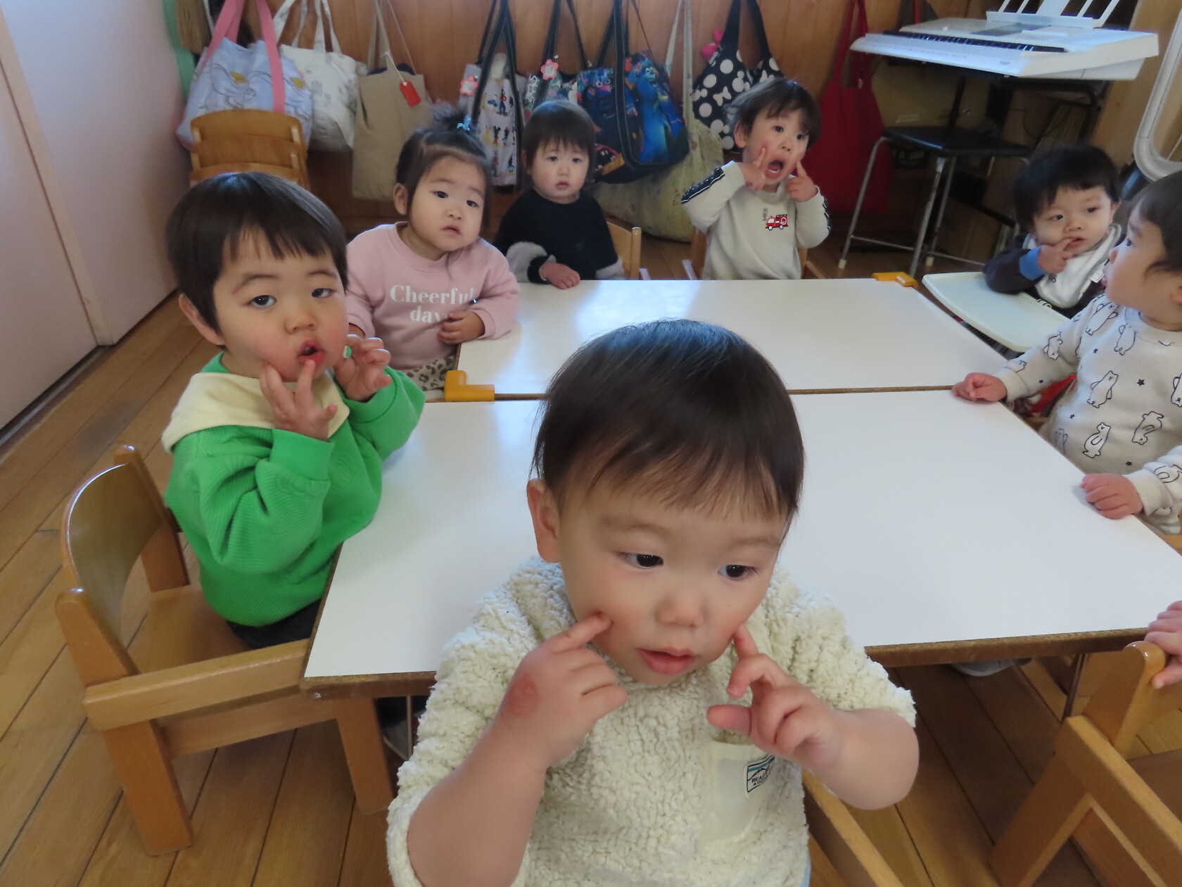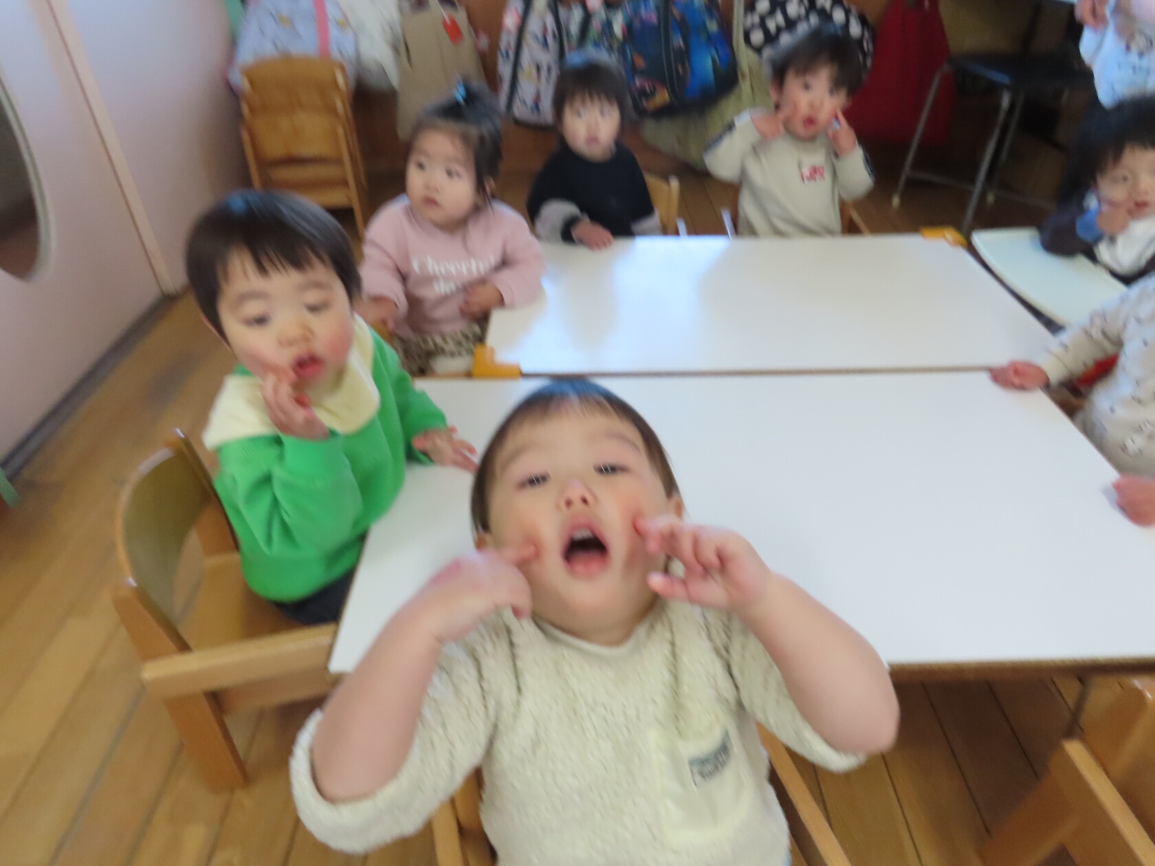今日のできごと(さくら・小規模さくら) 公開済み: 2025年2月20日更新: 2025年2月20日 「にらめっこ」の絵本が好きなさくら組さん✨今日は小規模さんと一緒に「あっぷっぷ~😚」の掛け声で、ほっぺをぷく~っとふくらませたり、あっかんべーをしたり、とってもかわいい表情が撮れました🎵 絵本を聞くのも上手になってきたので、お家でも沢山の絵本に触れてみてください📕😊