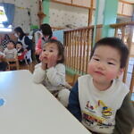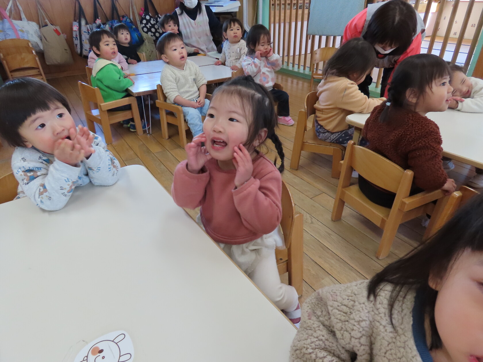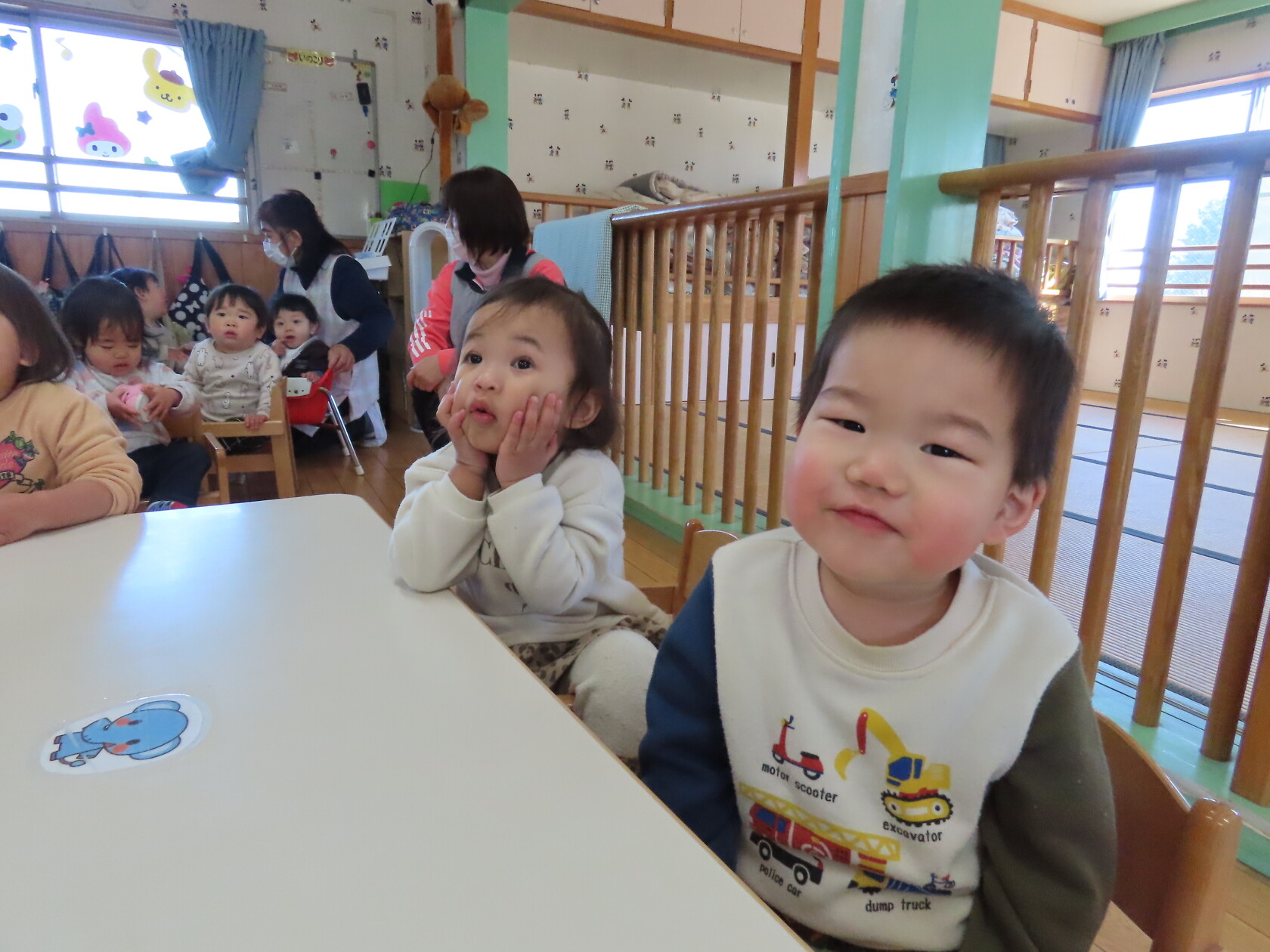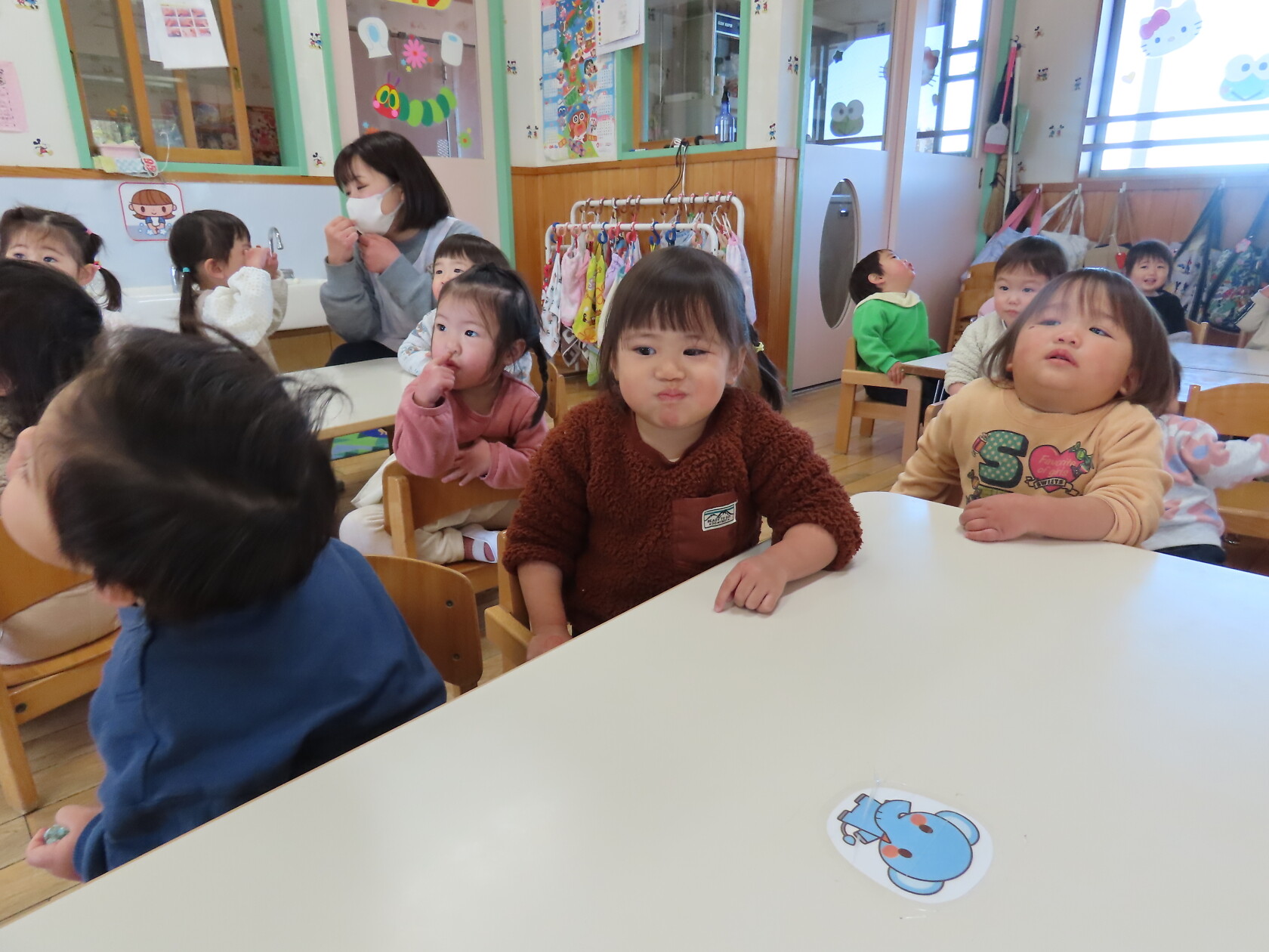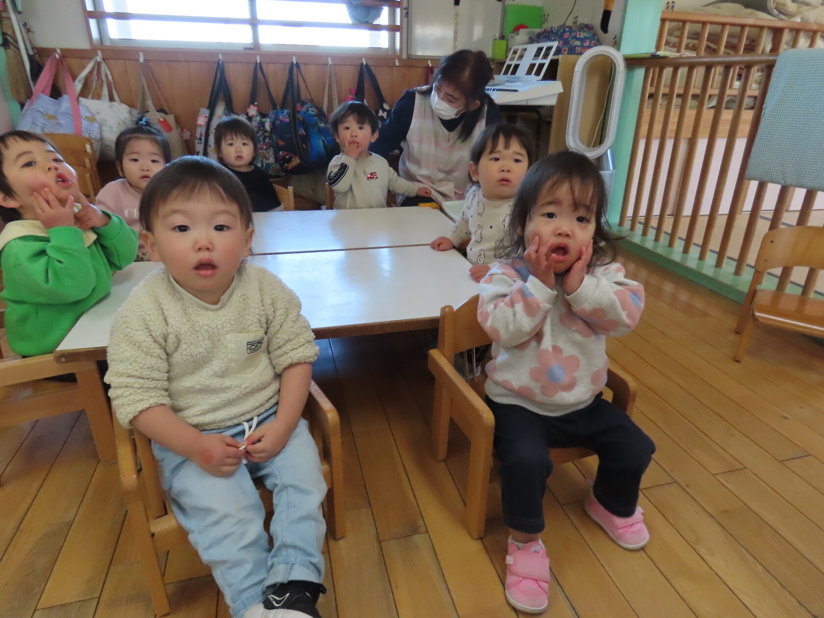 今日のできごと(さくら・小規模さくら) 公開済み: 2025年2月20日更新: 2025年2月20日 「にらめっこ」の絵本が好きなさくら組さん✨今日は小規模さんと一緒に「あっぷっぷ~😚」の掛け声で、ほっぺをぷく~っとふくらませたり、あっかんべーをしたり、とってもかわいい表情が撮れました🎵 絵本を聞くのも上手になってきたので、お家でも沢山の絵本に触れてみてください📕😊