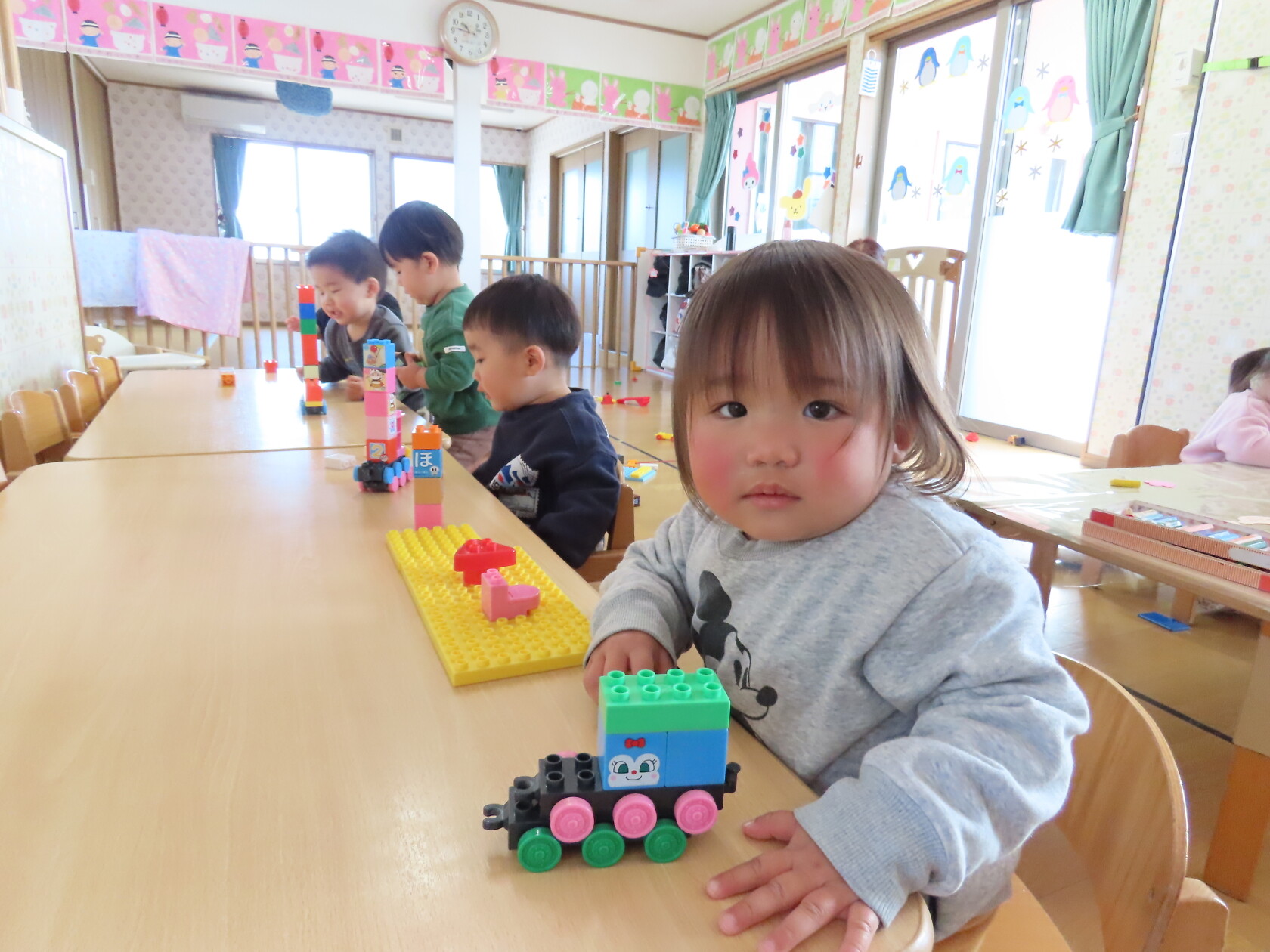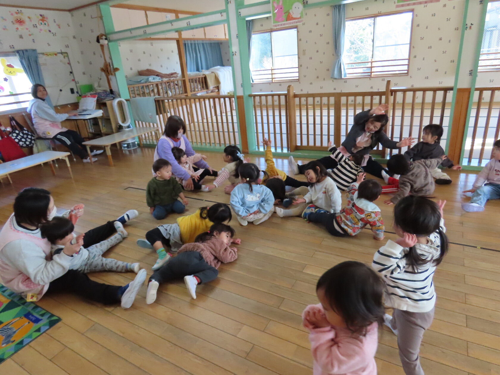 今日は、さくら組さんにちゅうりっぷ組が遊びに行きました✨みんなでソフト積み木や車のおもちゃで遊んだあと、ピアノの音に合わせて動物になって歩いたり、自転車や電車に […]