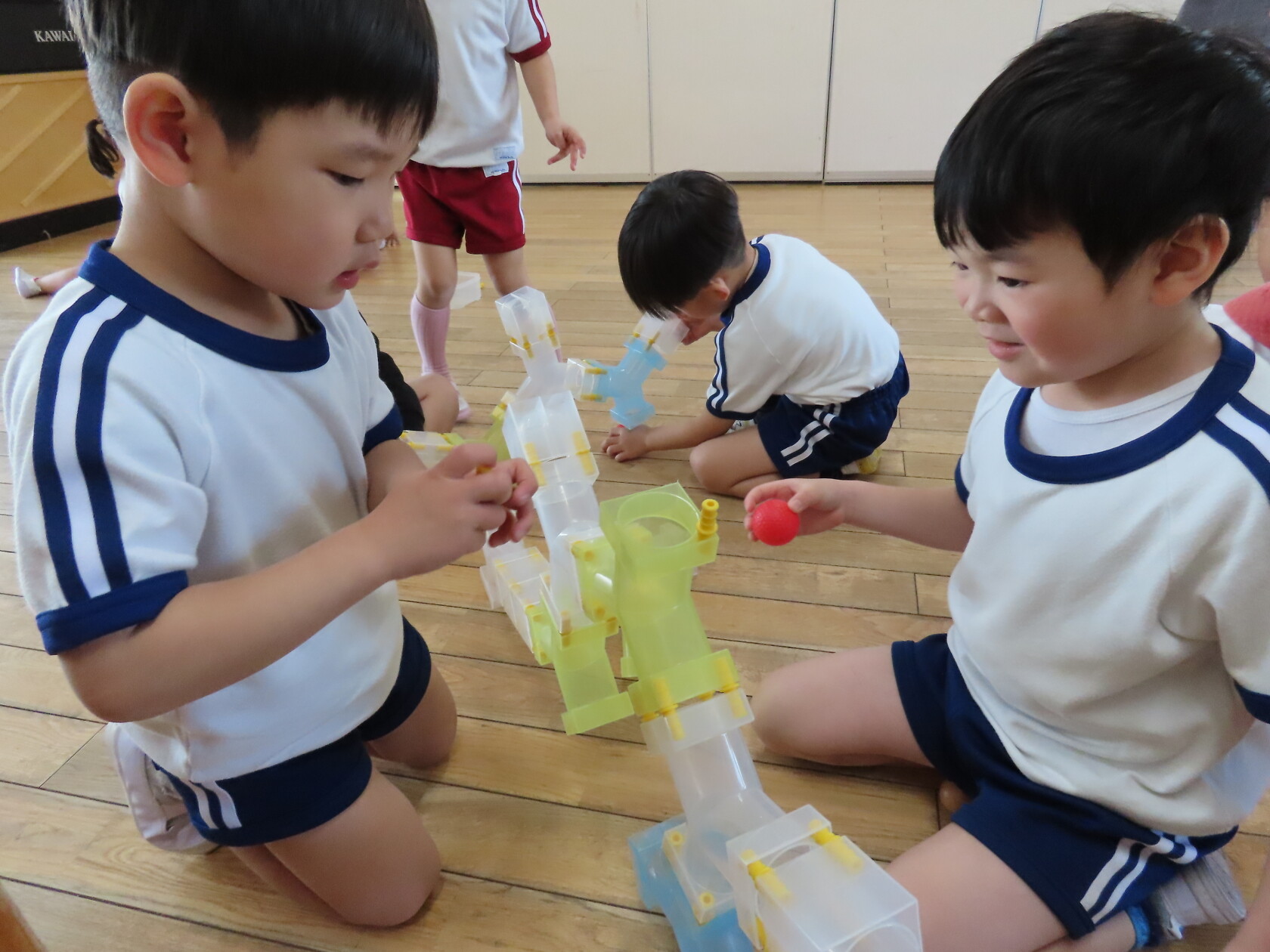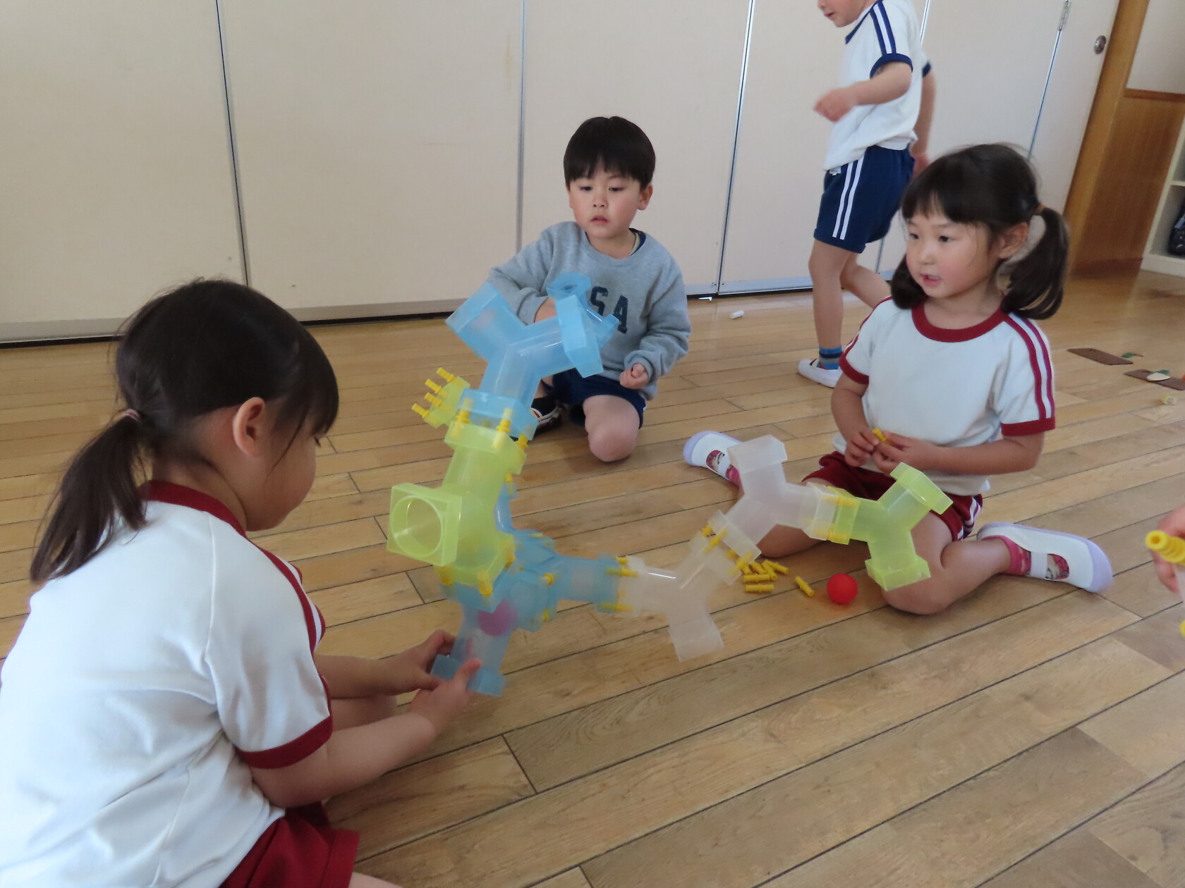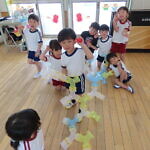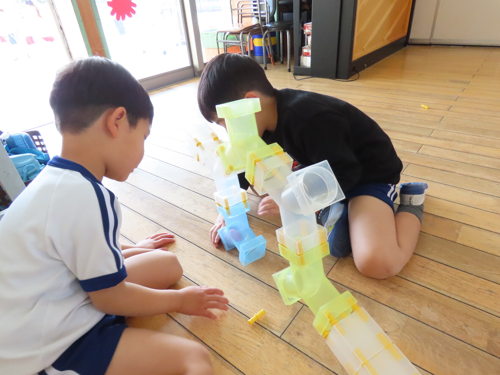トンネル迷路チームは、個々で組み立てていましたが「合体すると大きくなって楽しいよ👍」と伝えると、みんなで力を合わせて1つのトンネル迷路にしていました。