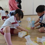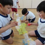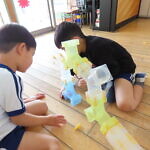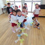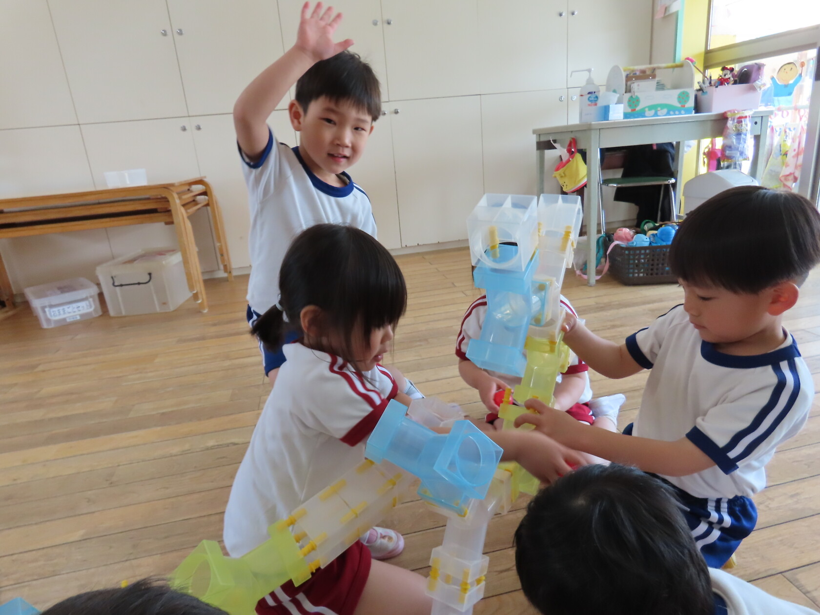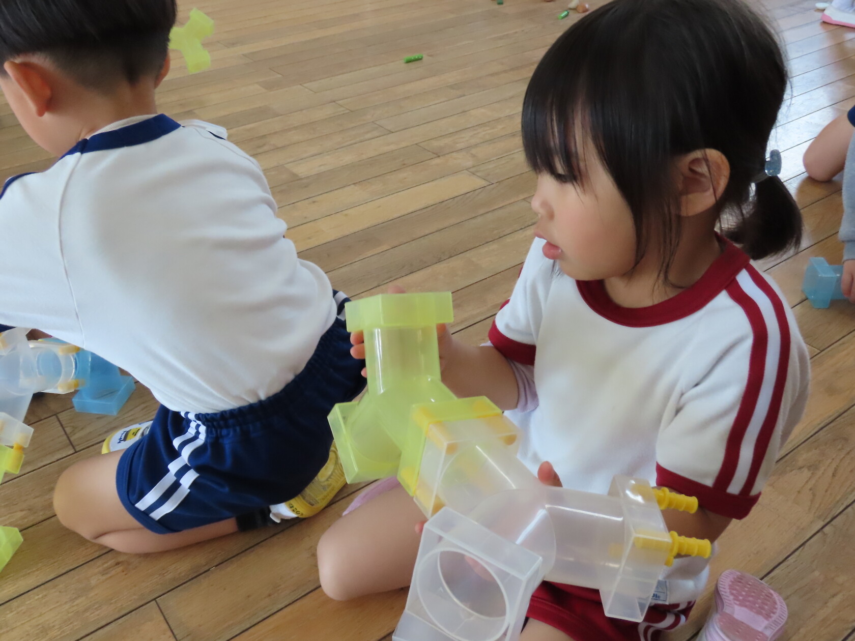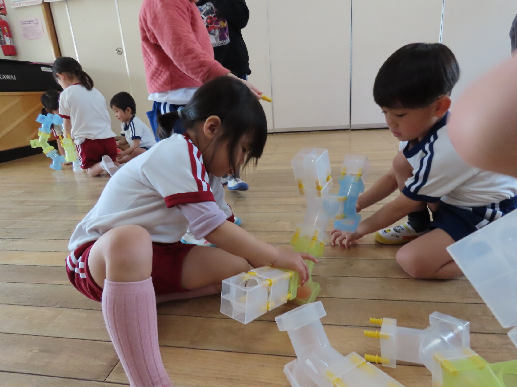 トンネル迷路チームは、個々で組み立てていましたが「合体すると大きくなって楽しいよ👍」と伝えると、みんなで力を合わせて1つのトンネル迷路にしていました。