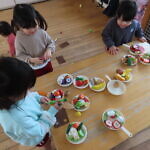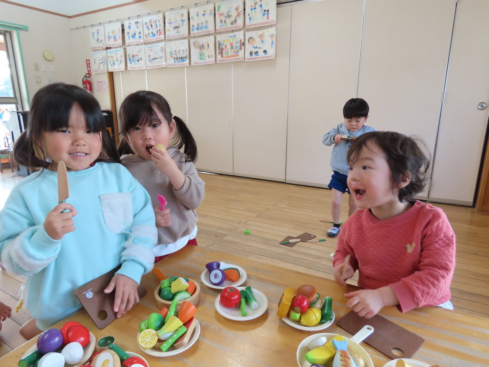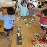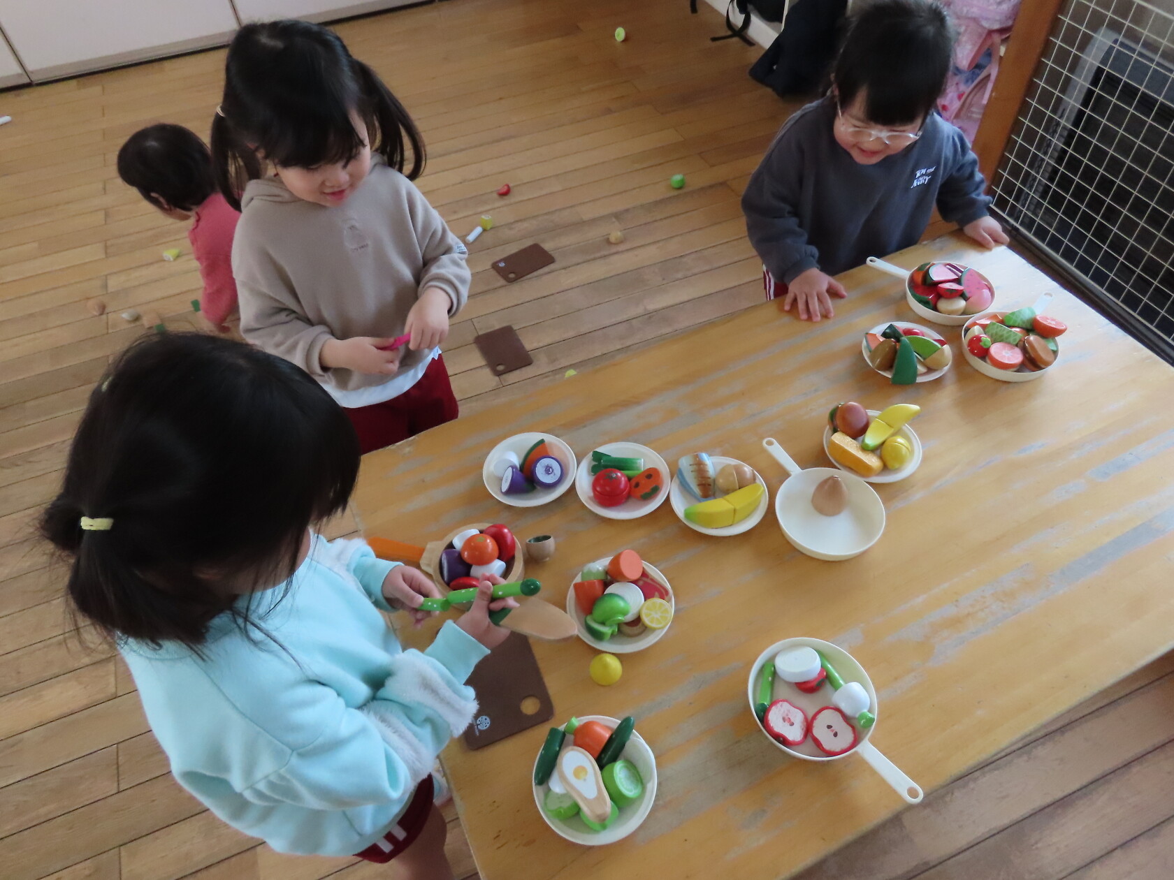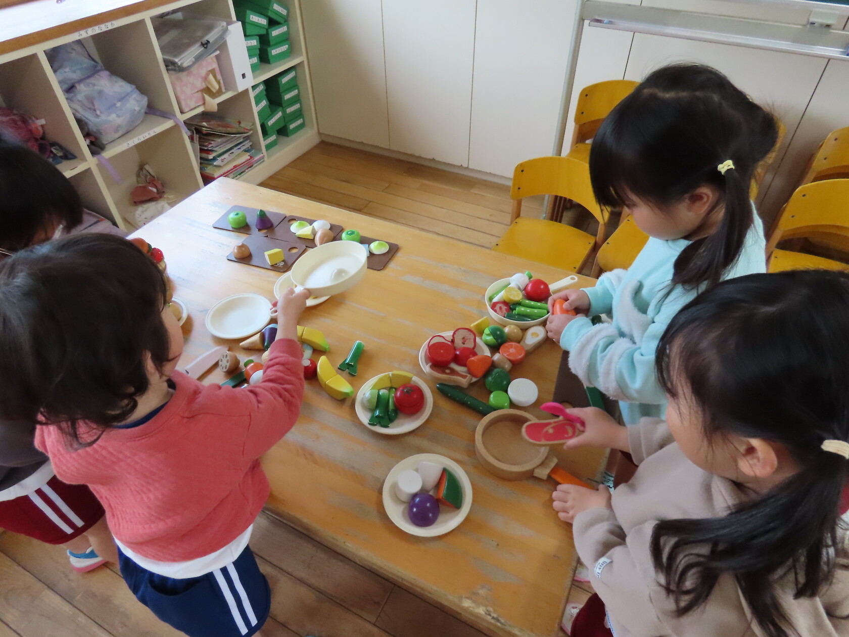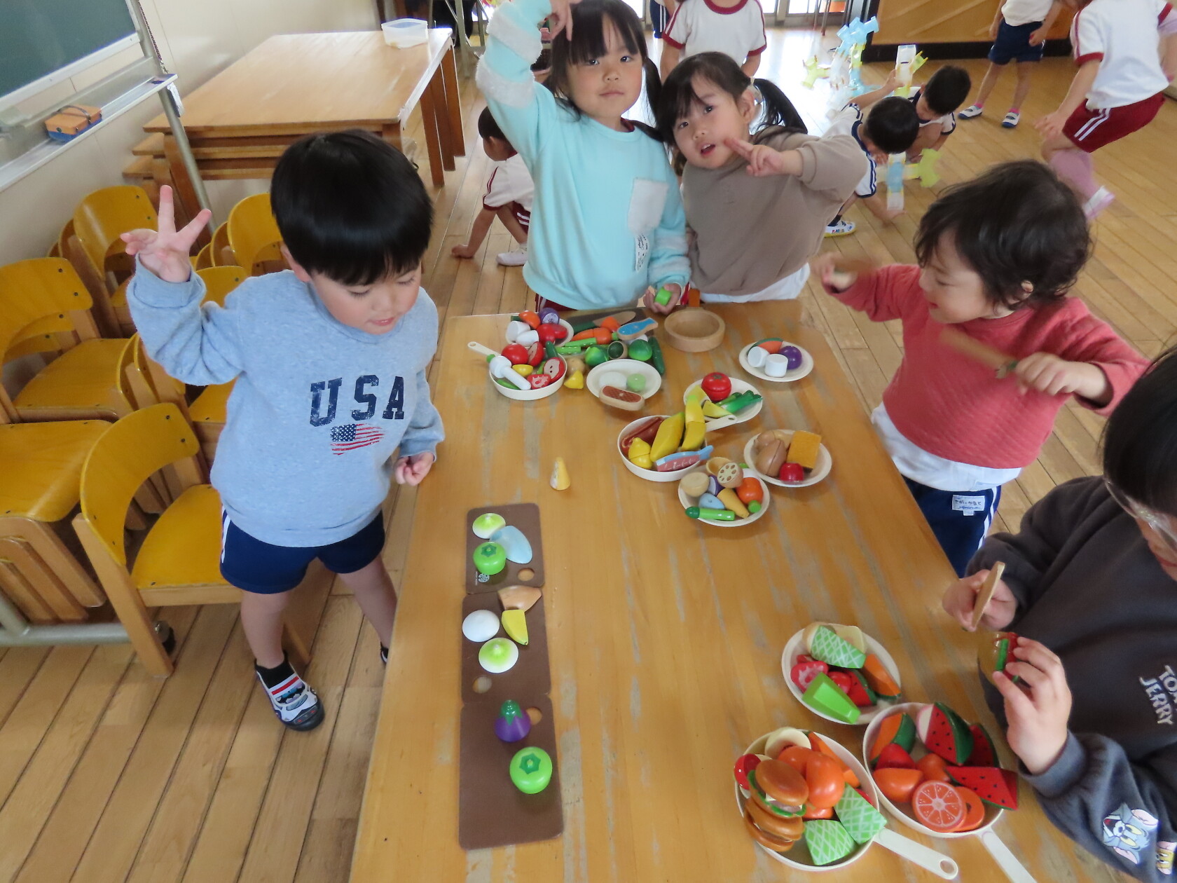 おままごとチームは、テーブルにお料理を並べてパーティーの準備😁🍩🍗