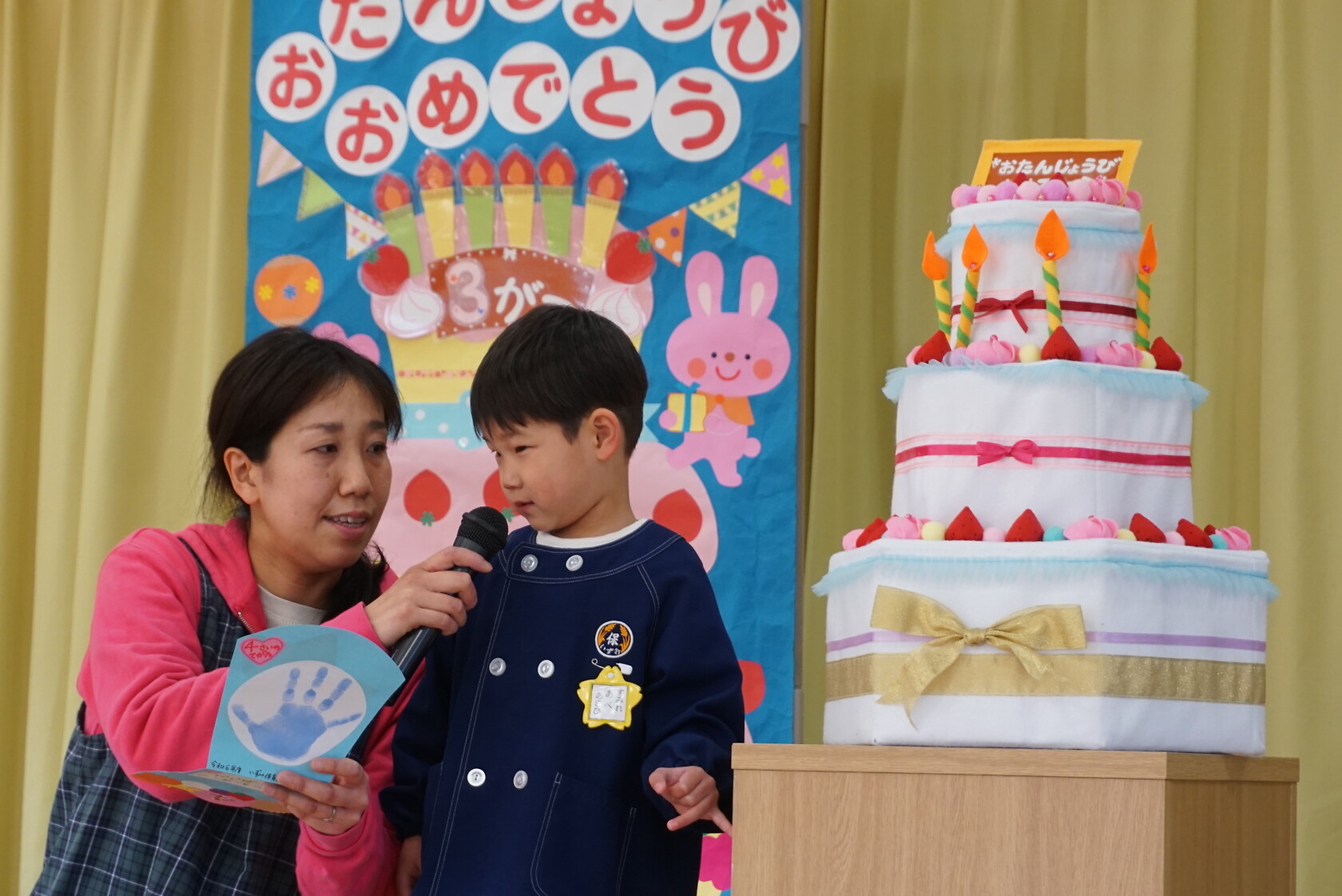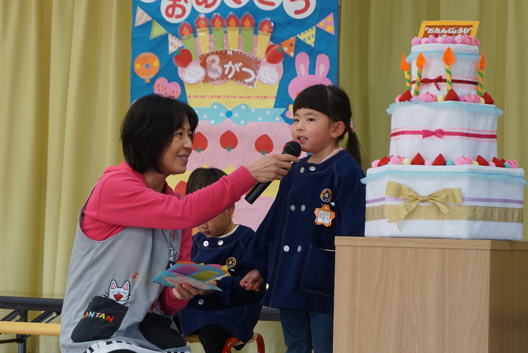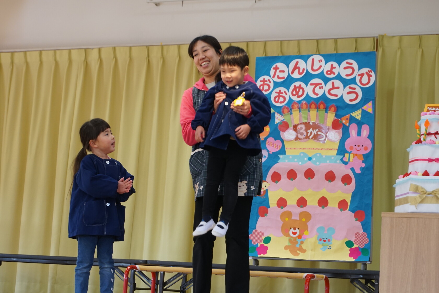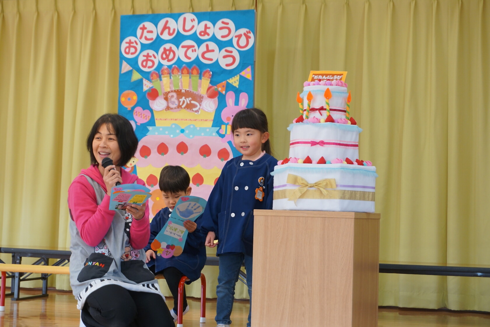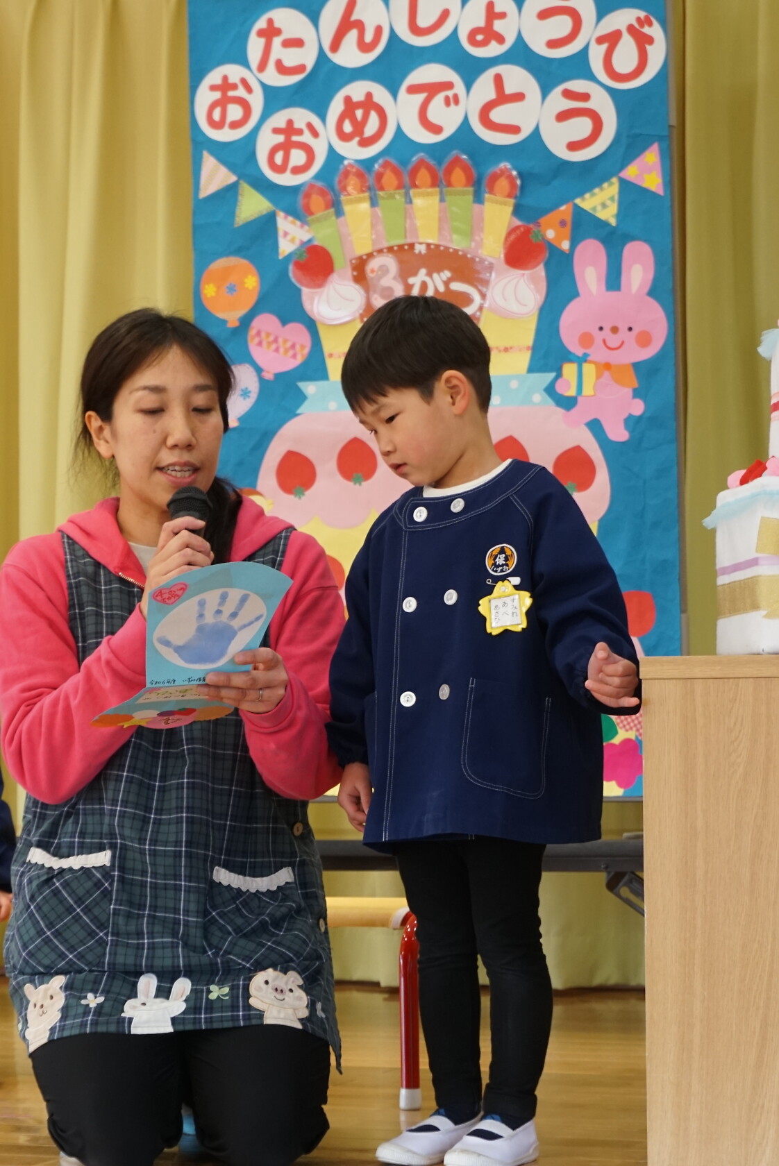 以上児お遊戯会 公開済み: 2025年3月18日更新: 2025年8月7日 今日は、3月生まれのお誕生会でした🍰 3月生まれの2名のお友だちは、ステージの上でしっかりと質問に答えてくれ、カードをもらいニッコリでした😆 歌のプレゼントは・・・ すみれぐみ「はる」「ぼくのミックスジュース」 ゆりぐみ「青い空はポケットさ」「かえでの木のうた」 ひまわりぐみ「ね」「さよならぼくたちのほいくえん」 を歌いました。どのクラスもお歌が上手になりましたね🌸 みんな4歳・5歳・6歳になりました!! 心も体も健やかに大きくなってくださいね💕✨