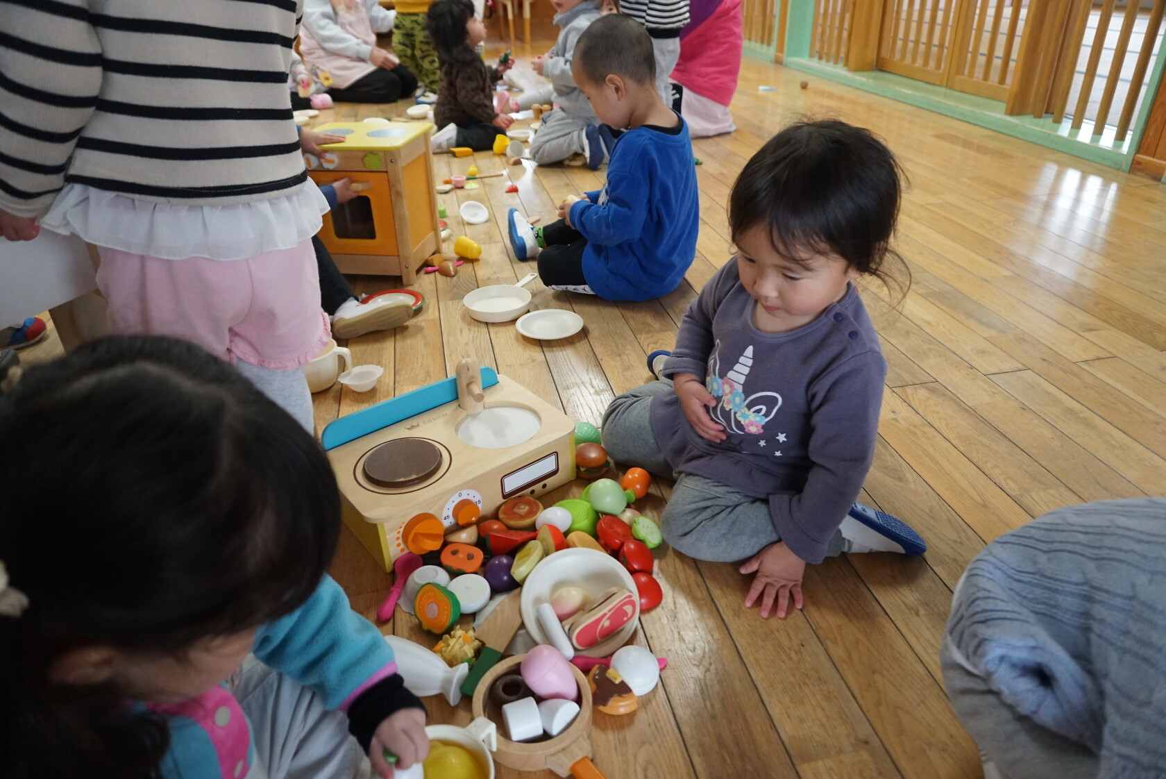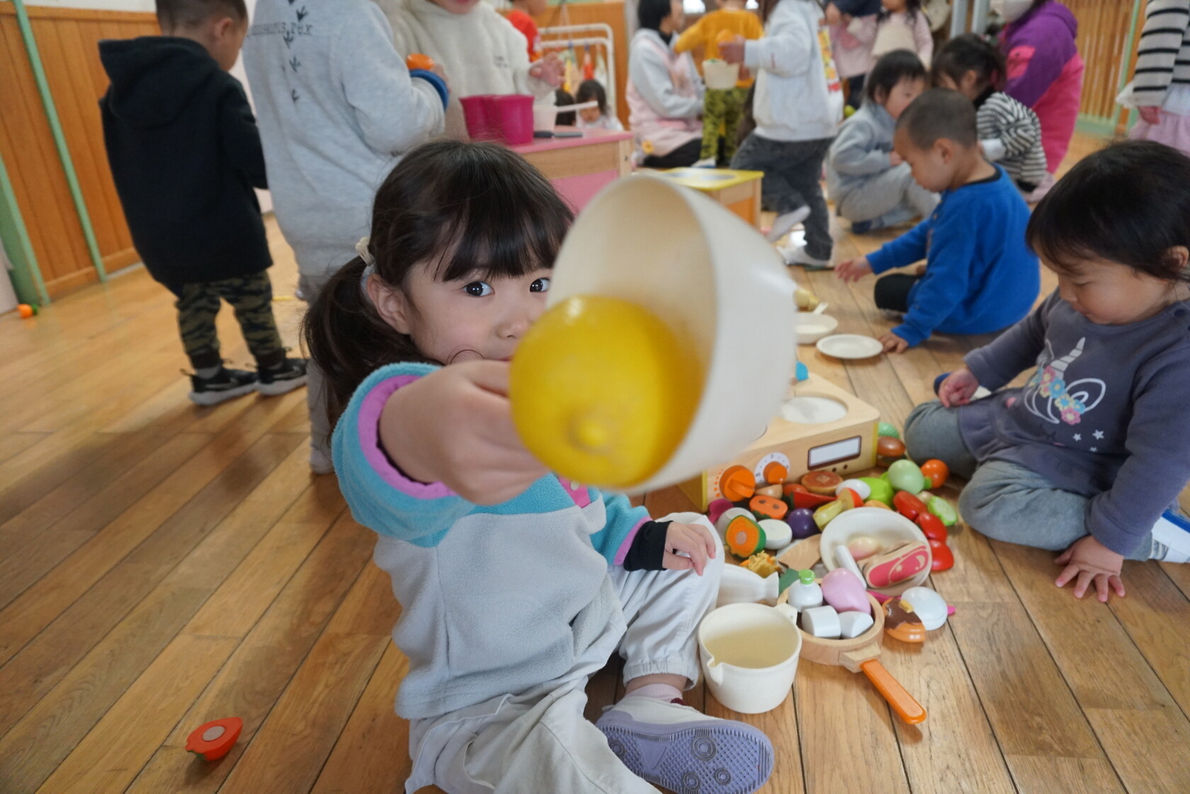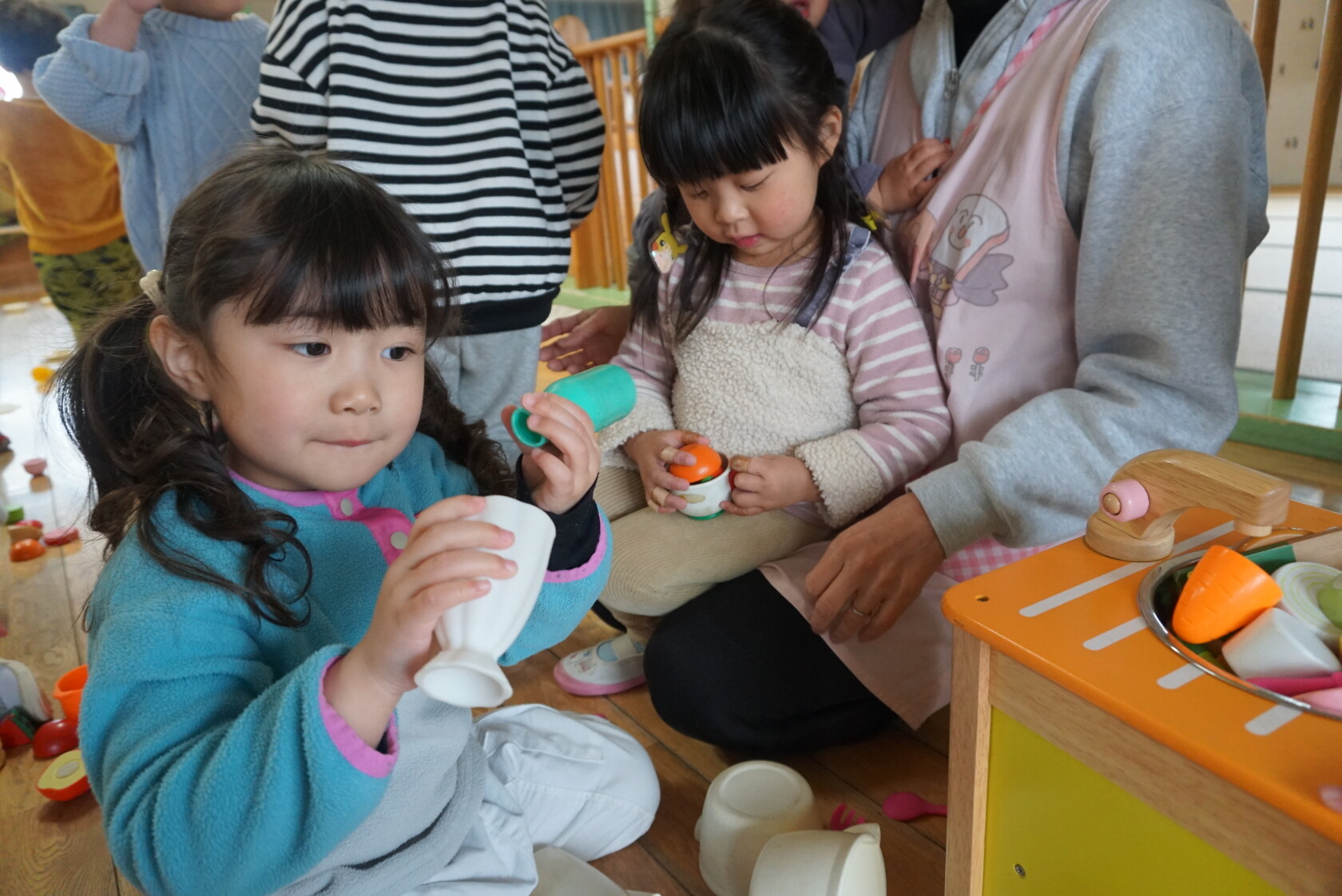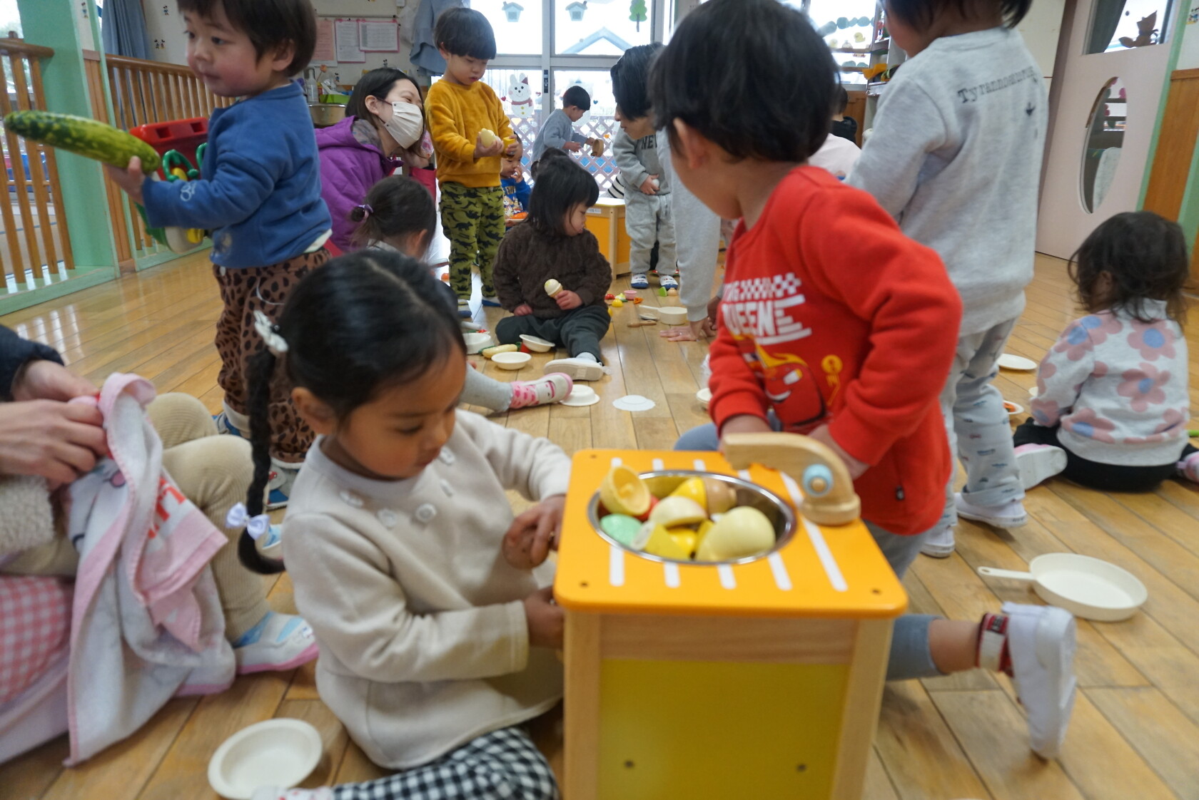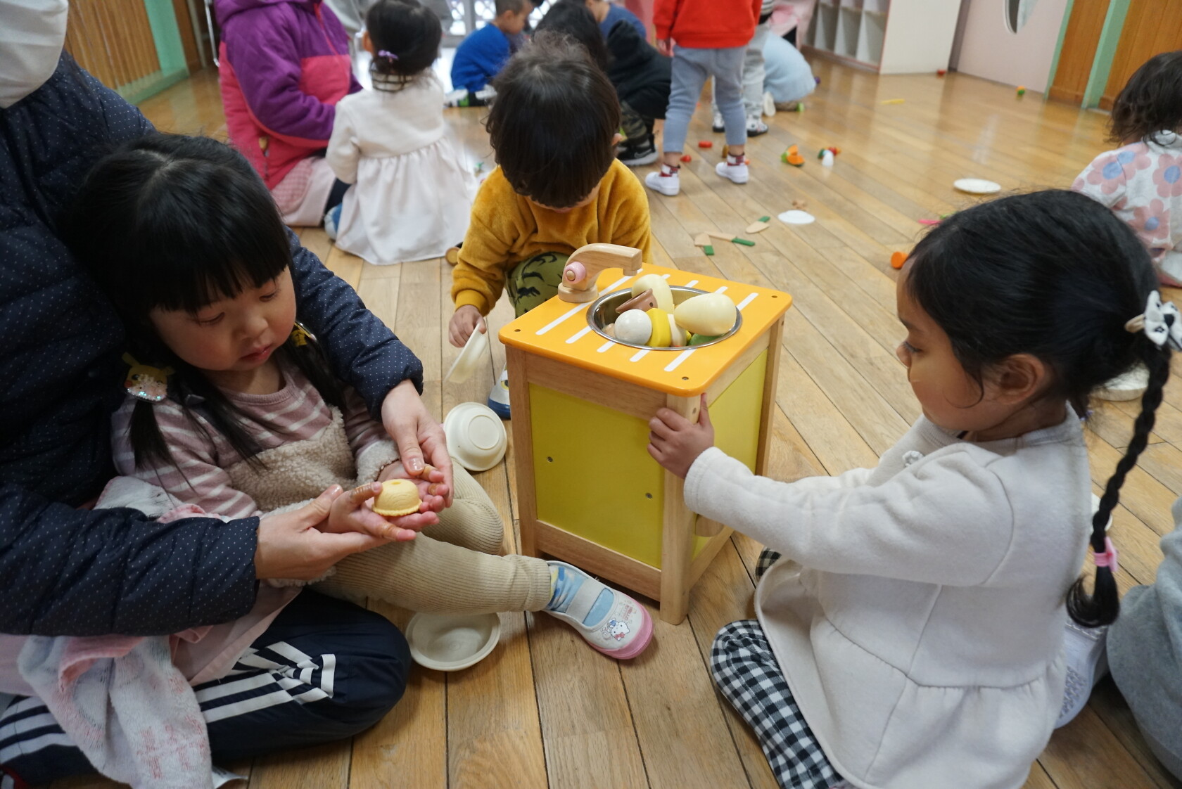 「ふしぎなポケット」のパネルシアターを真剣に見て、おままごと。「いらっしゃいませ~」コンロのおもちゃにフライパンを乗せて「あついから気をつけてね」など、楽しげな会話がたくさん聞こえてきました😁