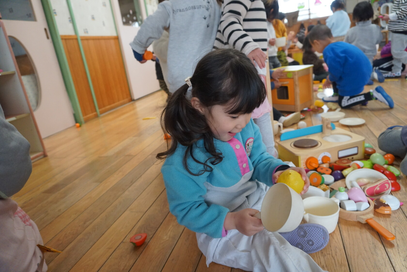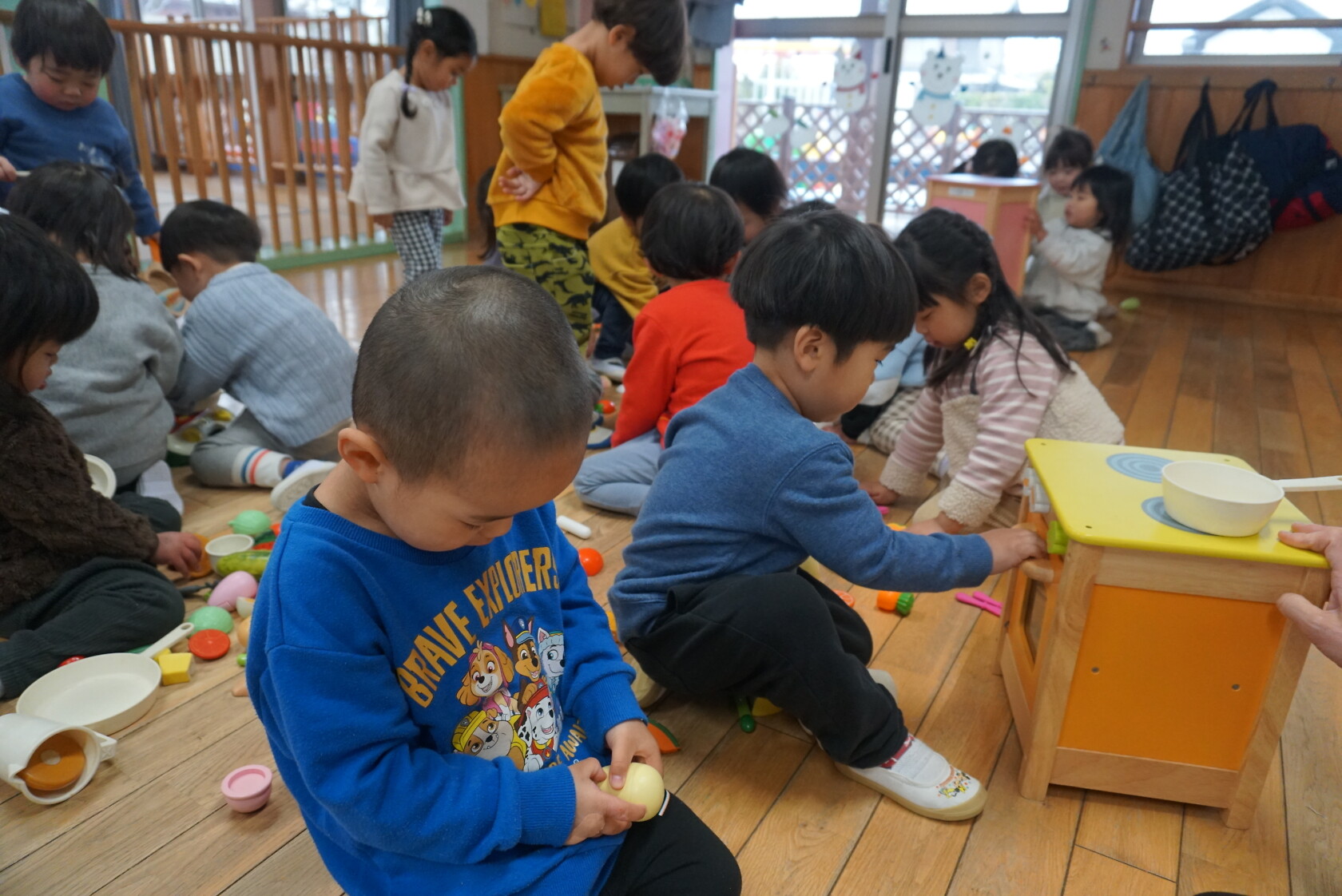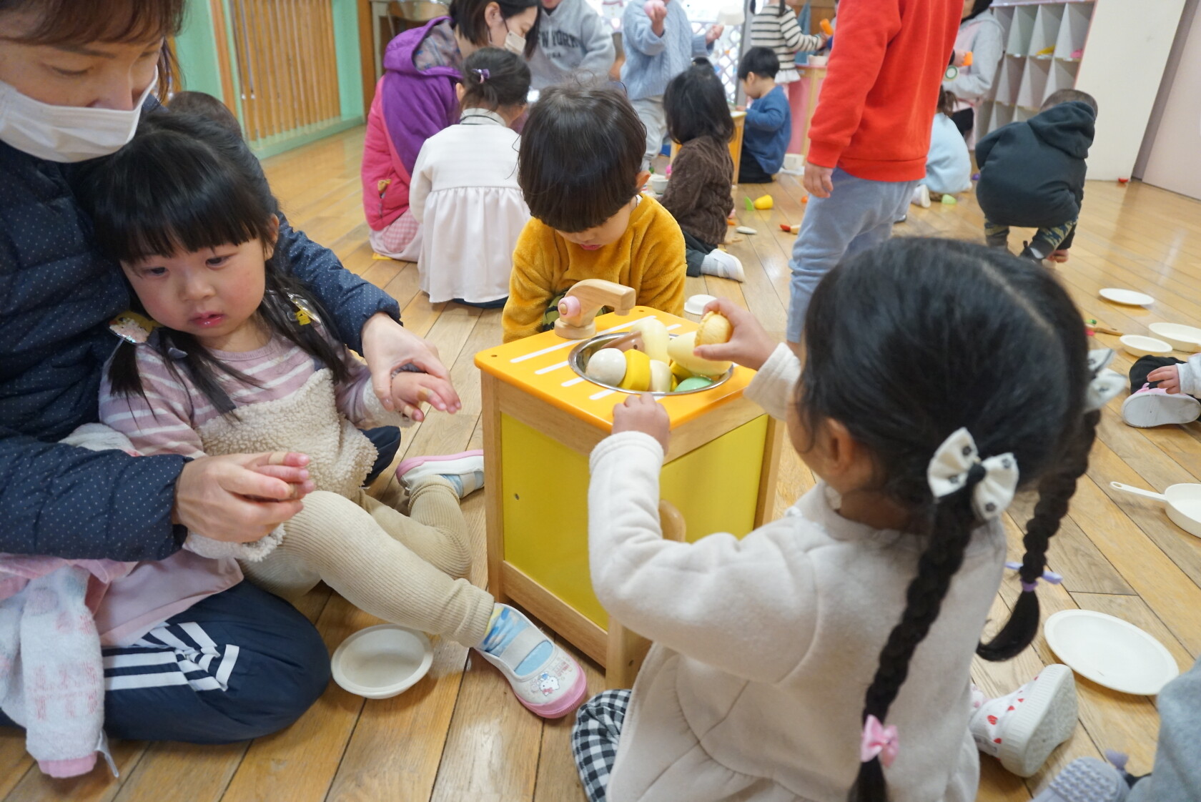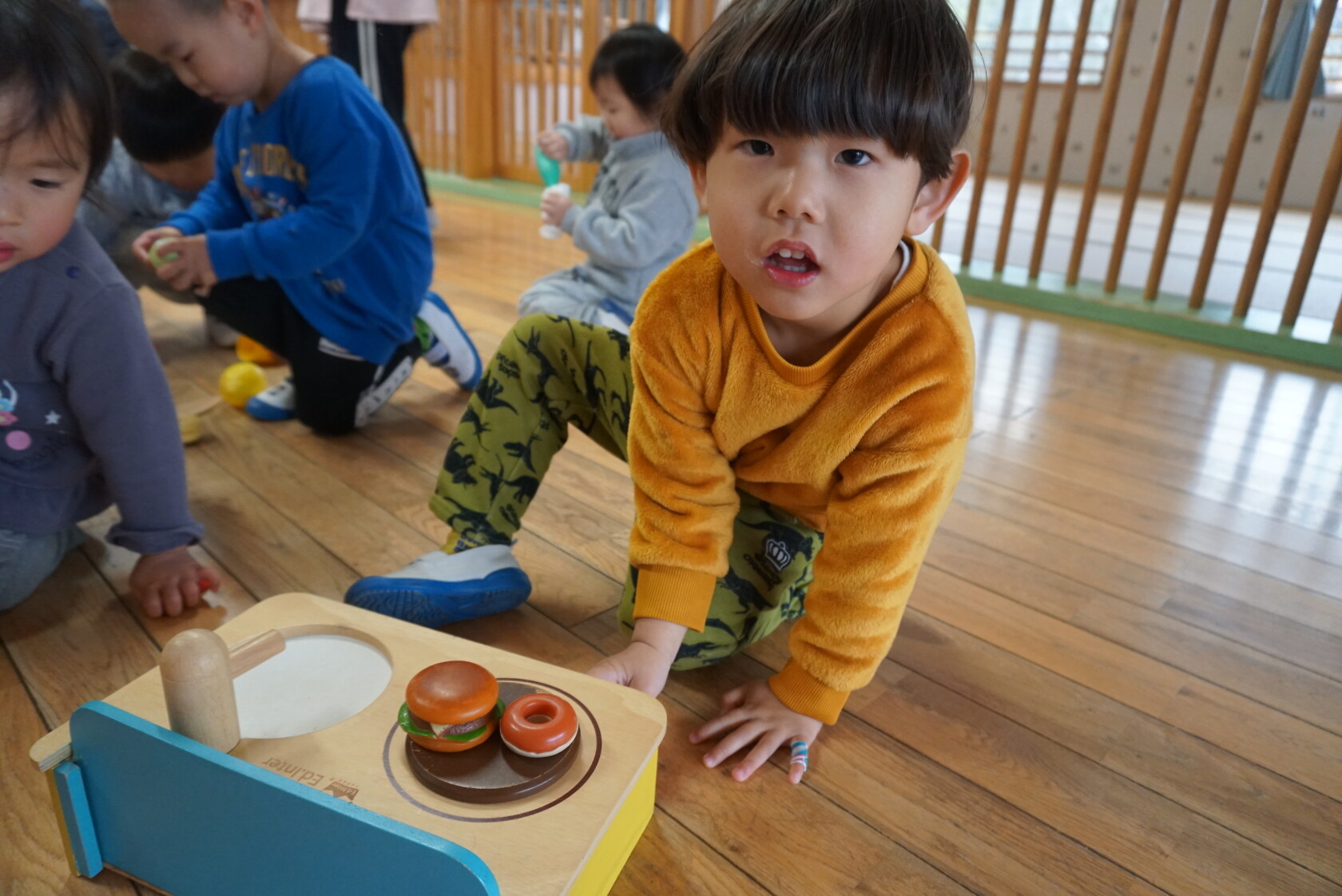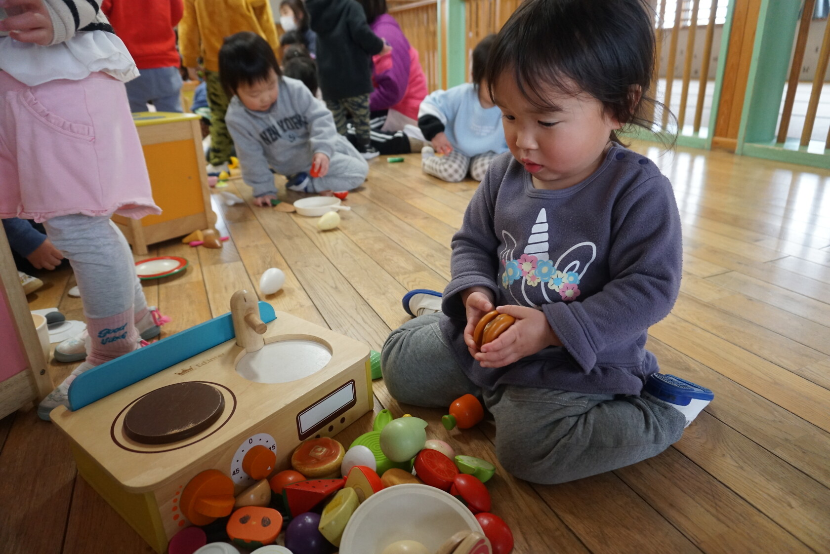 「ふしぎなポケット」のパネルシアターを真剣に見て、おままごと。「いらっしゃいませ~」コンロのおもちゃにフライパンを乗せて「あついから気をつけてね」など、楽しげな会話がたくさん聞こえてきました😁