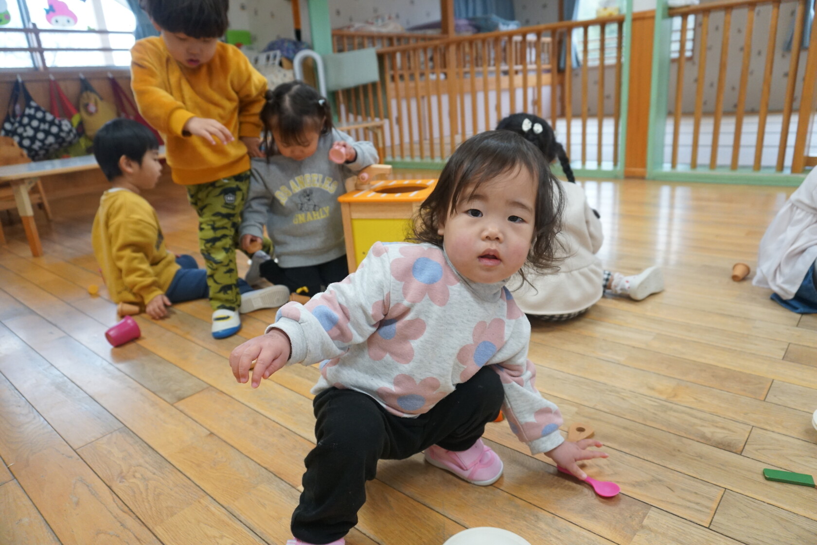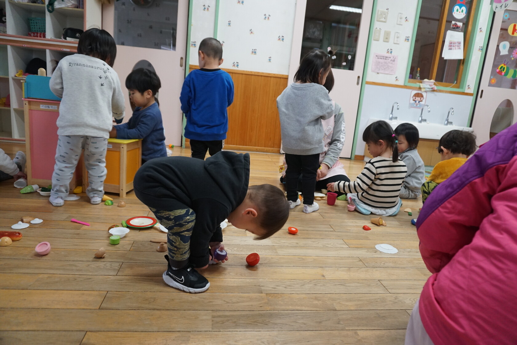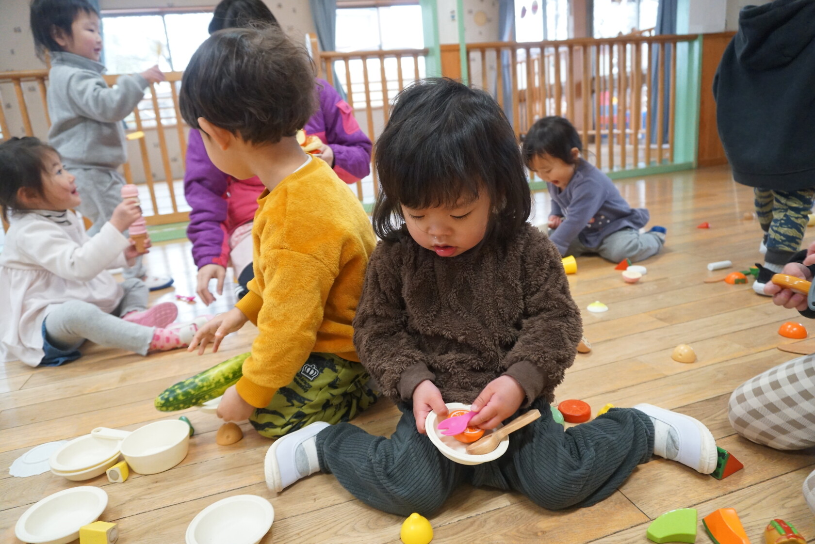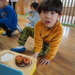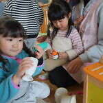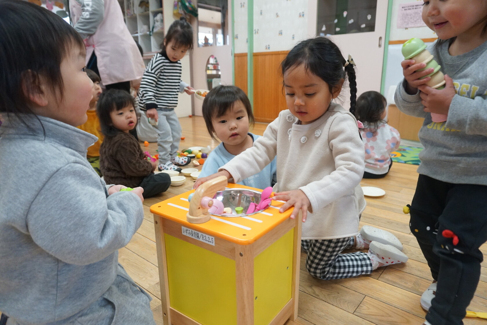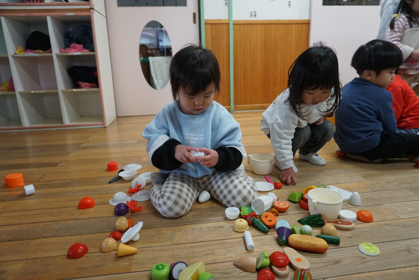 「ふしぎなポケット」のパネルシアターを真剣に見て、おままごと。「いらっしゃいませ~」コンロのおもちゃにフライパンを乗せて「あついから気をつけてね」など、楽しげな会話がたくさん聞こえてきました😁