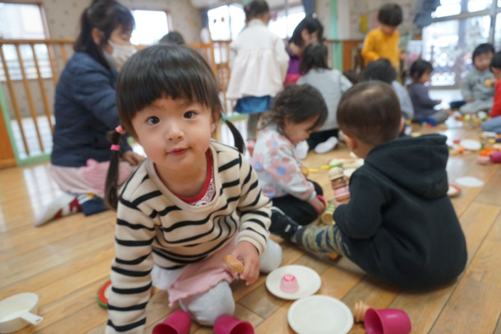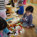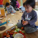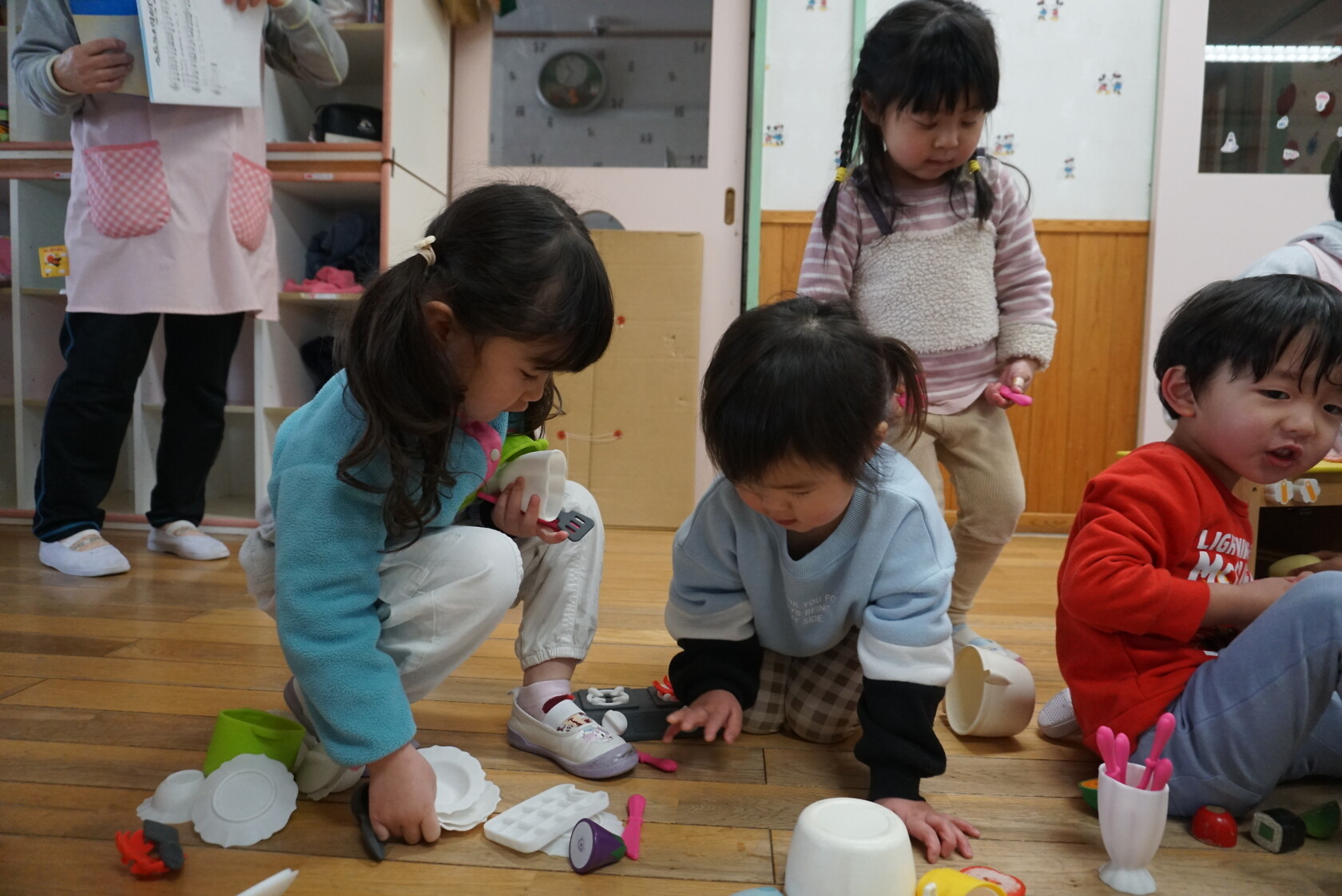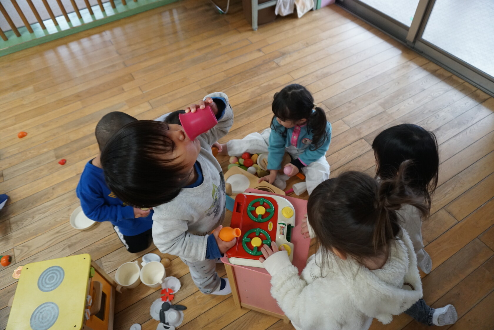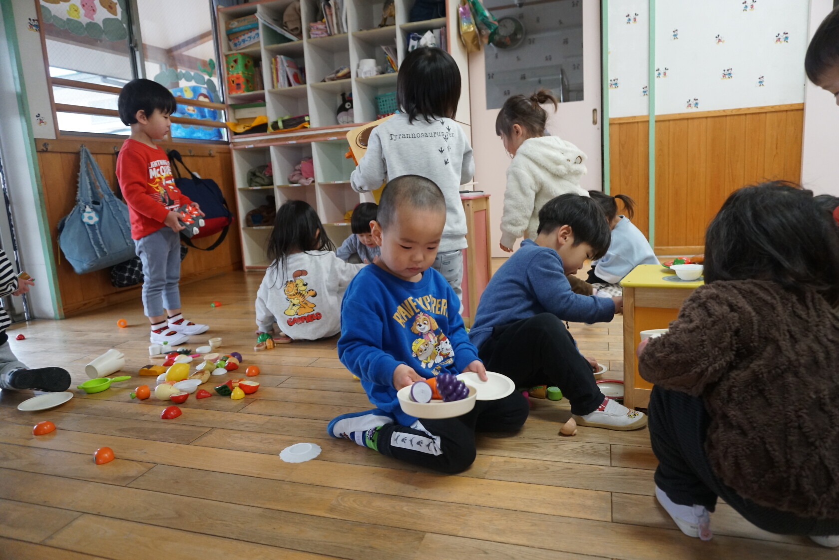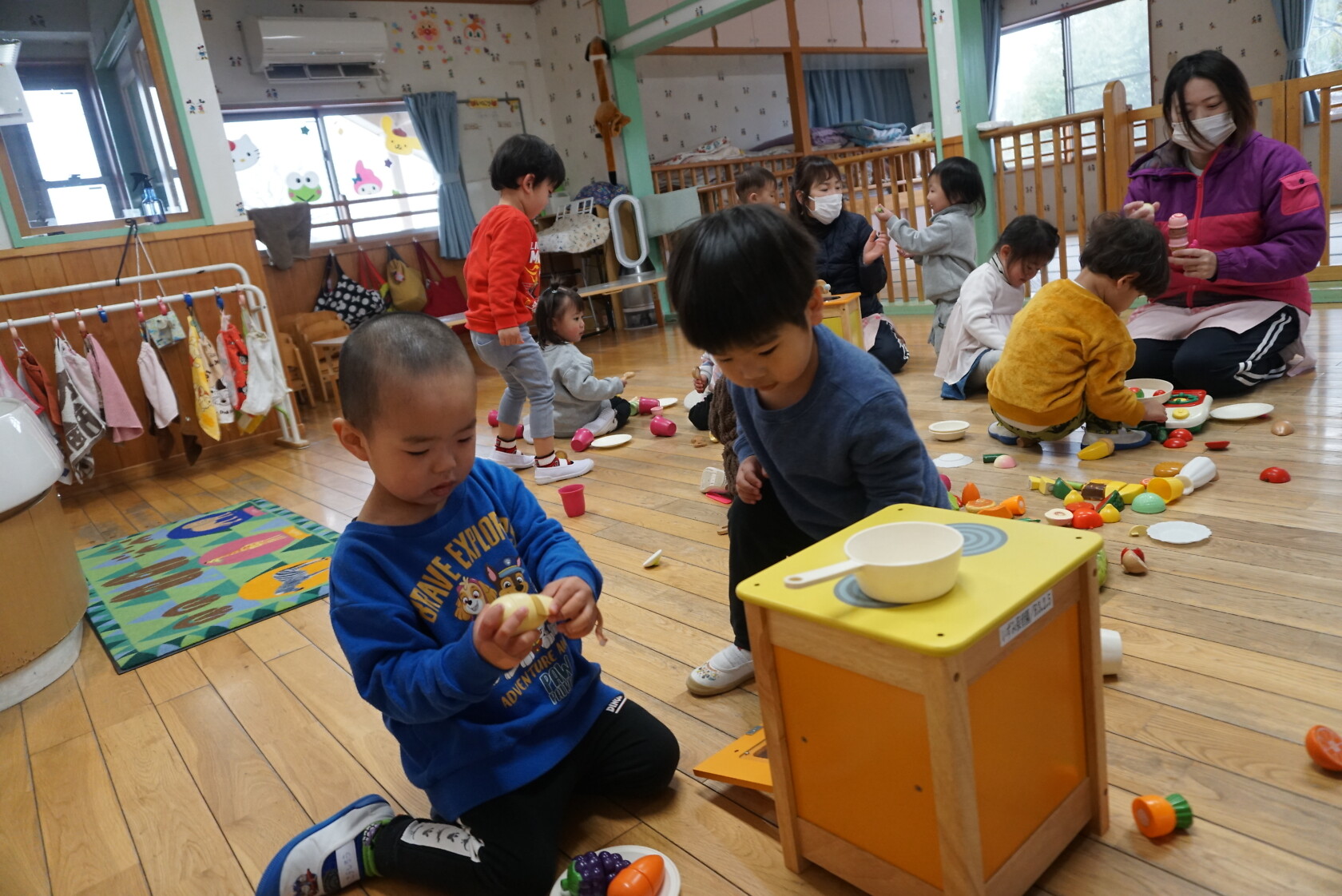 「ふしぎなポケット」のパネルシアターを真剣に見て、おままごと。「いらっしゃいませ~」コンロのおもちゃにフライパンを乗せて「あついから気をつけてね」など、楽しげな会話がたくさん聞こえてきました😁